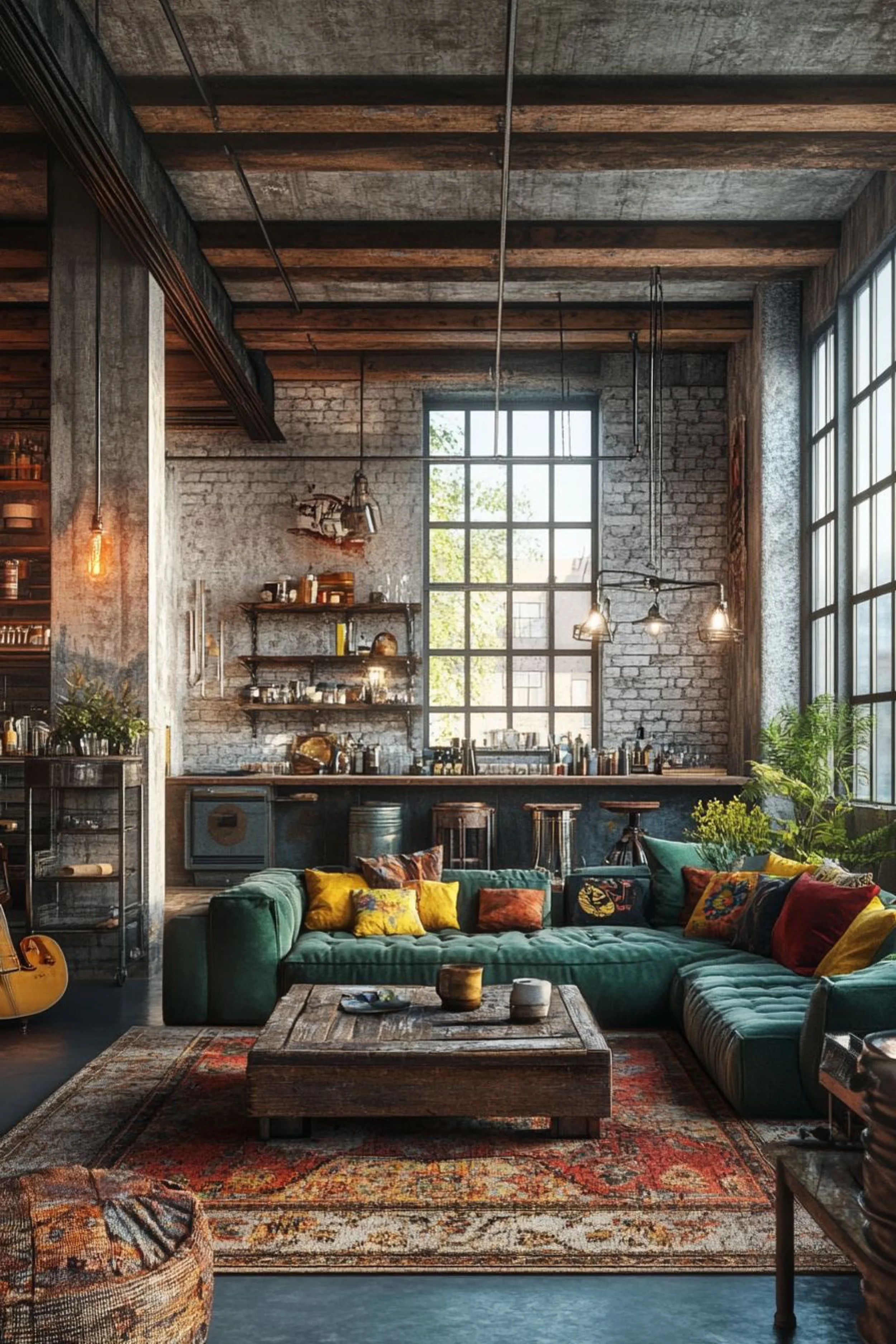 This loft is a color lover’s industrial dream, where raw surfaces meet saturated comfort. Concrete, brick, and exposed beams keep the structure honest, but the living zone is all about plushness: a deep green velvet sectional that looks like a jewel dropped into the room. The rug underneath brings heat and pattern, tying the space together with reds, oranges, and worn vintage tones that make everything feel instantly established. The kitchen wall is practical and slightly gritty, with open shelving and a bar ledge that feels like a creative studio, stocked for friends, music, and late night snacks. Warm pendant lights add a soft amber glow that plays beautifully against the velvet and the textured brick. Little details, like a guitar leaning nearby and layered pillows in gold and spice, keep the mood personal. It is not minimalist, but it is controlled. The space feels expressive, artistic, and comfortable, like an apartment that belongs to someone who actually lives and creates in it.