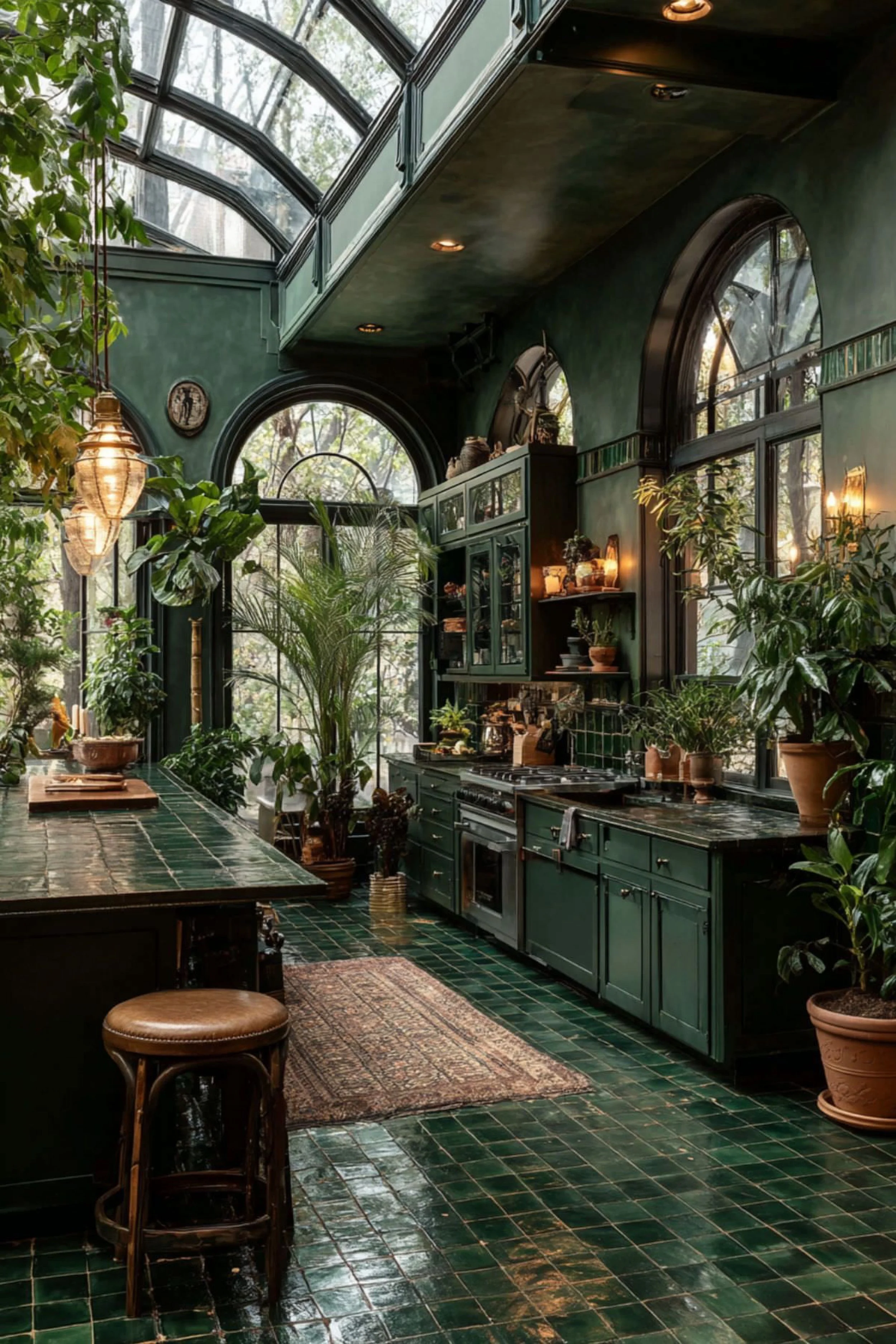 The long wood table brings in communal energy, like a space made for kneading dough, slicing fruit, and lingering over coffee. The palette is deep and earthy: charcoal, forest green, aged wood, and warm brass tones. It feels like a European conservatory kitchen meets a hidden garden cafe. The result is intimate, cinematic, and deeply inviting without needing anything flashy.