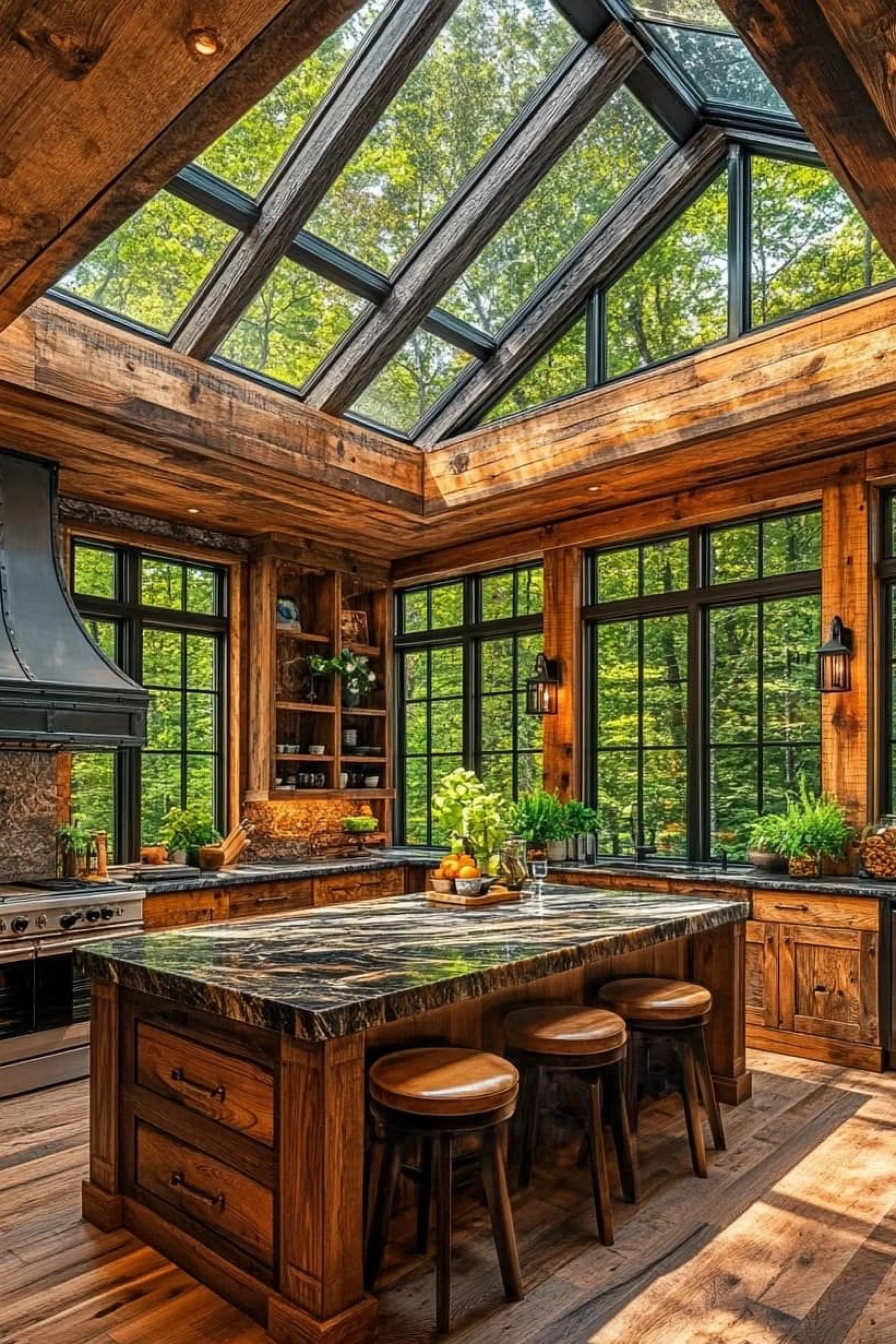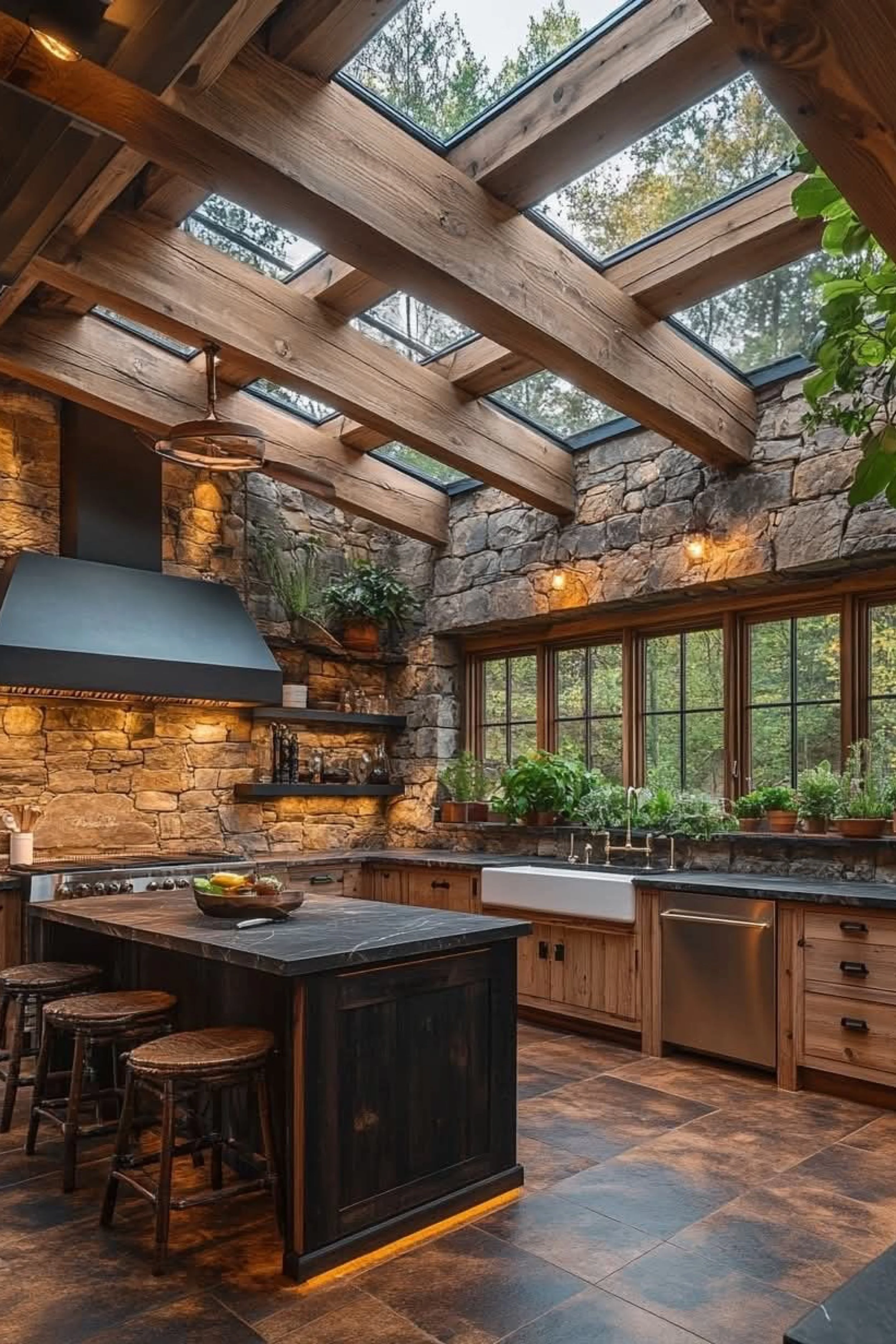 This solarium kitchen brings lodge luxury into a bright, skylit envelope. Massive wood beams stretch across the ceiling, framing a row of skylights that pull the outdoors right into the room. Stone walls wrap the space with a fortress like coziness, but the light keeps it open and airy. The centerpiece is a bold black island with a stone top, grounding the room like a statement piece of furniture rather than just cabinetry. Around it, warm wood lower cabinets and a classic apron sink keep the vibe practical and welcoming.