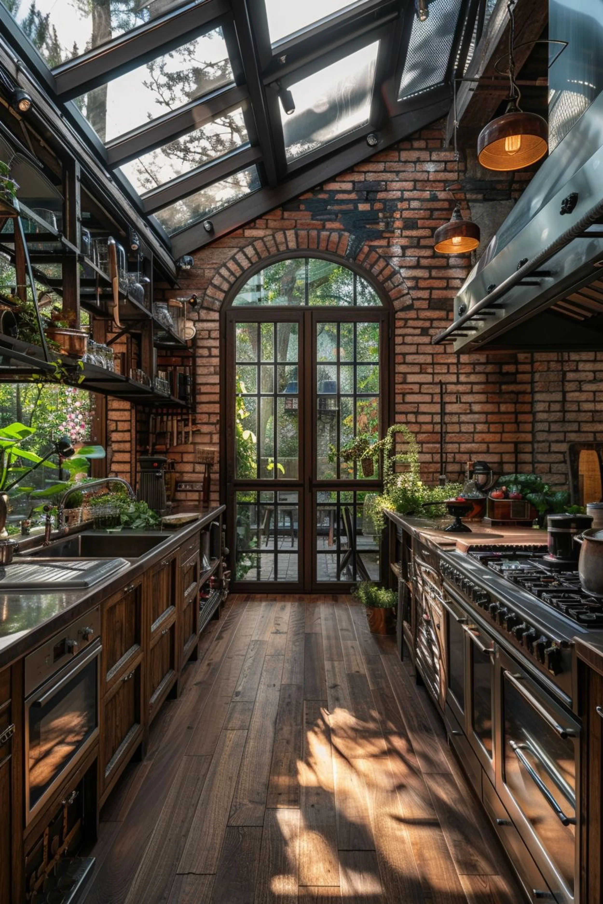 This solarium kitchen is a dramatic mix of greenhouse structure and chef level function. The glass roof angles overhead like a modern conservatory, while the brick wall and arched double doors bring in old world character. Black window frames and metal shelving sharpen the look, making the space feel architectural and purposeful. Copper pendant lights add warmth and a little glow, reflecting softly off stainless appliances and the deep wood cabinetry. The result is equal parts atelier and cook’s kitchen, with the forest outside acting like living wallpaper.