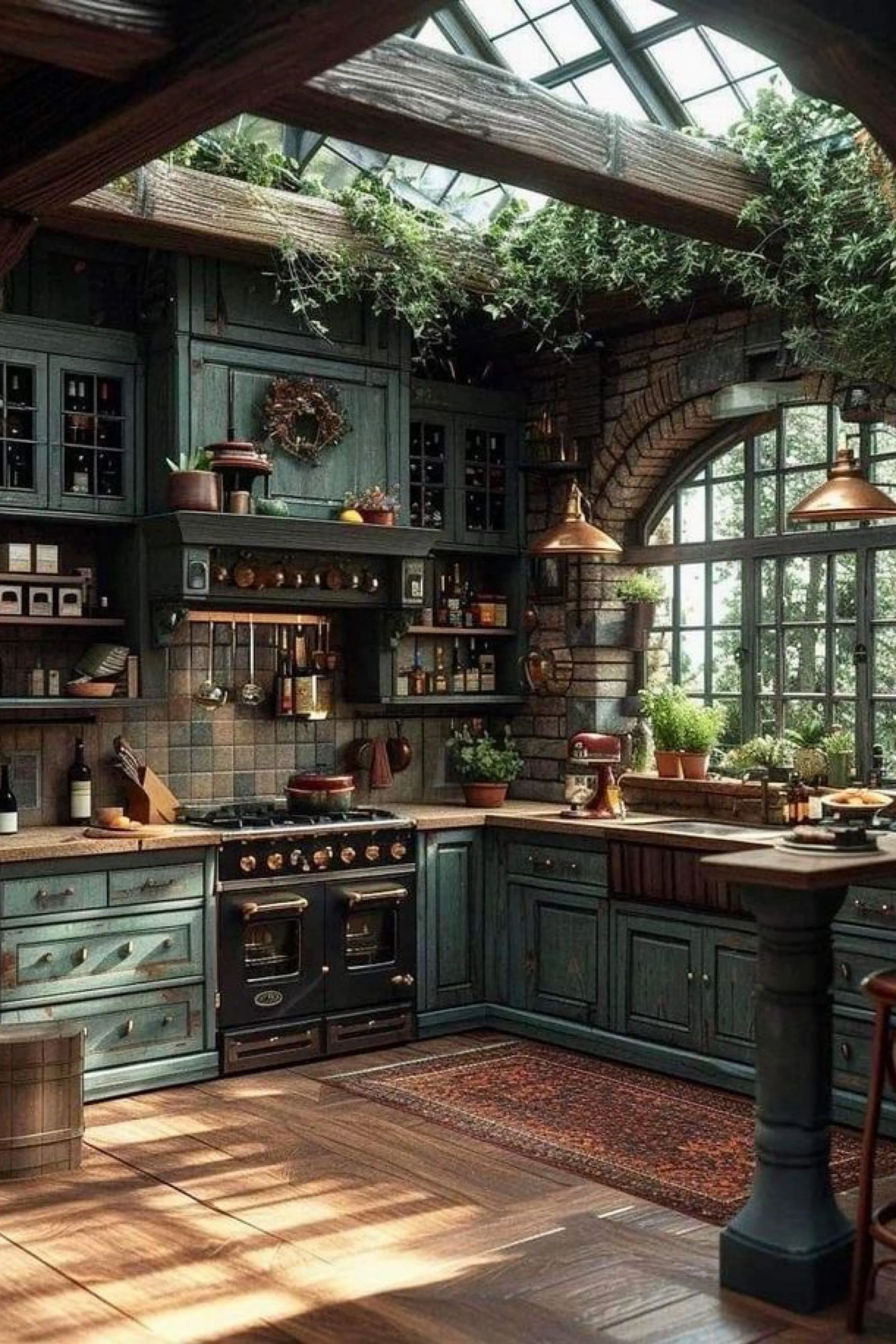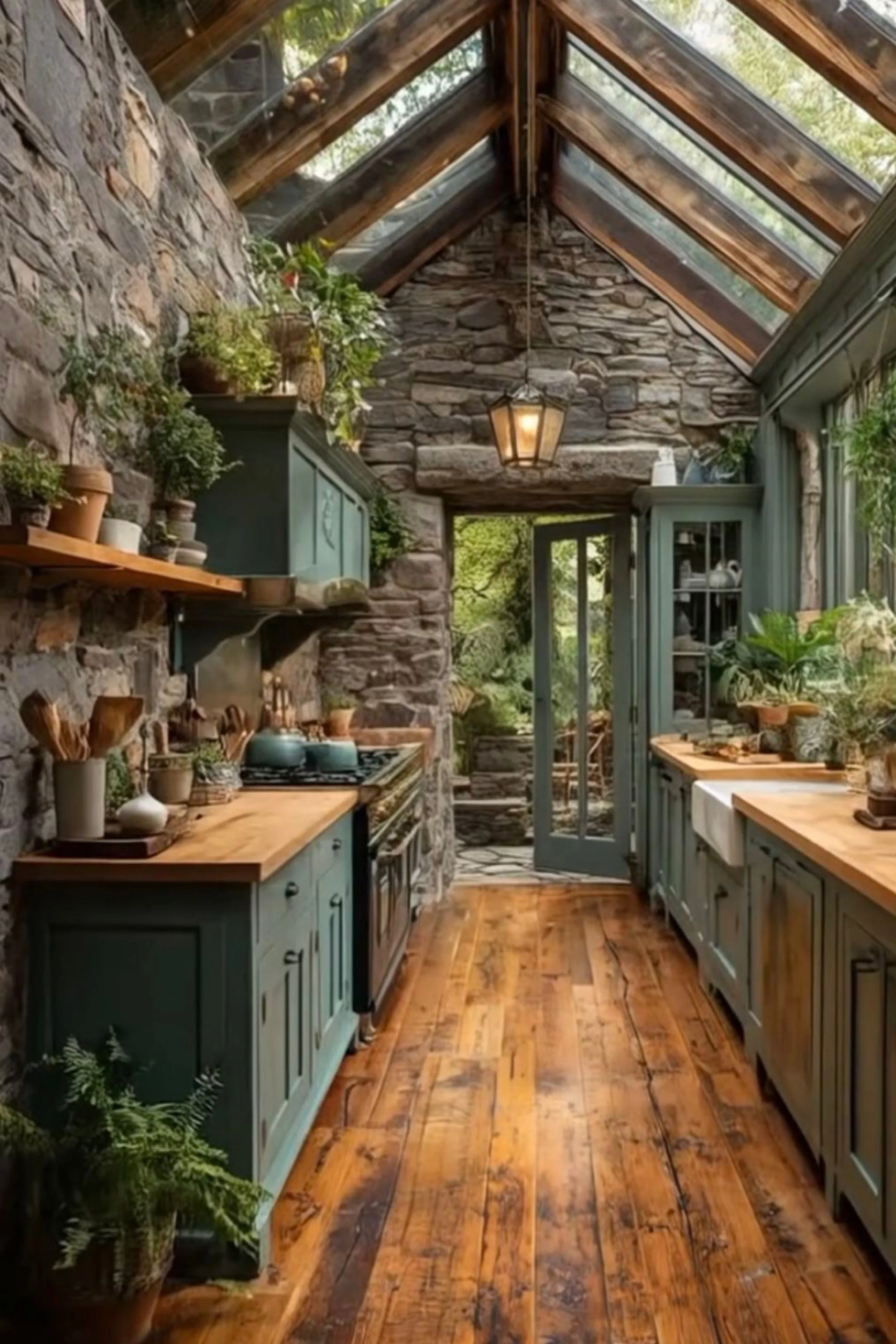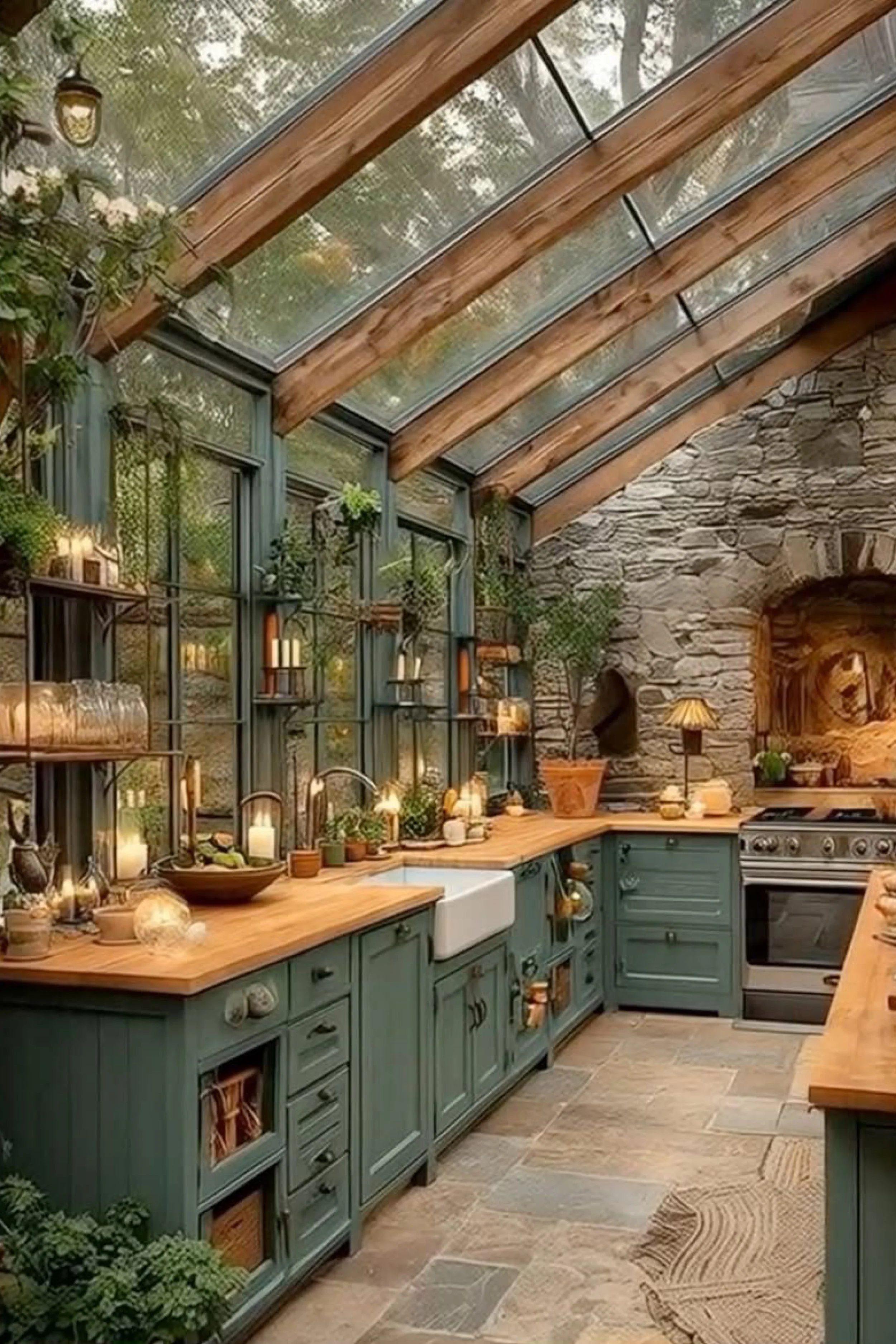 This solarium kitchen feels like a greenhouse daydream built for real cooking. Sage green cabinetry grounds the space with a calm, vintage presence, while butcher block counters add warmth you can almost feel through the screen. The sloped glass roof pulls the outdoors inward, turning every hour into a lighting mood board, from soft morning mist to golden late afternoon glow. Stone walls and rough textures keep it honest and timeless, and the open shelving creates that lived in rhythm where jars, glassware, and herbs look beautiful because they are used. A farmhouse sink anchors the work zone with a classic silhouette, and the greenery throughout reads like decor that also happens to be alive. The result is equal parts cottage comfort and editorial restraint. It is not trying to be precious, it is simply confident. You can picture bread cooling on the counter, tea steeping near the window, and a small candle flickering beside a bowl of citrus. This is the kind of kitchen that makes simple meals feel like rituals.