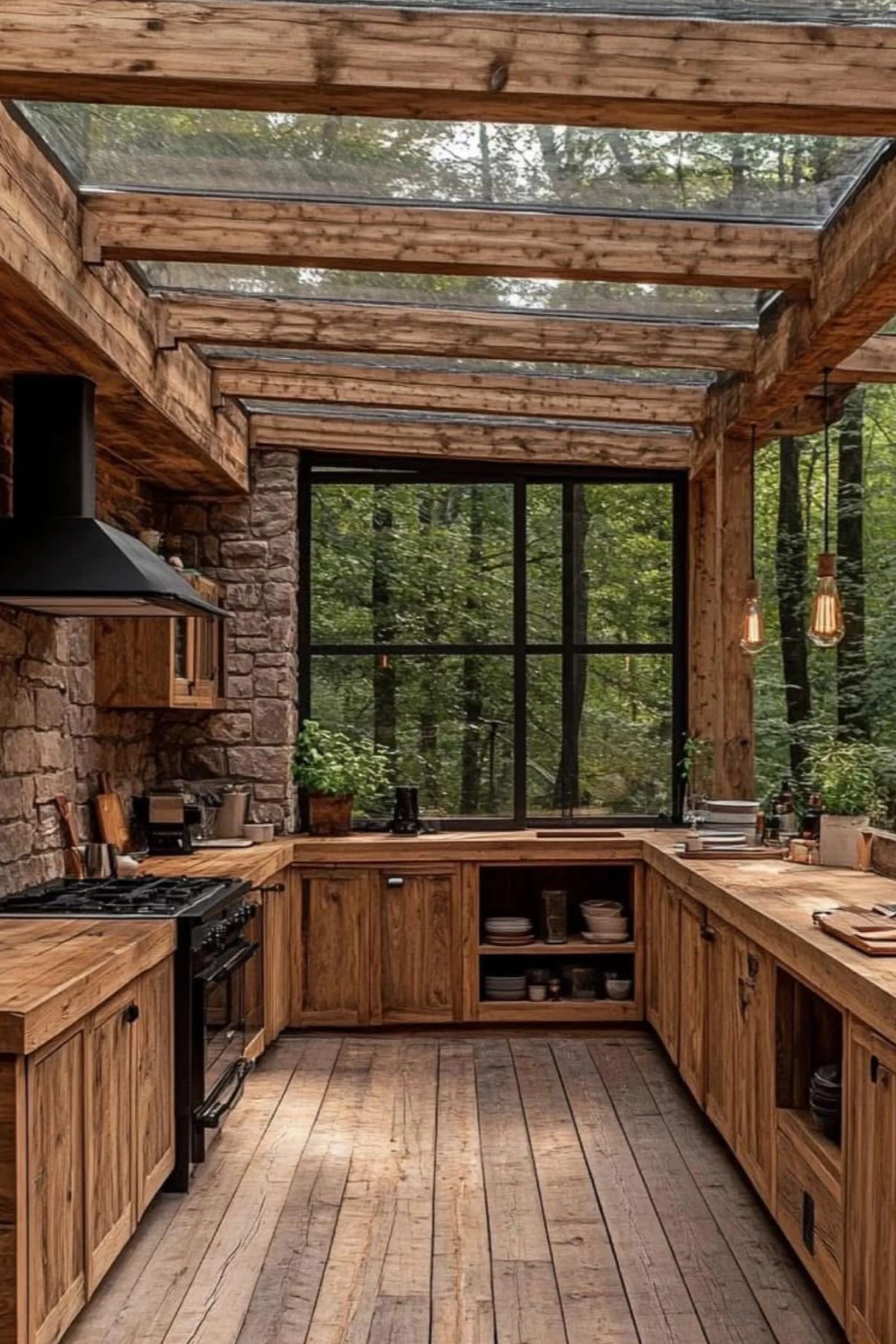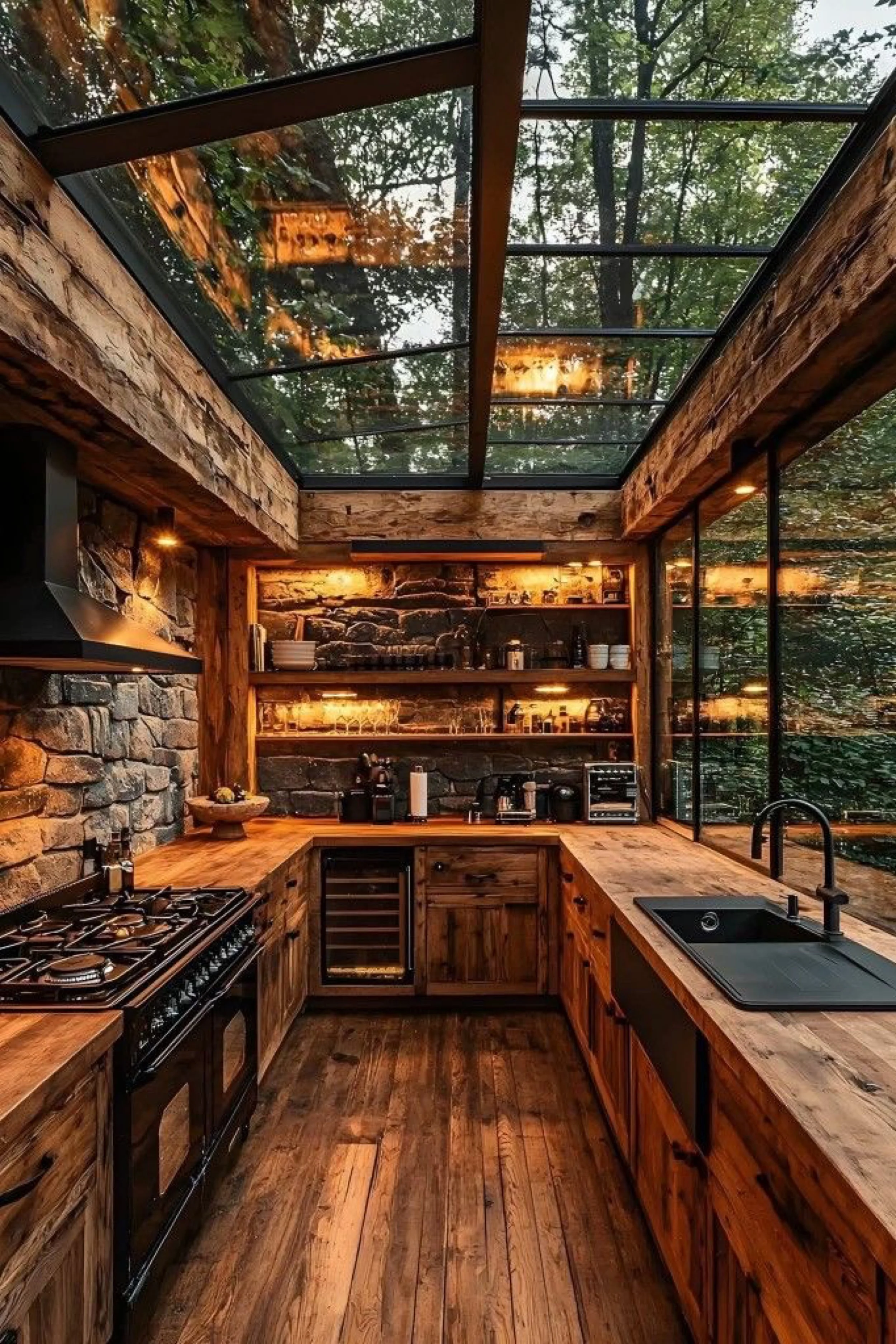 This kitchen is all about the conversation between rugged stone and sunlit wood. The glass roof stretches overhead like a clear canopy, framing treetops and sky as part of the architecture. Natural wood cabinetry and counters carry a cabin soul, but the clean lines keep it modern enough to feel intentional rather than rustic themed. A stone wall backdrop adds weight and history, while open shelves float lightly above the workspace to keep the room breathing. The palette is simple, wood, stone, black metal, and green from potted herbs, which lets texture do the talking. It feels like a place designed for slow mornings and big simmering pots, where the soundtrack is a kettle, birds outside, and soft footsteps on plank floors. The light in a solarium kitchen like this is never flat. It skims, it warms, it changes, and it makes even everyday objects look curated. This is the kind of space that turns meal prep into a calm practice. Nothing is fussy, everything is tactile, and the whole room quietly says, stay a little longer.