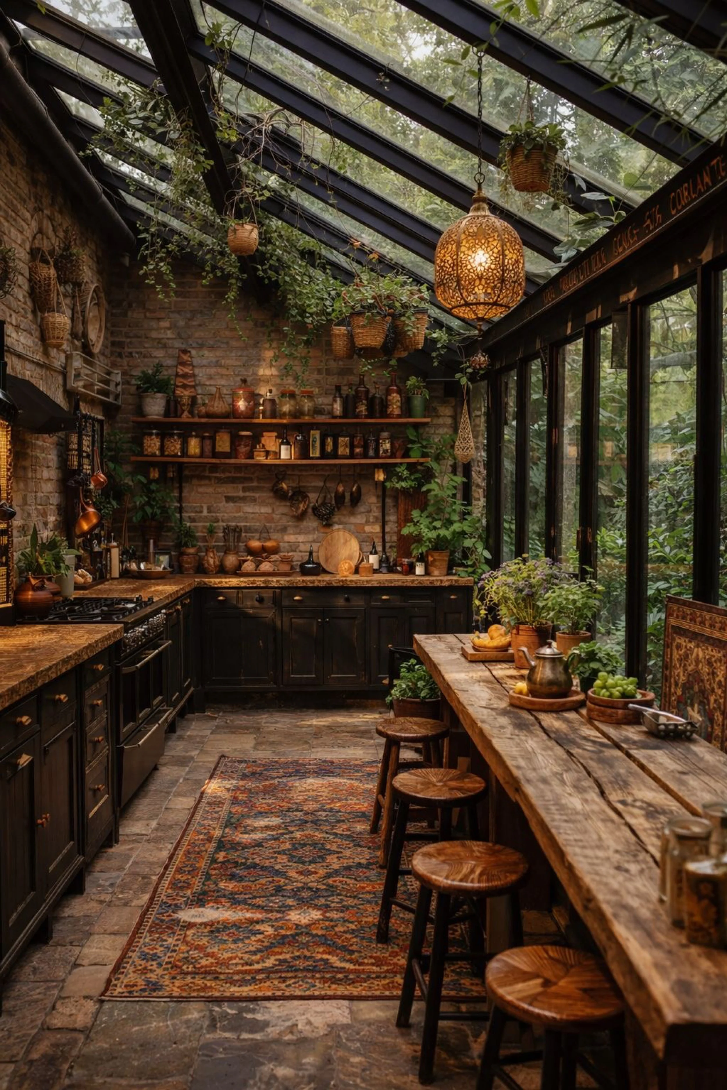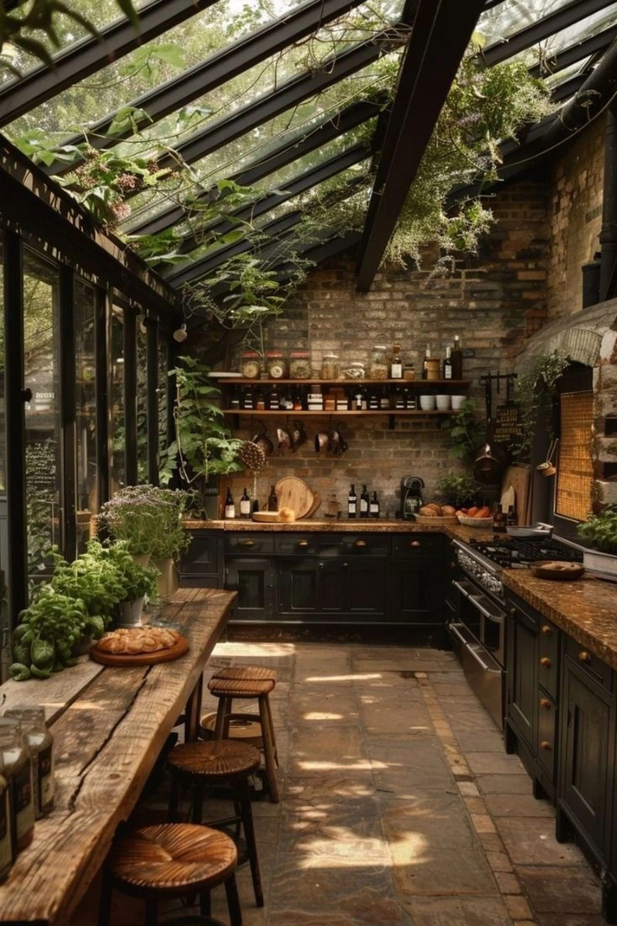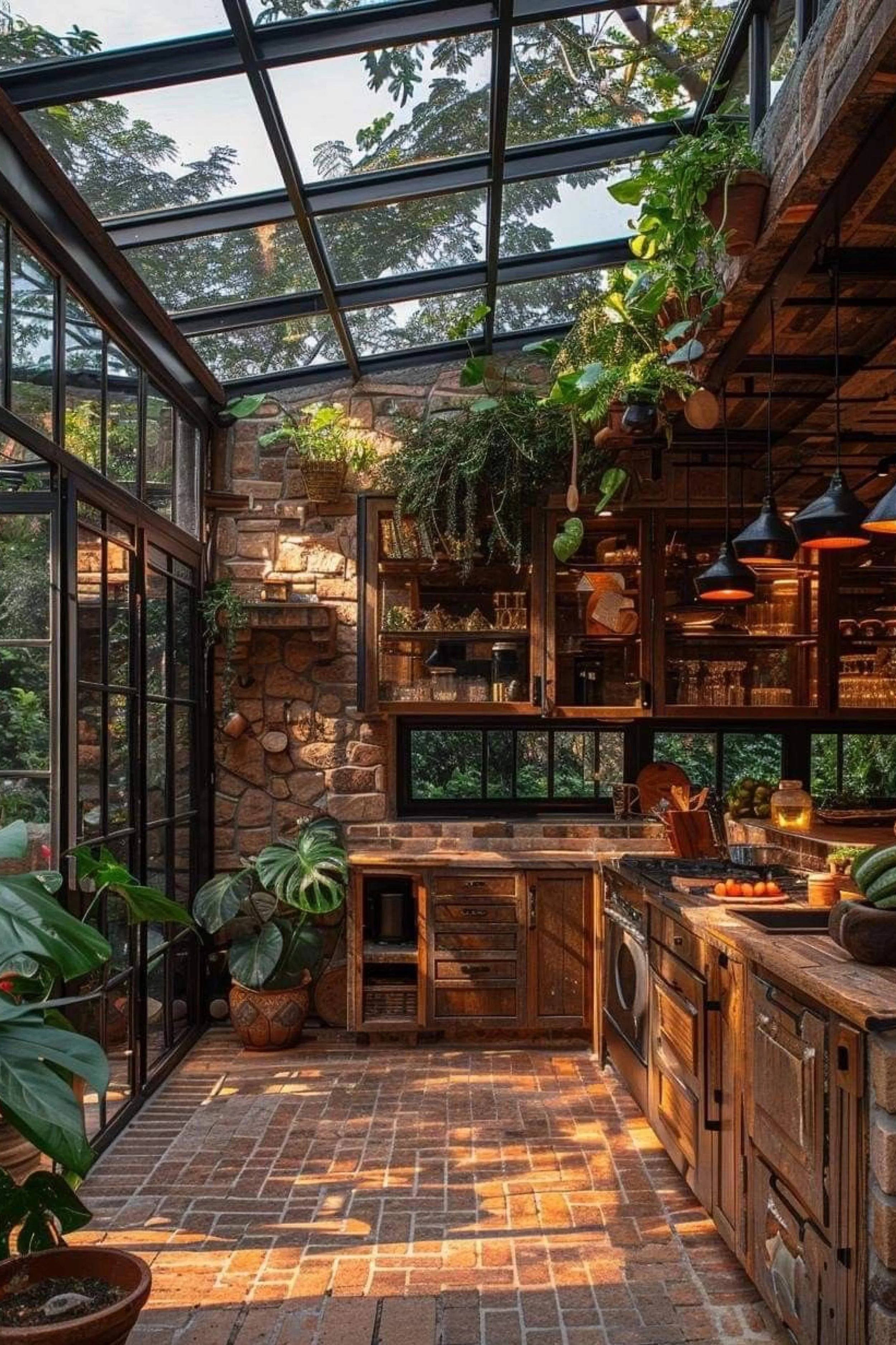 In this collection, each solarium kitchen is a different interpretation of the same idea: bring the outdoors closer, and make the room feel alive. Some lean rustic with rough stone and weathered wood. Others go moody with dark cabinets, warm metal accents, and glowing pendant light. A few feel like conservatories, lush, leafy, and a little romantic, where vines hang overhead and the air looks soft. Every one of them is designed to feel like a retreat you can actually cook in.