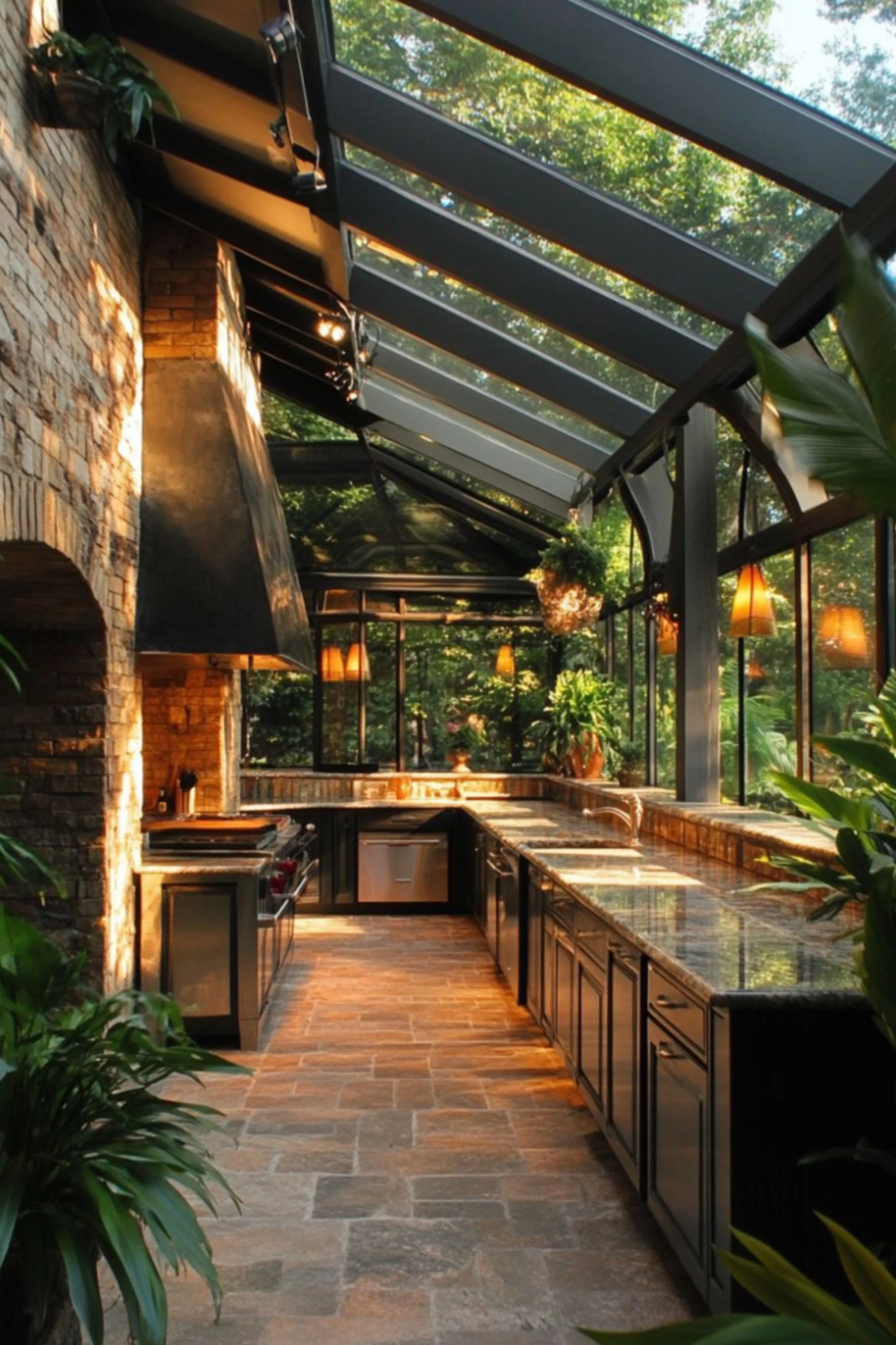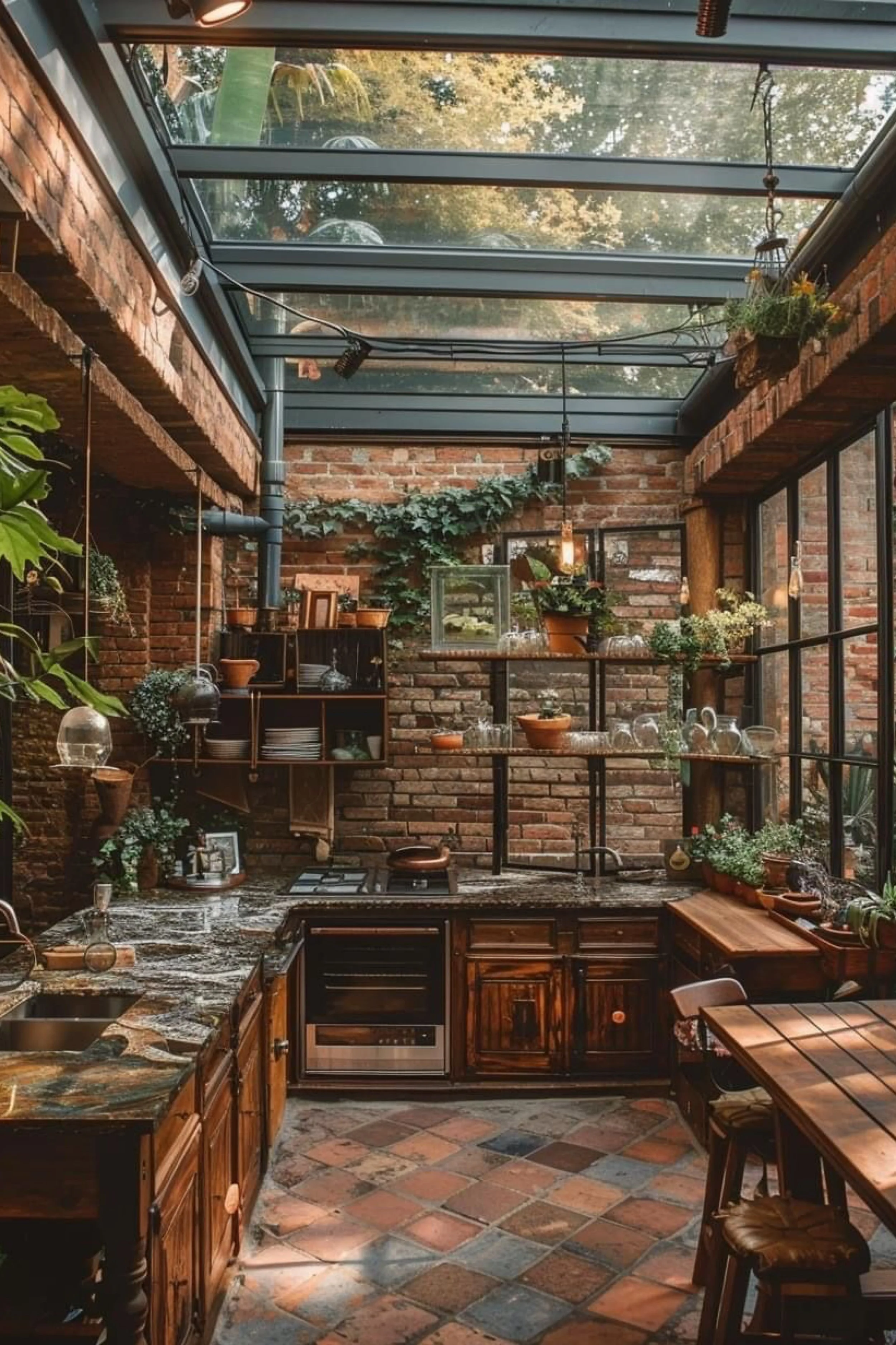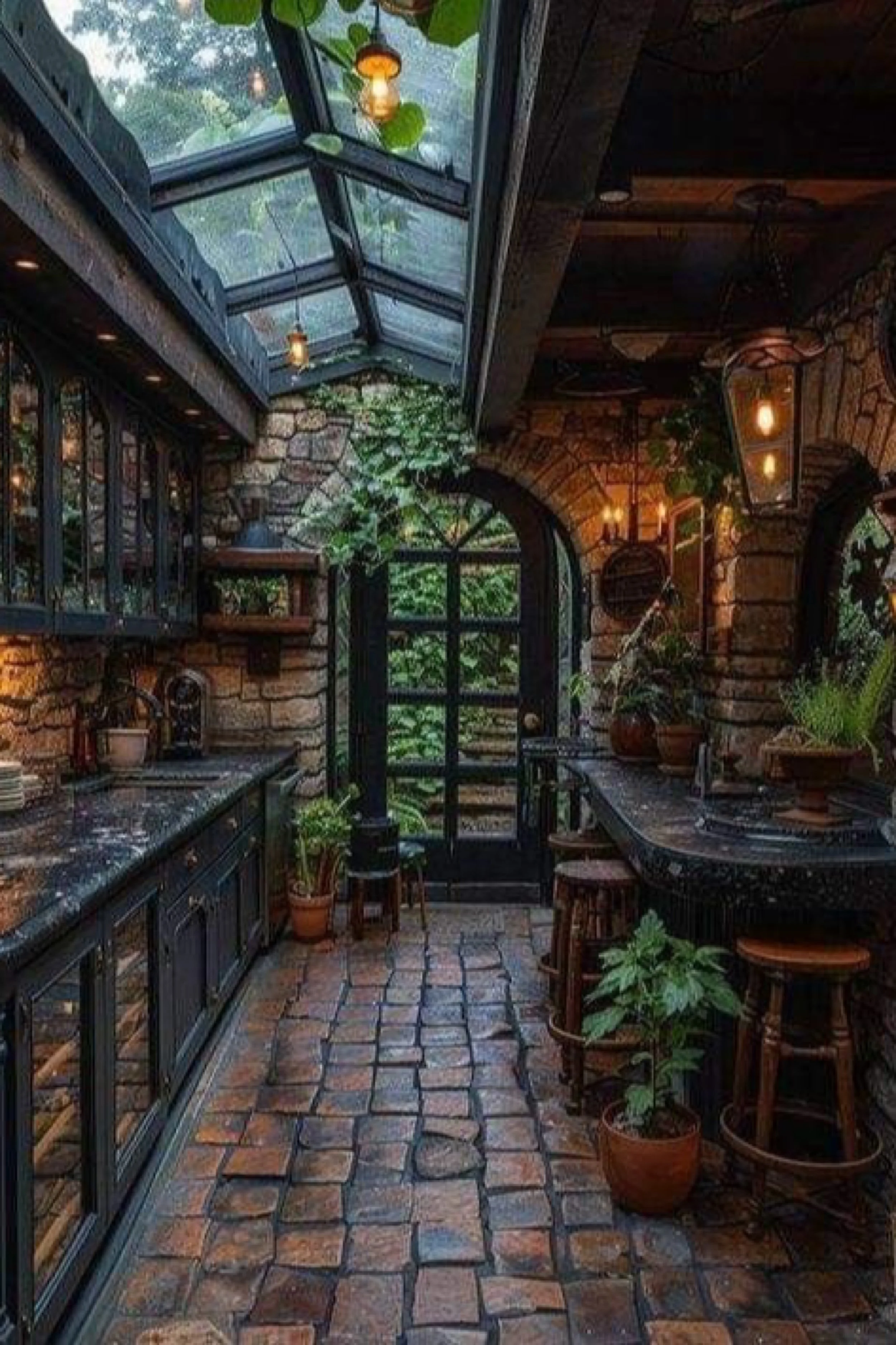 In this collection, each solarium kitchen is a different interpretation of the same idea: bring the outdoors closer, and make the room feel alive. Some lean rustic with rough stone and weathered wood. Others go moody with dark cabinets, warm metal accents, and glowing pendant light. A few feel like conservatories, lush, leafy, and a little romantic, where vines hang overhead and the air looks soft. Every one of them is designed to feel like a retreat you can actually cook in.