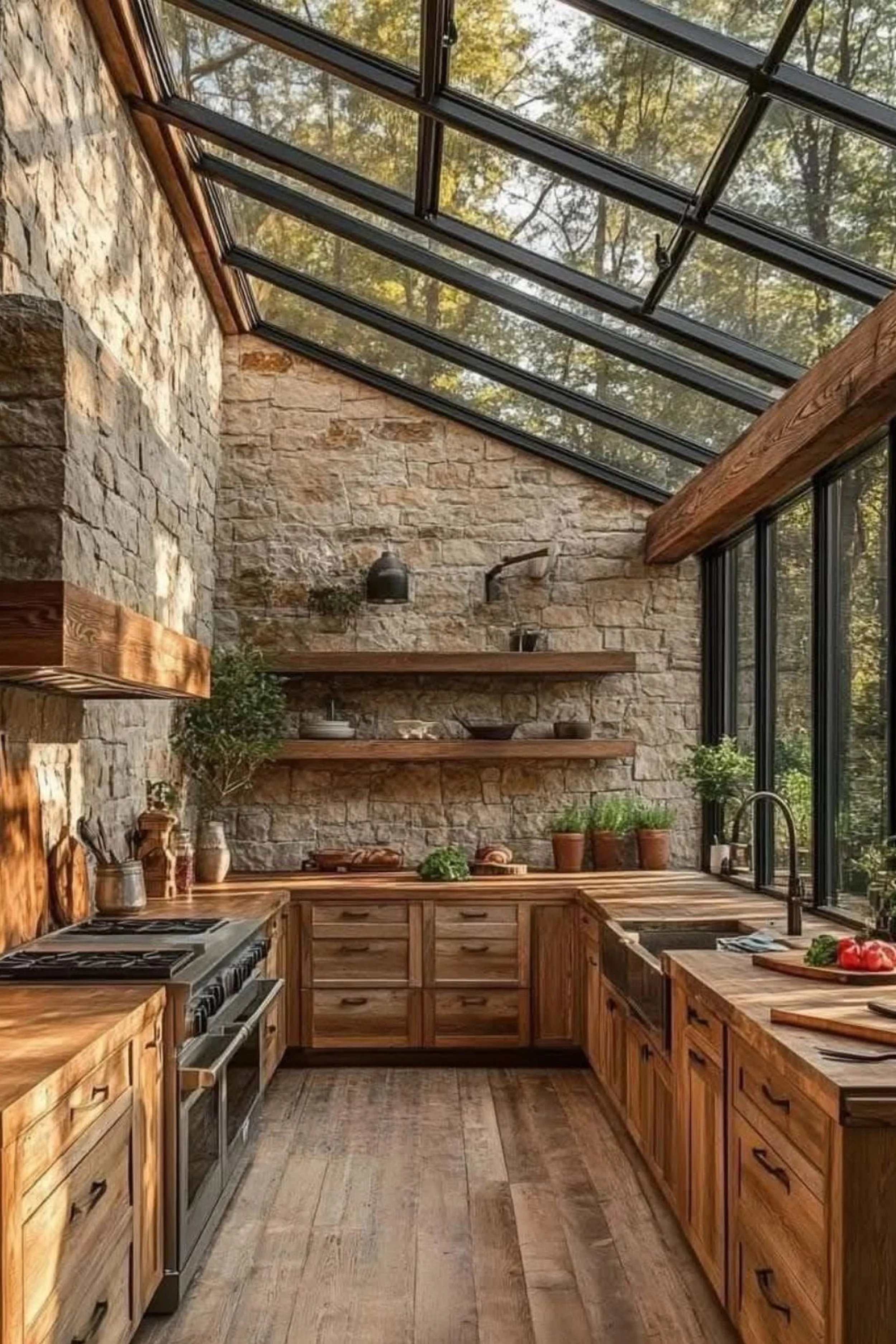 This kitchen captures the clean romance of a modern sunroom wrapped around an old stone structure. The glass roof and black framed windows create strong architectural lines, while the rough stone wall keeps the mood grounded and elemental. Warm wood cabinetry and counters soften the geometry, giving the space a calm, workshop feel that still reads elevated. Open shelves float across the stone like gallery ledges, perfect for everyday ceramics, cutting boards, and the kind of bowls you actually reach for.