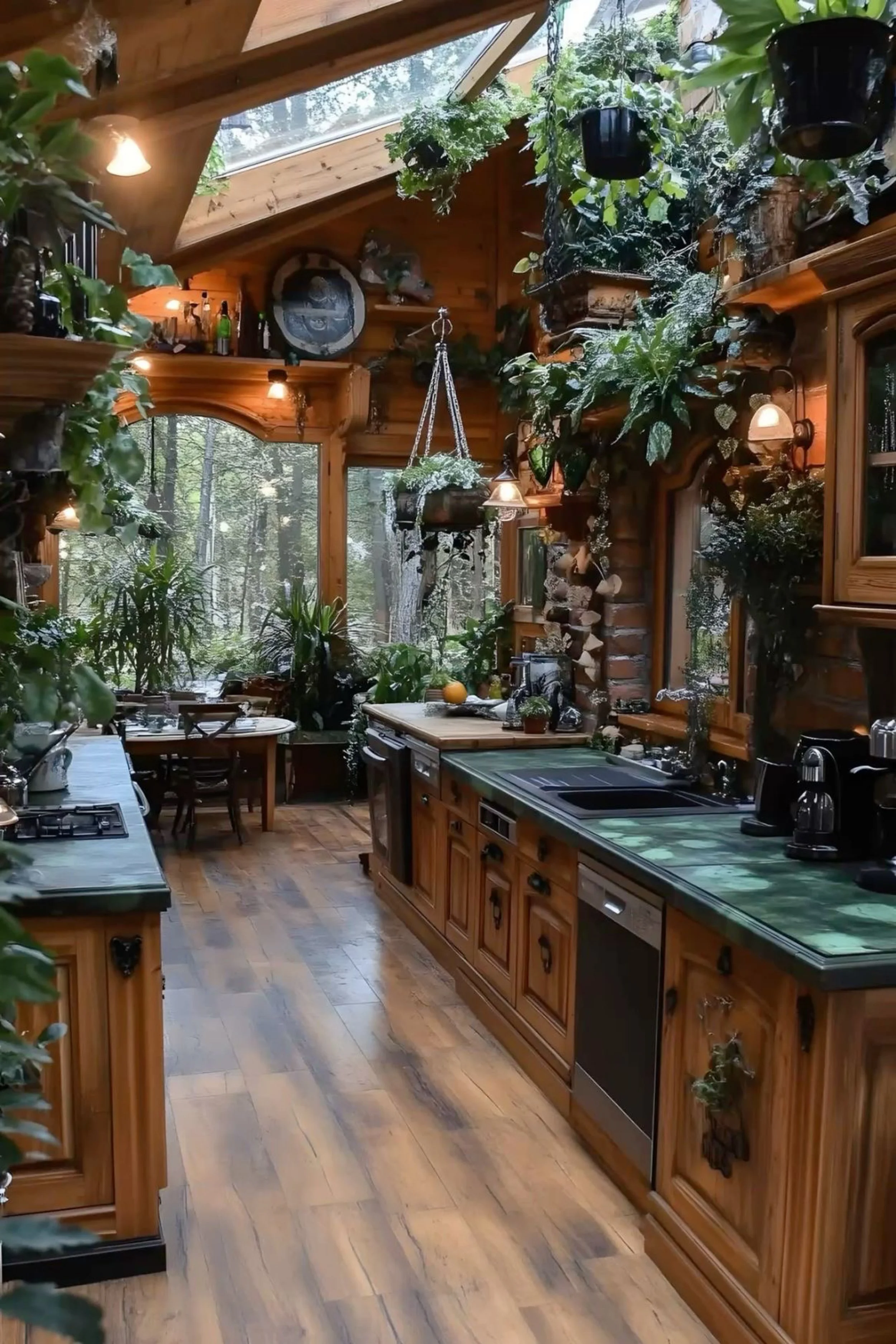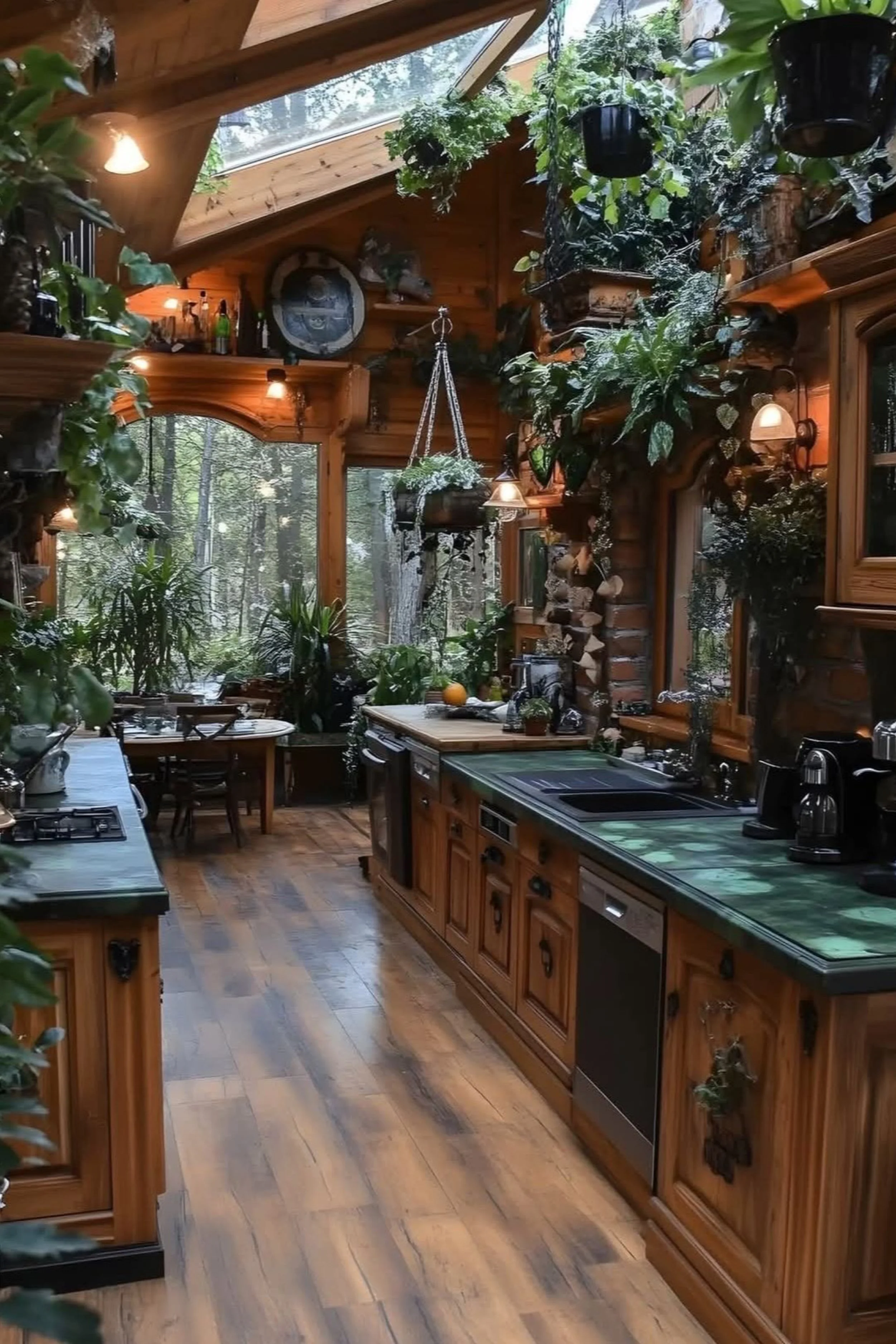 This solarium kitchen feels like a woodland cabin that decided to become a greenhouse. Warm cedar walls and ceiling wrap the space in honey toned comfort, while the skylights and tall windows pull the forest right into the room. The standout detail is the deep green countertop that reads like polished stone, rich, moody, and totally unexpected against all that wood. Layered plants hang from above and crowd the shelves, creating a lush canopy that makes the kitchen feel alive. Small lamps and warm sconces glow between leaves, giving everything a soft, evening cabin romance even in daylight.