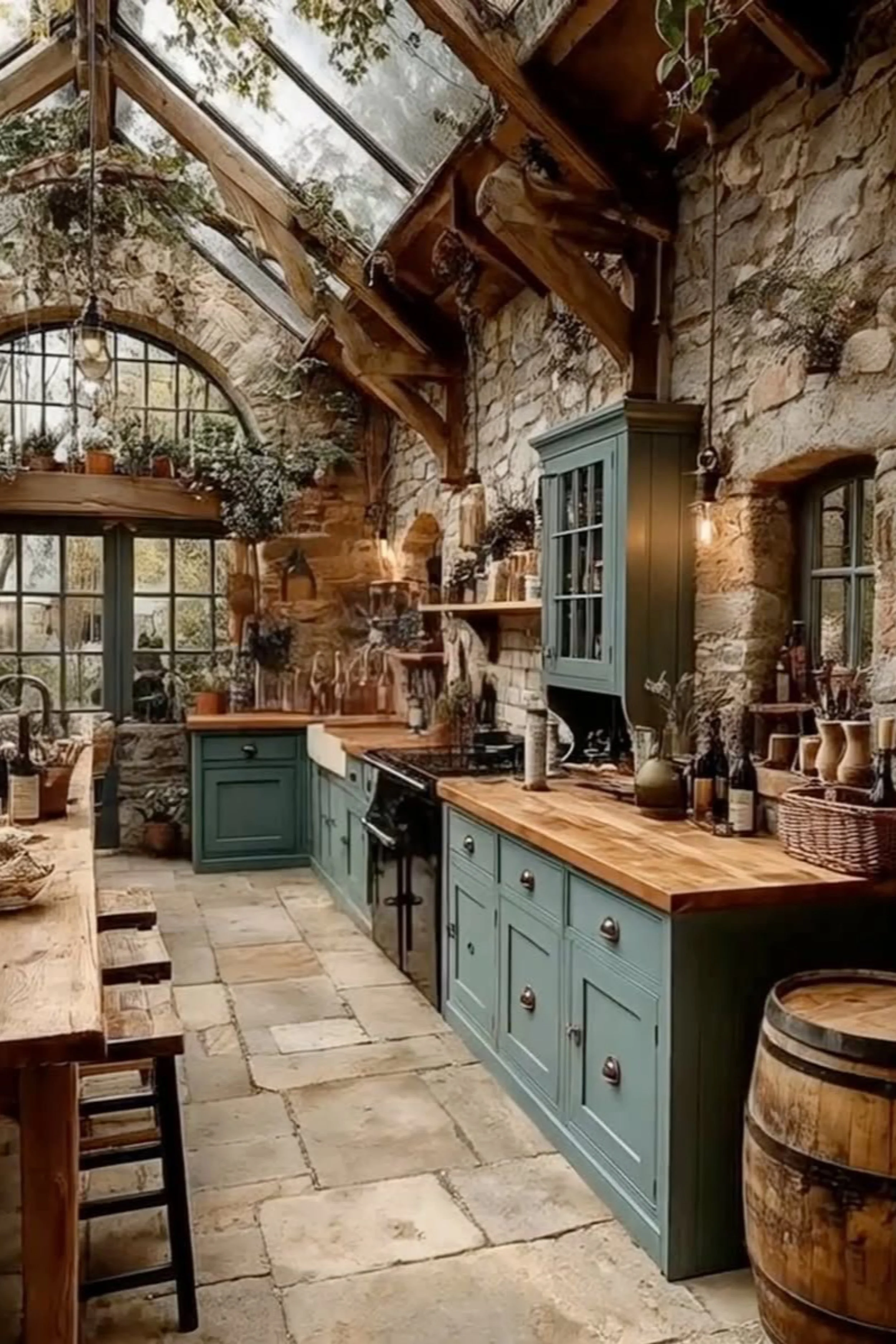 This solarium kitchen feels like an old stone cottage that decided to live in the light. The glass roof arches overhead with chunky timber supports, turning the whole room into a sun soaked conservatory. Teal cabinetry adds a soft hit of color that still feels classic, especially paired with warm wood counters and aged metal hardware. Stone walls wrap the space with texture, and the arched window and door frames make everything feel storybook without tipping into theme.