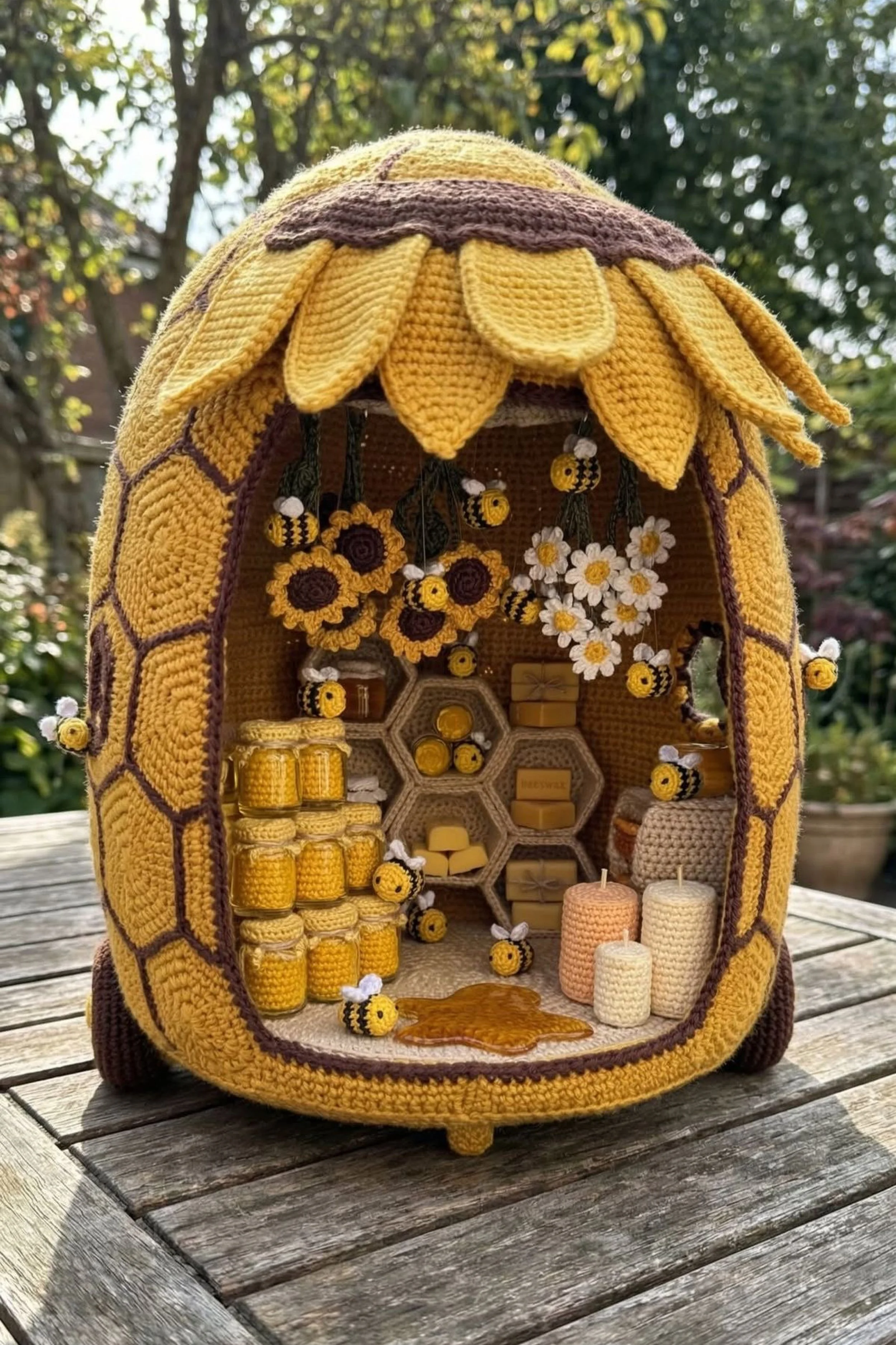 Photograph this piece in warm light so the golden yarn looks rich and dimensional. A wood tabletop is perfect, but you can elevate it by placing a piece of pale linen underneath to brighten the shadows inside. Keep the background simple and sunlit, like a garden blur, so the bees and honey jars stay sharp. For a shelf display, pair it with a small dried flower bundle in yellow or cream, plus a simple ceramic bowl. If you want a luxe editorial mood, use a neutral stone surface and add one real beeswax candle nearby for continuity. For video, start with a front view to show the sunflower shape, then glide into the interior honeycomb shelves. End on a close up of the tiny bees hovering, because that detail feels magical on camera.