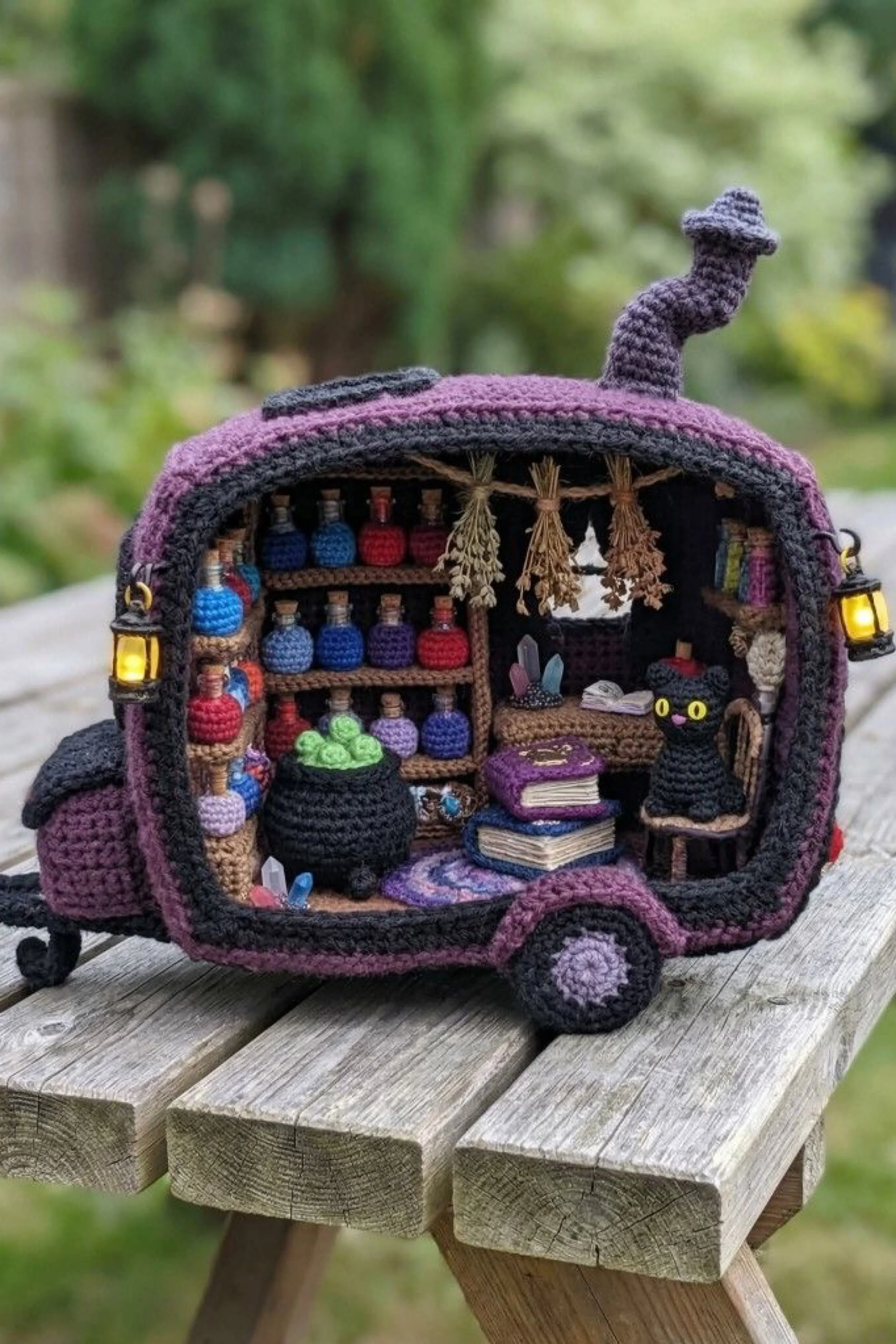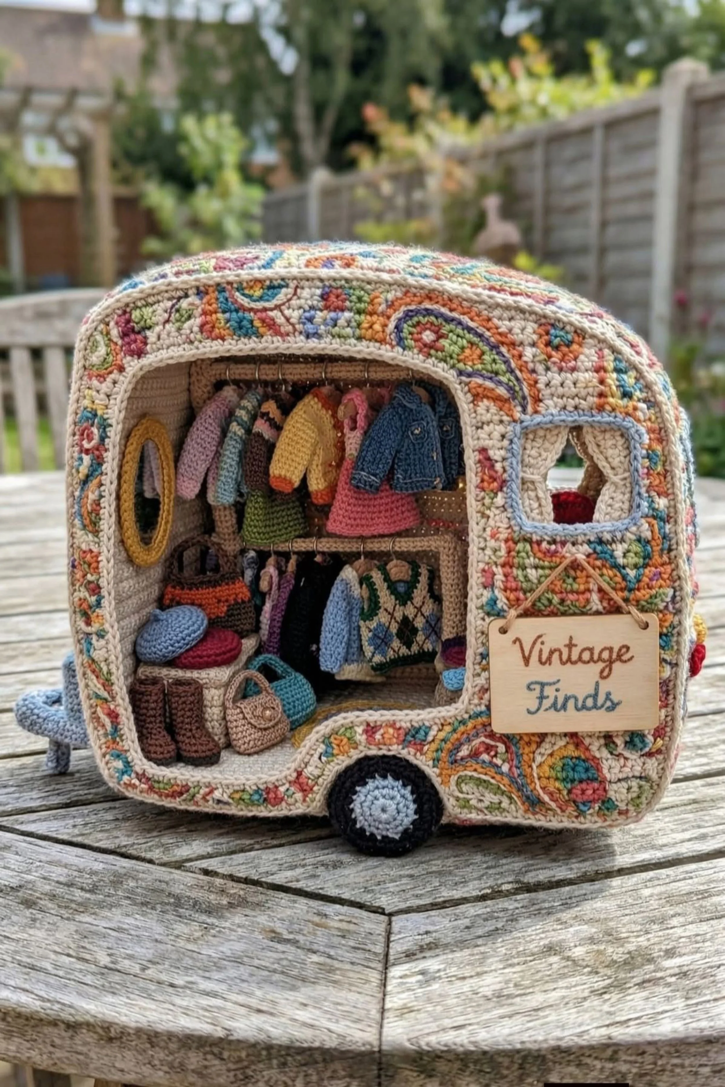 This crochet caravan is a traveling vintage boutique, dressed in creamy yarn with a tapestry of colorful stitched motifs that feel like embroidered wallpaper. Inside, a tiny clothing rack is packed with miniature garments in soft jewel tones, including little jackets and dresses that make the space feel like a curated shop rather than a simple display. Accessories are styled like a real boutique floor: hats stacked neatly, a pair of boots ready by the door, and a few handbags placed for that styled, shoppable look. The sign reading Vintage Finds makes the story instantly clear, and the patterned exterior adds a nostalgic, market day energy that feels warm and inviting. Even the small mirror detail and curtained window add personality, making it feel like a real tiny storefront parked at a weekend fair. It is detailed, playful, and full of charming fashion micro moments that make you want to lean in and browse.