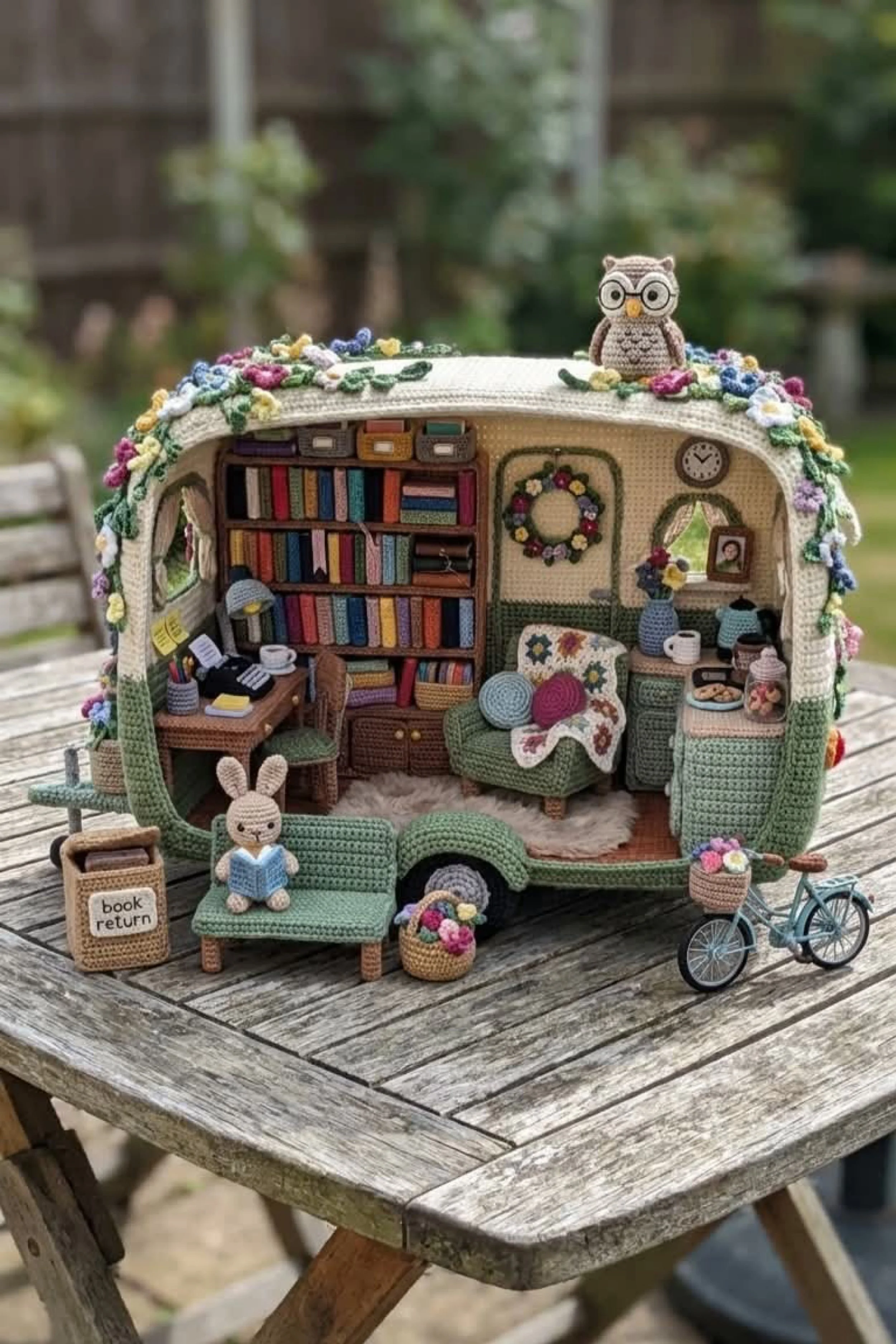 This crochet camper feels like a tiny bookshop and reading room rolled into one, wrapped in soft cream and green with flowers climbing the roofline like a storybook garden. Inside, a full wall of colorful books makes the space instantly cozy, while a small desk and lamp create a lived in writer corner. The seating area looks plush and inviting, complete with pillows and a quilted throw that adds texture and warmth. Little details like the wreath on the wall, the clock, and the mug on the counter make it feel like an afternoon spent reading with tea and quiet company. Outside, the scene becomes a whole miniature moment with a book return box, a flower basket, and a bicycle waiting for a slow ride home. The bunny figure adds charm without taking over the scene, like a gentle mascot for the library theme. It is bright, comforting, and wonderfully staged, the kind of miniature that instantly makes people smile.