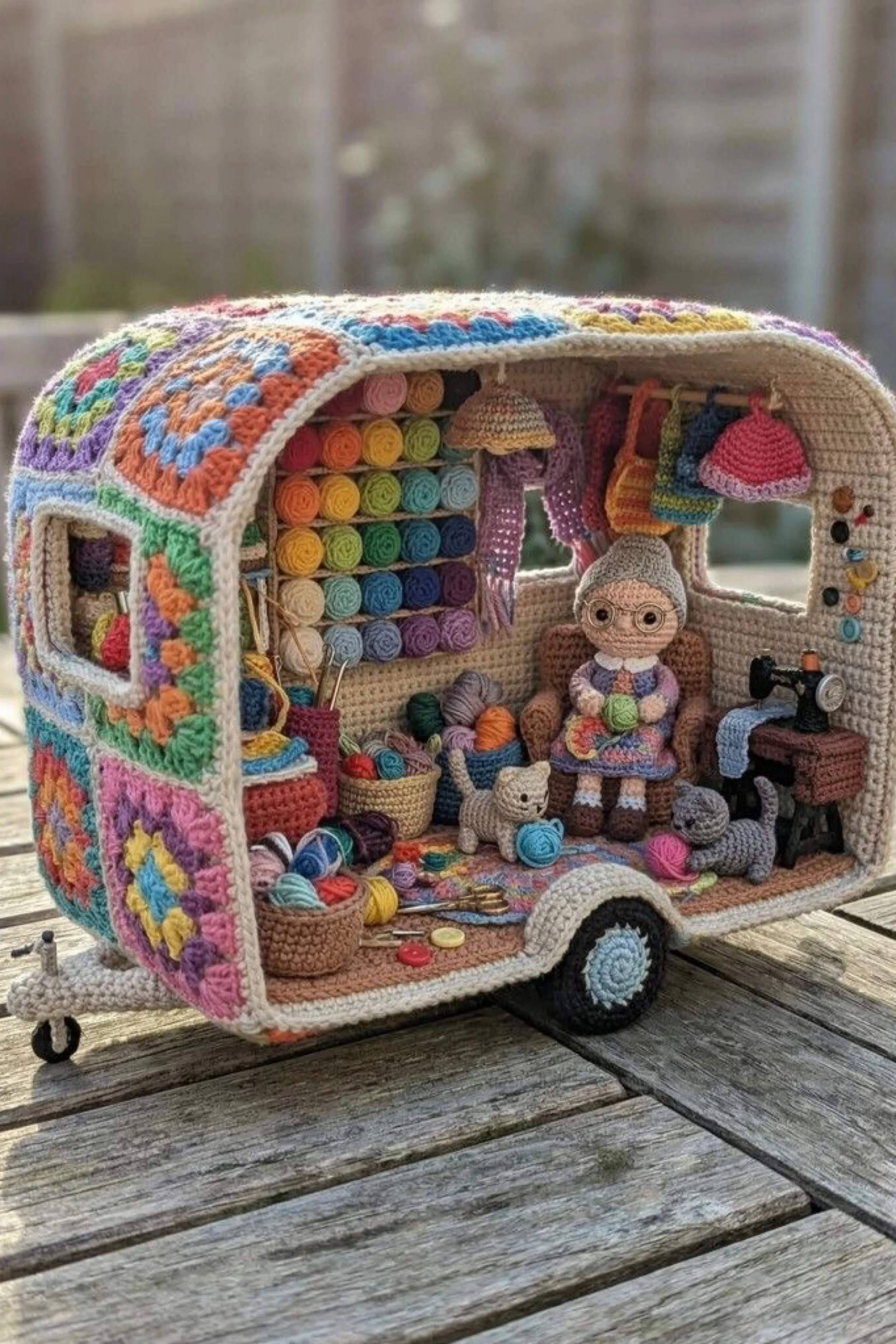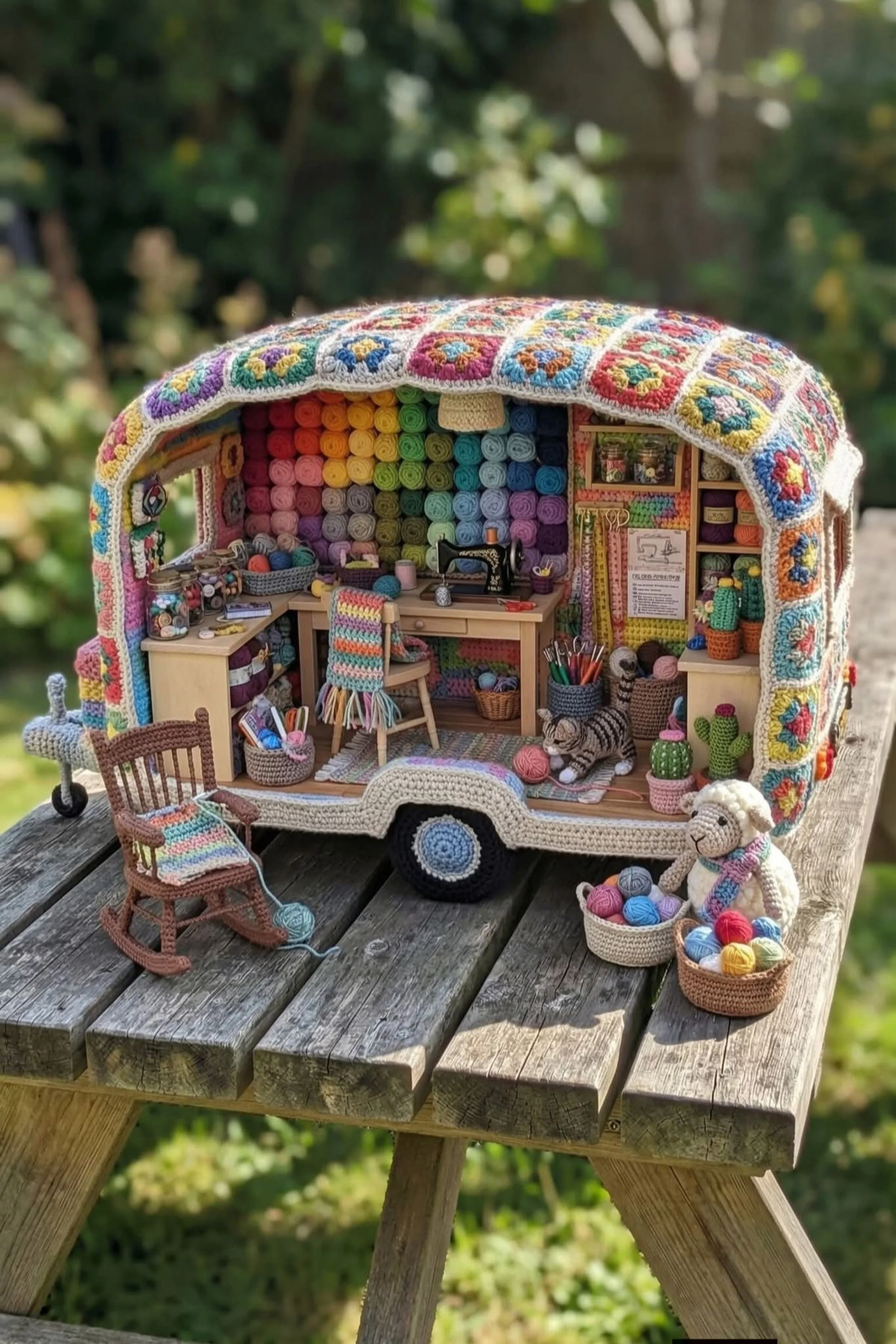 This crochet caravan is pure craft room fantasy, wrapped in colorful granny squares that make it feel like a traveling quilt of creativity. Inside, it becomes a tiny studio where everything has a place, from neatly rolled yarn in rainbow rows to baskets overflowing with works in progress. The miniature character seated in the center gives the scene a narrative, like a maker on tour who sets up shop wherever inspiration strikes. Little crocheted garments hang from a rod, turning the interior into a micro boutique and workspace at the same time. The floor is scattered with tools and yarn, but it still feels intentional, like the comforting kind of busy. A small sewing machine detail adds an extra layer of realism, bridging crochet and textile craft in one sweet setting. It is nostalgic, bright, and charming, the kind of piece that instantly makes people smile.