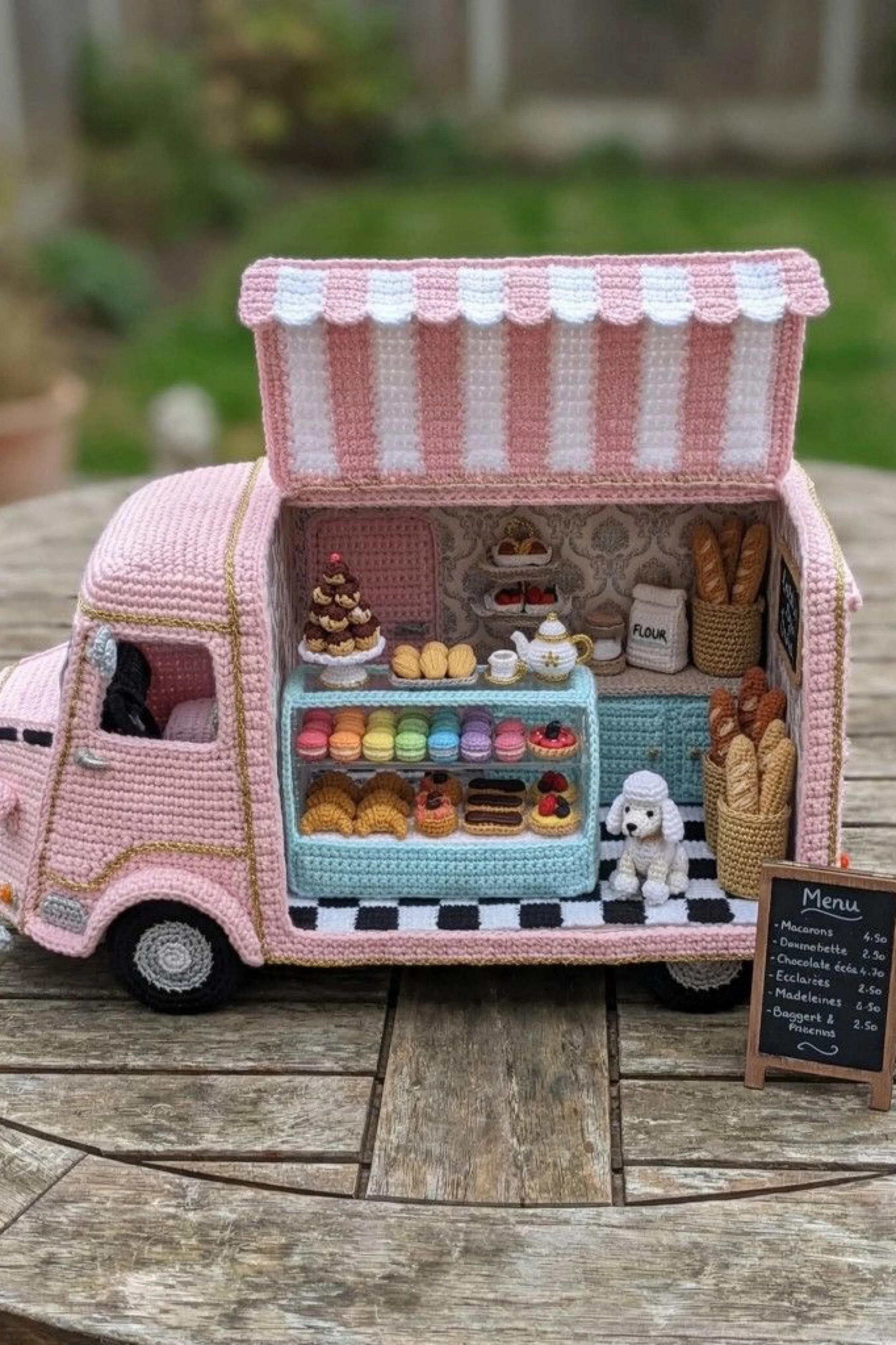 This crochet bakery truck is a pastel dream, styled like a tiny street patisserie with a pink and white striped awning and a dessert case full of miniature sweets. The interior feels like a real little shop, with a display counter showing colorful macarons, pastries, and tiny cakes, plus shelves and baskets stocked with baguettes and baking pantry details. The checkered floor adds that classic bakery charm, and the small menu board out front makes it feel like you could actually order something. A tiny poodle companion adds extra sweetness and personality, like the bakery mascot who welcomes customers. The palette is soft and playful, but the details are surprisingly refined, from the little tea set to the layered desserts arranged in the case. It has that perfect mix of cute and crafted, with lots of visual variety that photographs well from multiple angles. Overall, it reads as a miniature café moment, romantic, whimsical, and ready for a styled tabletop scene.