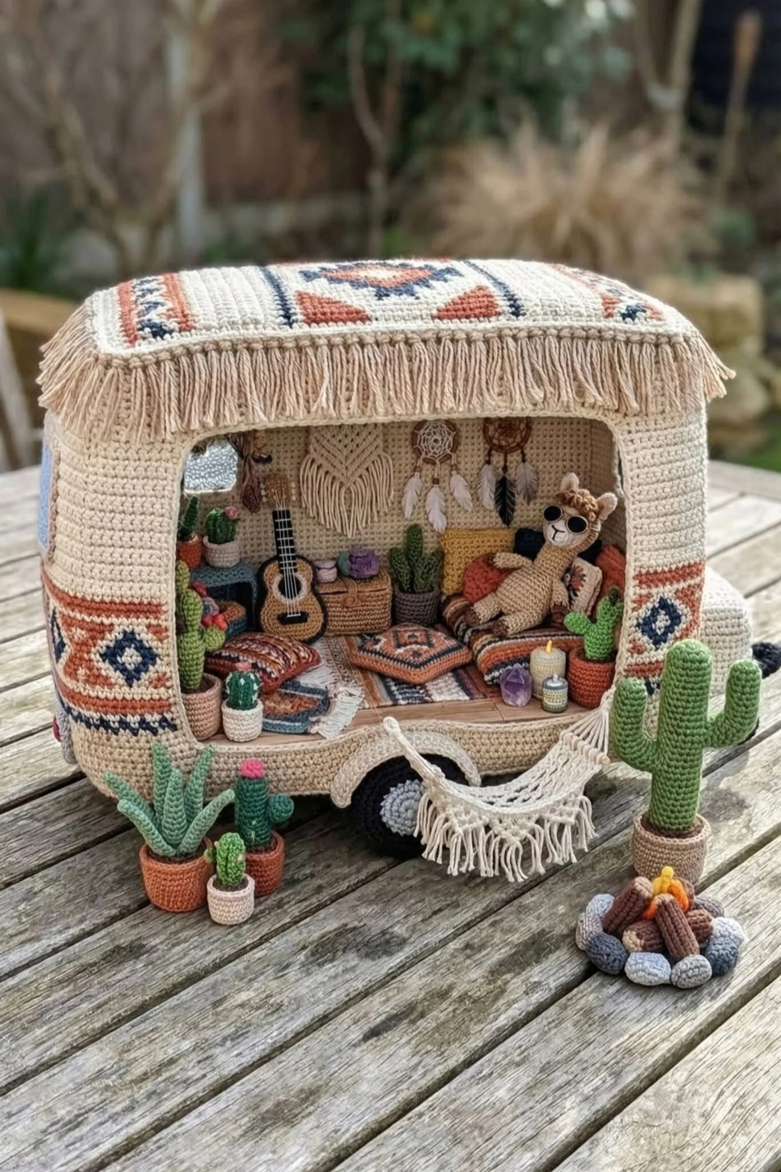 This crochet camper is a tiny desert lounge, styled like a cozy bohemian hideaway with warm cream tones, geometric accents, and fringe that drapes from the roof like a festival canopy. Inside, the floor is layered with patterned pillows and a woven rug vibe, creating a relaxed seating area that feels made for sunset conversations. A small guitar leans in the corner, adding instant personality and suggesting music by the fire. Dreamcatchers hang on the wall for that classic boho touch, while potted cacti and succulents fill the space with desert greenery. The tiny hammock detail out front adds movement and makes the camper feel like a full campsite scene rather than just a box. Everything about it feels warm, textured, and inviting, like a miniature version of a styled van life photo. It is the kind of piece that looks good from every angle because the textures are the decoration, from fringe to pillows to the woven plant pots.