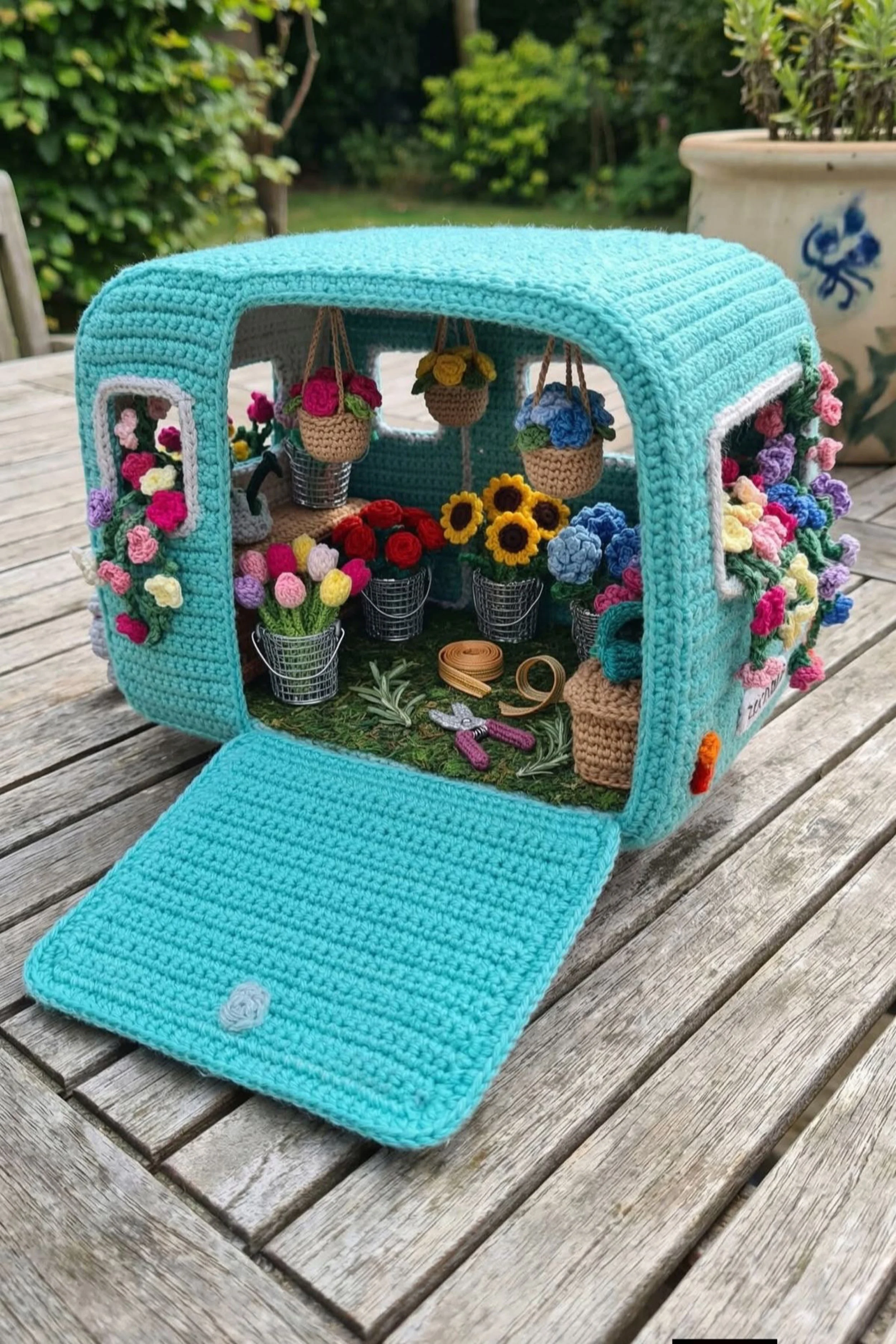 This crochet box van is a bright little florist workspace, stitched in vivid aqua with an open back that turns into a tiny flower shop floor. Inside, buckets of crocheted blooms are arranged like a market display, with roses, sunflowers, and cool toned blossoms creating a cheerful spectrum. Hanging baskets add vertical styling and make the interior feel full and abundant, while small tools on the floor suggest real hands on floristry work. The flower covered side panels give it a whimsical traveling garden feel, as if the whole van is wrapped in blossoms. The open ramp creates a built in stage for photos, showing the entire interior at once and making the colors feel even more vivid. It is clean, bright, and instantly readable, which makes it perfect for quick social content and for display on a shelf where you want a pop of color and a happy theme.
