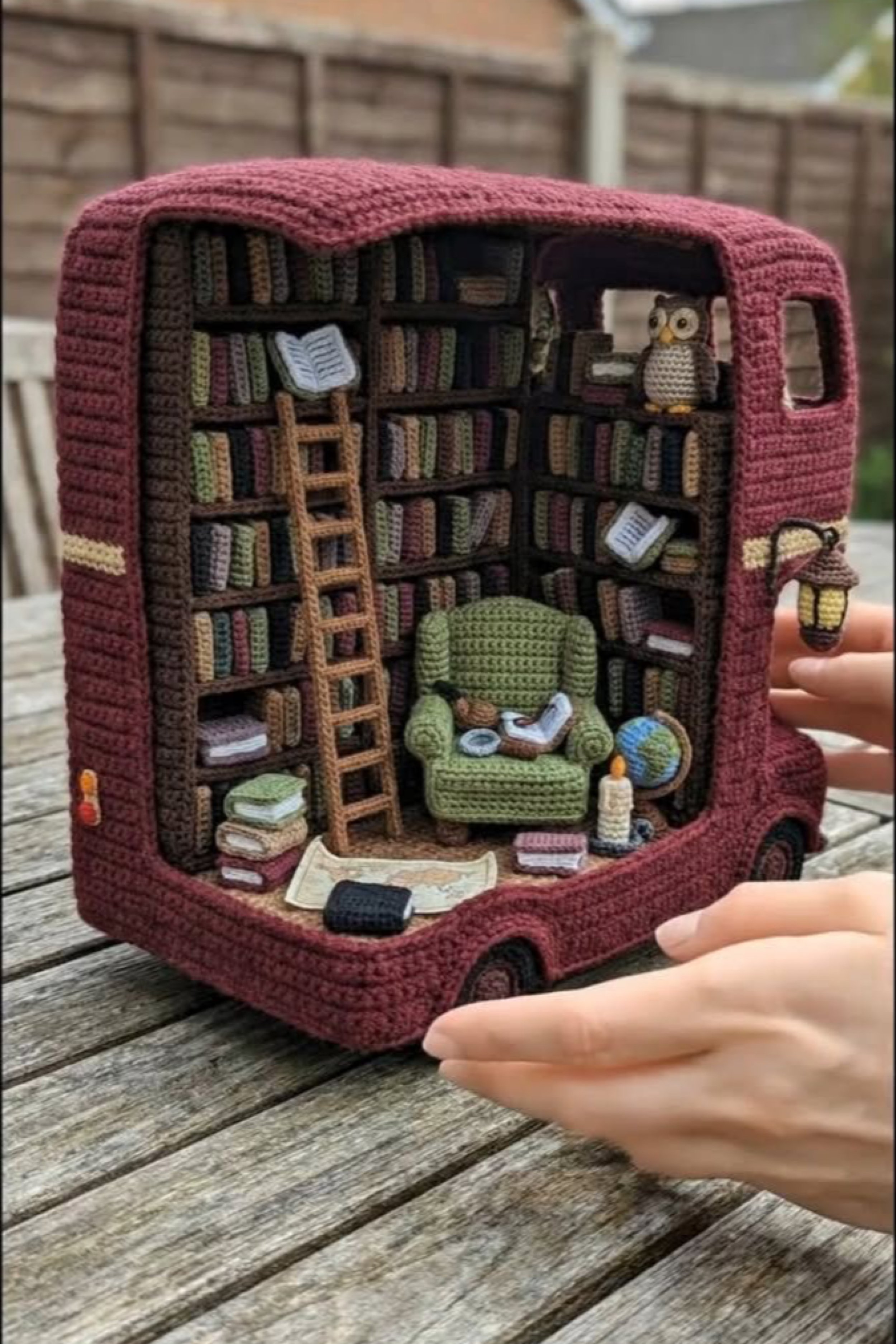 This crochet bookmobile is pure cozy academia, built like a tiny rolling library with walls of miniature books and a reading nook that feels beautifully private. The deep wine colored exterior sets a moody tone, while the interior shelves wrap around the space like a little sanctuary. A ladder leans against the stacks, instantly giving it that classic library romance, and the open books placed at different angles make it feel active, like stories are being browsed right now. In the center, a soft armchair anchors the scene, paired with small reading details like a candle and a globe that add a quiet, thoughtful atmosphere. The tiny owl perched among the shelves feels like a magical librarian mascot, watching over the collection. The whole piece has a satisfying sense of depth, with the shelves drawing you inward and the reading corner creating a focal point that photographs incredibly well. It is the kind of miniature that feels like a mood, warm, bookish, and softly cinematic.