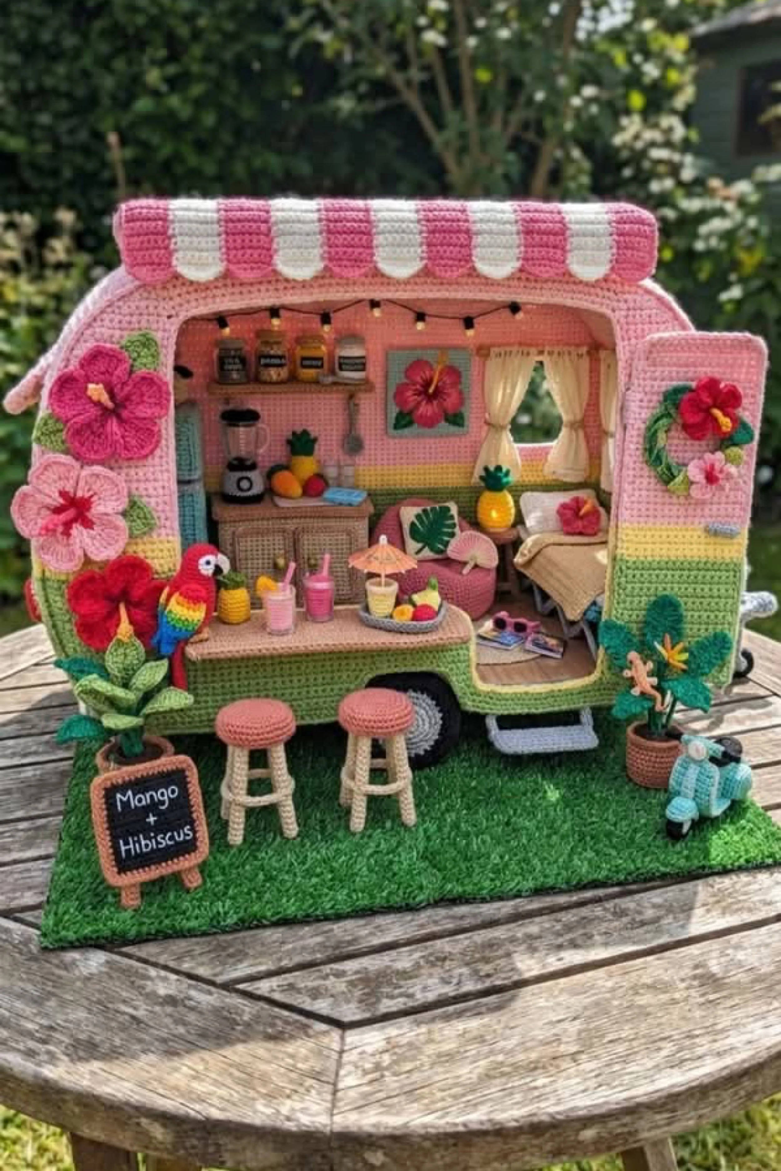 This crochet camper is a tiny tropical smoothie bar, bursting with pinks, mango tones, and hibiscus flowers that feel like summer vacation in miniature form. The striped awning sets the market stall mood immediately, and the interior is styled like a cheerful juice counter with jars on shelves, fruit on the prep space, and little drink details that feel playful and refreshing. The hibiscus flower art and bright decor keep the theme cohesive, while the seating area in the back makes it feel like a real little hangout spot rather than just a service window. Outside, the grass base turns it into a full scene, complete with stools at the counter and a sign that announces the flavor story. The parrot detail adds a pop of personality and color, making the whole piece feel like a tropical roadside stop you would actually pull over for. It is bold, happy, and extremely photogenic.
