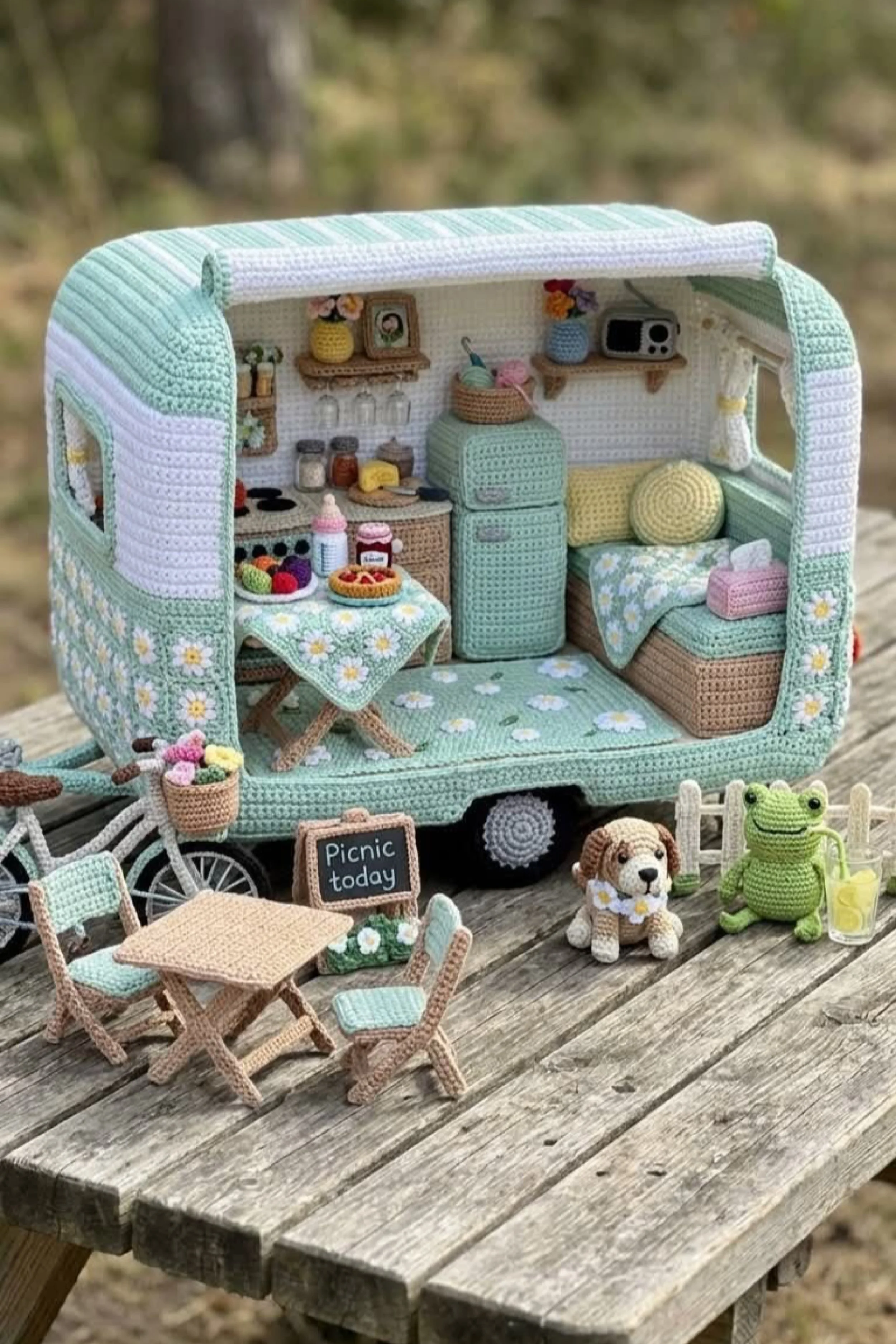 This crochet camper is a tiny picnic kitchen on wheels, styled in soft mint and cream with cheerful daisy details that make everything feel like spring. Inside, a petite kitchenette wraps around the back wall with shelves, jars, and tiny cookware, plus a retro fridge that anchors the scene like a real micro cabin. A small table draped in a daisy cloth sets the picnic mood, complete with tiny food details and a sweet, homey sense of comfort. The seating area looks plush and inviting, with pillows and a blanket that match the floral theme. Outside, the scene extends into a full picnic setup with a little table and chairs, a sign that sets the day’s plan, and adorable companions that add personality without clutter. The whole build feels light, clean, and airy, like a cottage picnic turned into a miniature world. It is charming, readable, and packed with tiny details that make it feel like a real day out.