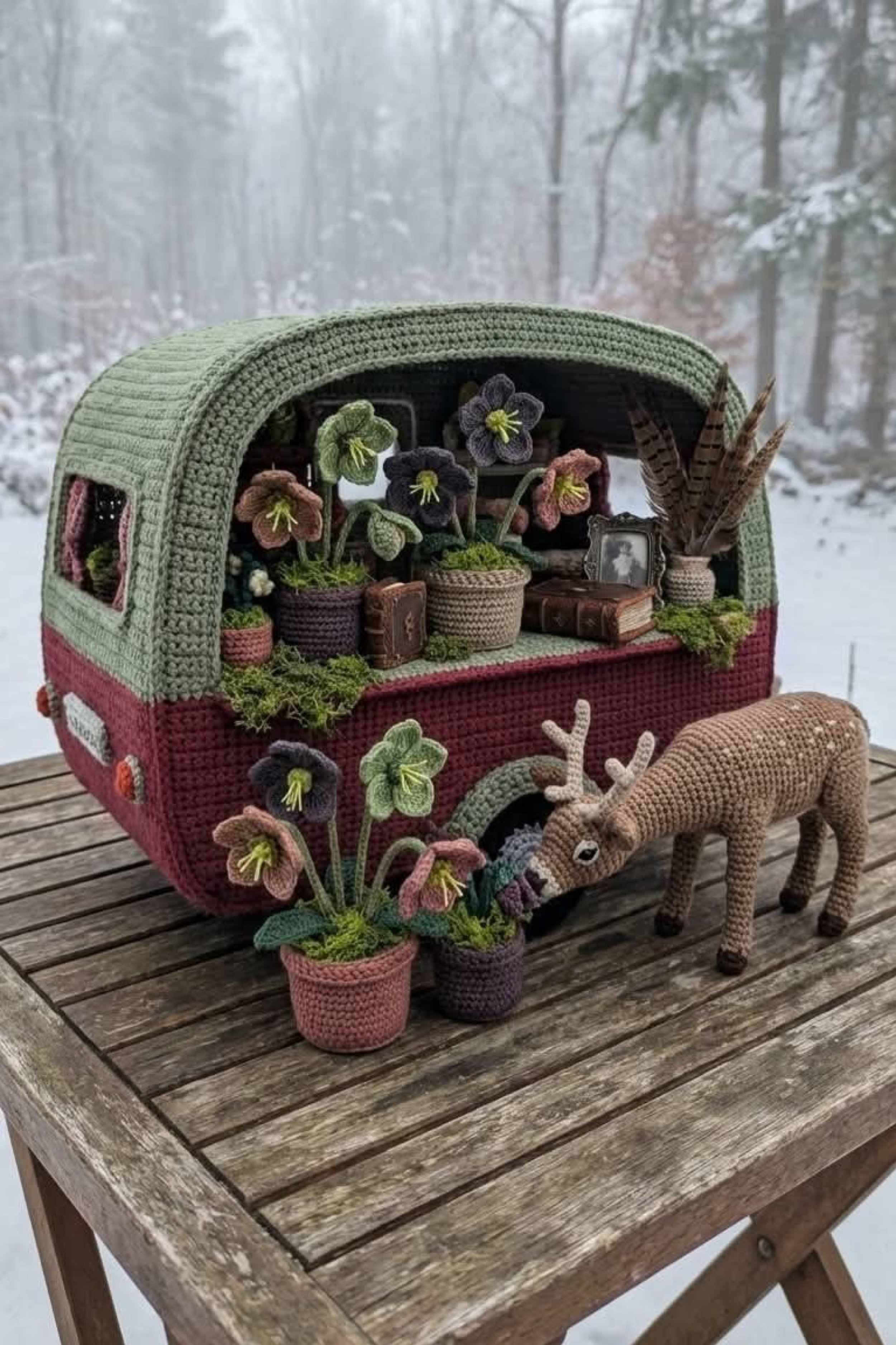 This crochet camper feels like a tiny forest cabin scene, set against a snowy backdrop with deep moss green and burgundy stitches that look perfectly seasonal. The back opens like a woodland display window, filled with crocheted plants and moody winter florals that feel like hellebores or wild blooms tucked into mossy arrangements. Small books and little decor objects give it a quiet, collected personality, like a miniature naturalist’s traveling nook. The textures feel extra rich in this one because the snowy background makes every stitch stand out, and the muted palette reads calm and earthy. The reindeer companion brings a gentle storybook energy, like a forest friend visiting the camper’s tiny garden shelf. Overall, it feels like winter cottagecore, part greenhouse, part reading nook, with a serene mood that is totally different from the bright summer scenes. It is subtle, atmospheric, and perfect for seasonal styling.