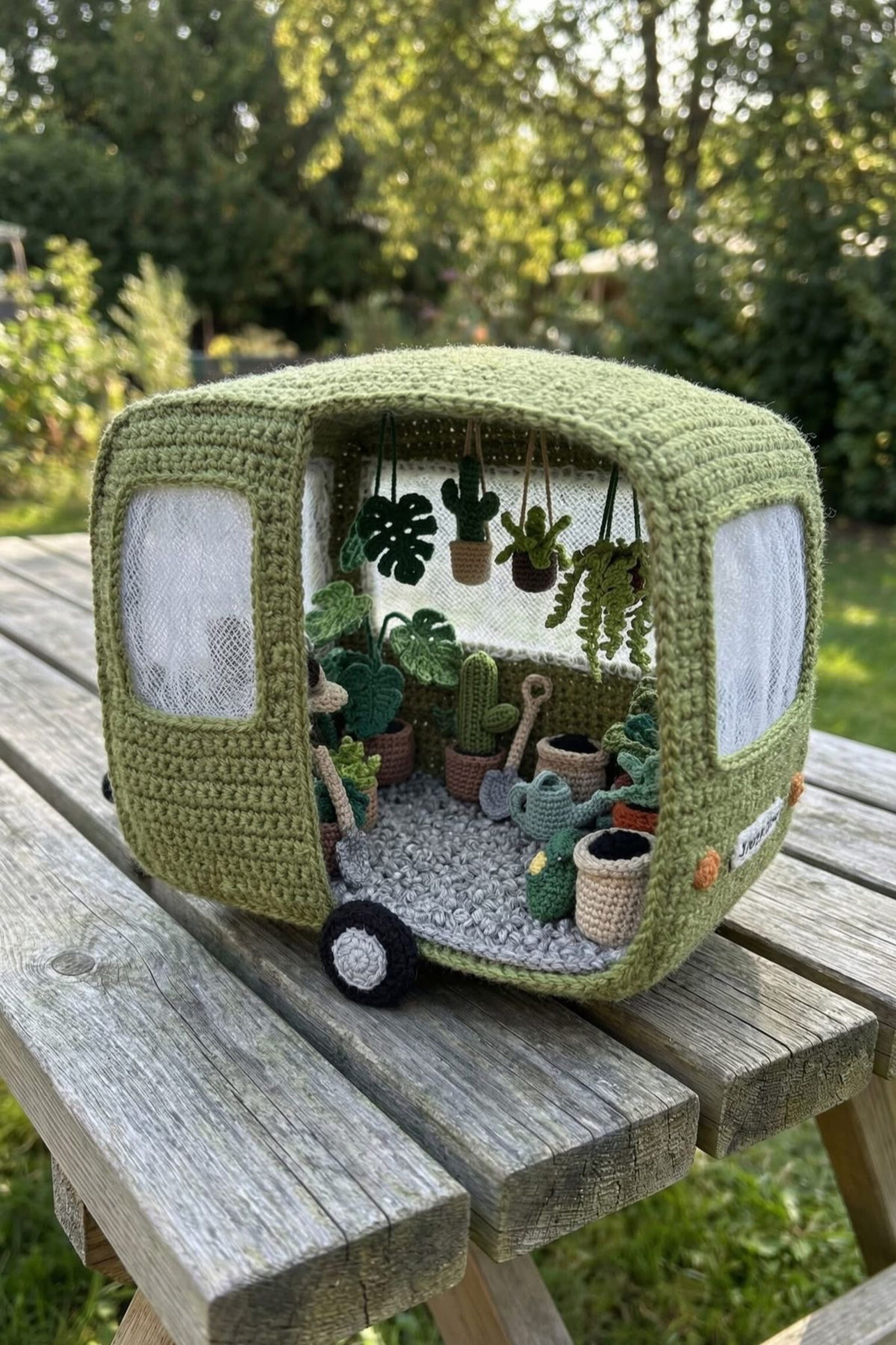This crochet camper is a tiny plant room on wheels, wrapped in soft olive green and opened wide like a miniature greenhouse. Inside, everything is arranged with that calm houseplant lover energy: hanging planters sway from the ceiling, leafy cuttings crowd the corners, and little pots line the floor like a curated propagation station. The window panels feel airy and bright, letting the greenery take center stage while the stitched textures keep it cozy and handcrafted. The plants are a mix of bold leaf shapes and compact cactus silhouettes, so the scene reads like a real indoor jungle even at miniature scale. The pebble toned floor adds a grounded, natural base that makes the greens feel richer and more realistic. It is simple, soothing, and beautifully styled, the kind of piece that looks like it belongs beside a sunny windowsill, a stack of garden books, and a mug of tea. Every detail feels intentional, from the little tools to the varied pot sizes, giving the camper a lived in, plant parent personality.