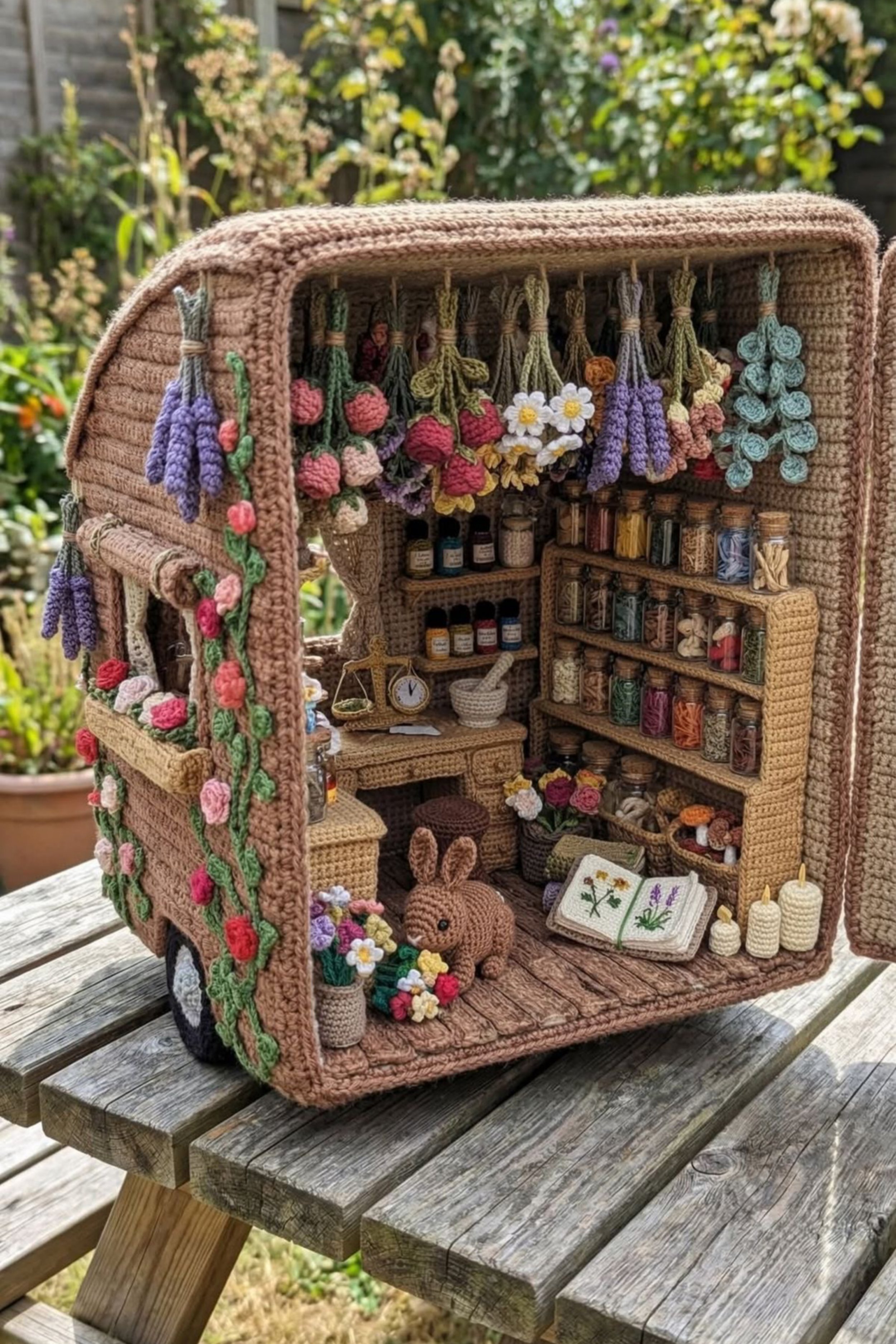 This tiny crochet van feels like a portable garden shop you could stumble upon at golden hour. The whole scene is wrapped in warm oat and cocoa stitches, with a cozy open side that frames a miniature workroom. Bundles of lavender and herbs hang in neat rows like a real drying rack, and the shelves are packed with little jars that look ready for tinctures, teas, and spice blends. A petite worktable, a mortar and pestle, and a scatter of blossoms make it feel lived in, like someone just stepped away to greet a customer. The floral vines climbing the exterior add storybook charm, and the wooden plank style floor grounds all the sweetness with a rustic texture. The tiny bunny tucked near the blooms gives it instant personality, like a gentle shop mascot. Overall, it reads as cottagecore meets craft obsession, with the kind of detail that makes you lean closer and keep finding new surprises.