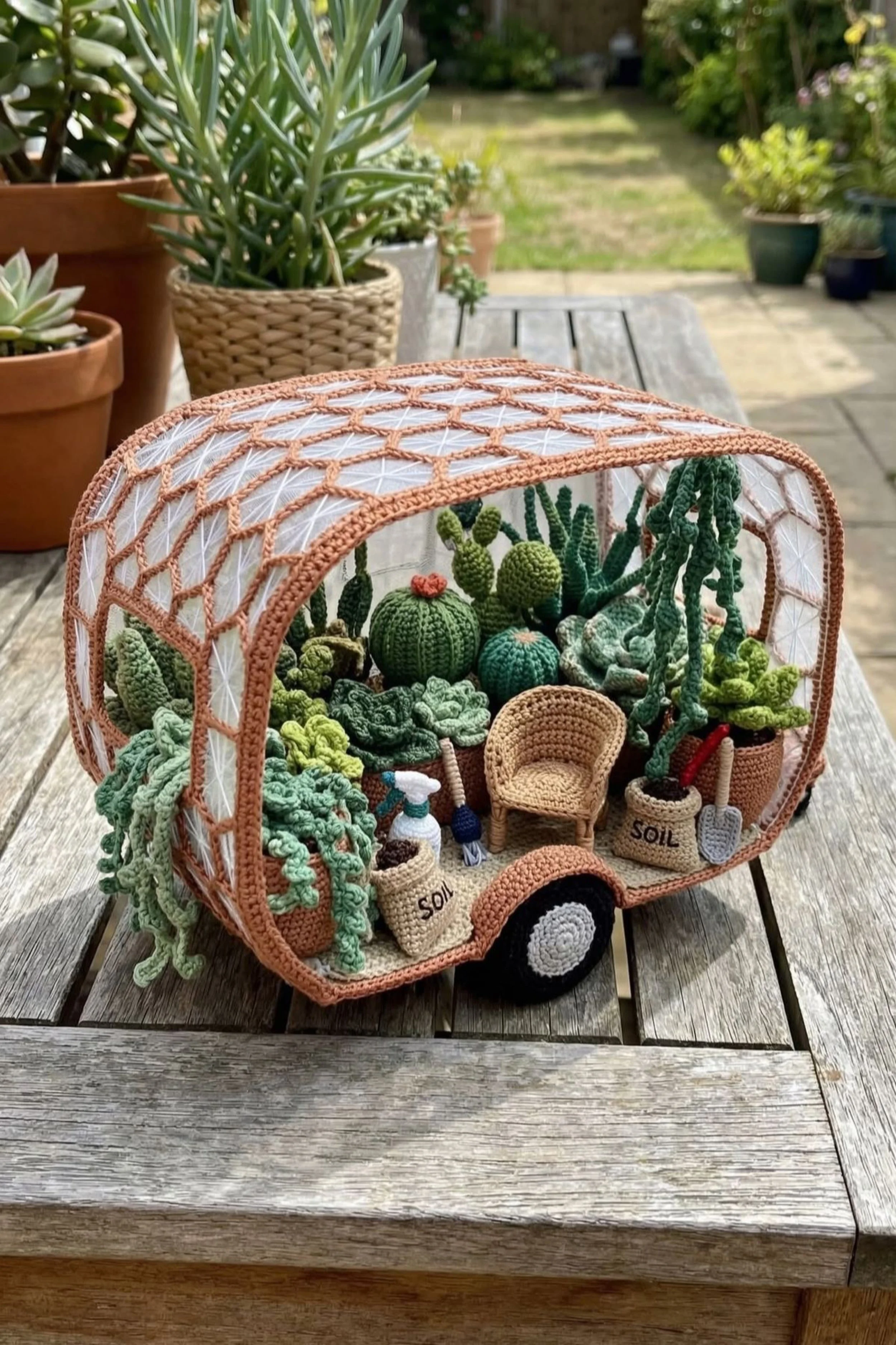 This crochet trailer looks like a tiny succulent conservatory, built with a warm copper frame and a translucent greenhouse shell that lets the plants glow. Inside, a lush collection of crocheted succulents and cacti fills the space like a miniature desert garden, with chunky textures, varied greens, and dramatic silhouettes. The styling is clever and realistic, right down to the little bags labeled for soil and tools, giving the scene a working greenhouse energy rather than a purely decorative diorama. A small chair tucked inside makes it feel like a place someone would actually sit and tend their collection, and the trailing plant details spilling over the side add movement and softness. The overall vibe is warm, earthy, and modern, like a curated plant shop display you would see in a design store. It is satisfying to look at because the shapes are dense and layered, but still organized and clean.