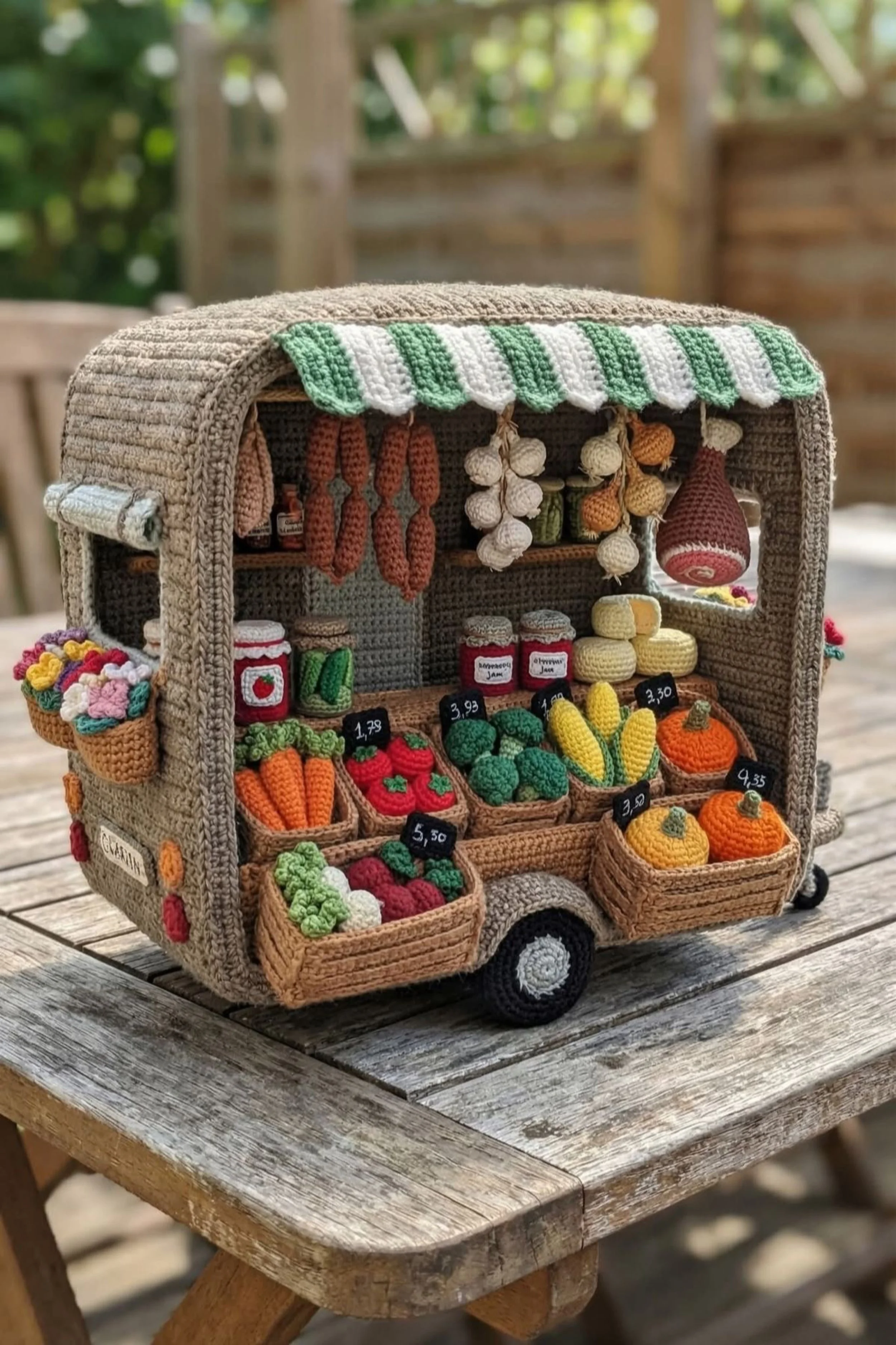 This crochet market truck looks like a Saturday morning pop up, complete with a striped awning, hanging garlic, and baskets of tiny produce lined up like a fresh harvest display. The palette is grounded and cozy, with earthy neutrals, bright carrots, tomatoes, greens, and pumpkins that feel perfectly abundant. Small price tags add that charming market realism, and the interior shelves hold little jars like preserves and pickles, giving the scene a pantry fresh vibe. It is the kind of miniature that instantly reads as wholesome and handcrafted, with enough detail to feel like a complete world in one frame. The structure is sturdy and boxy like a real food truck, but the crochet texture makes everything soft and inviting. It feels like a celebration of slow living, homegrown goodness, and the joy of arranging little baskets until everything looks just right.