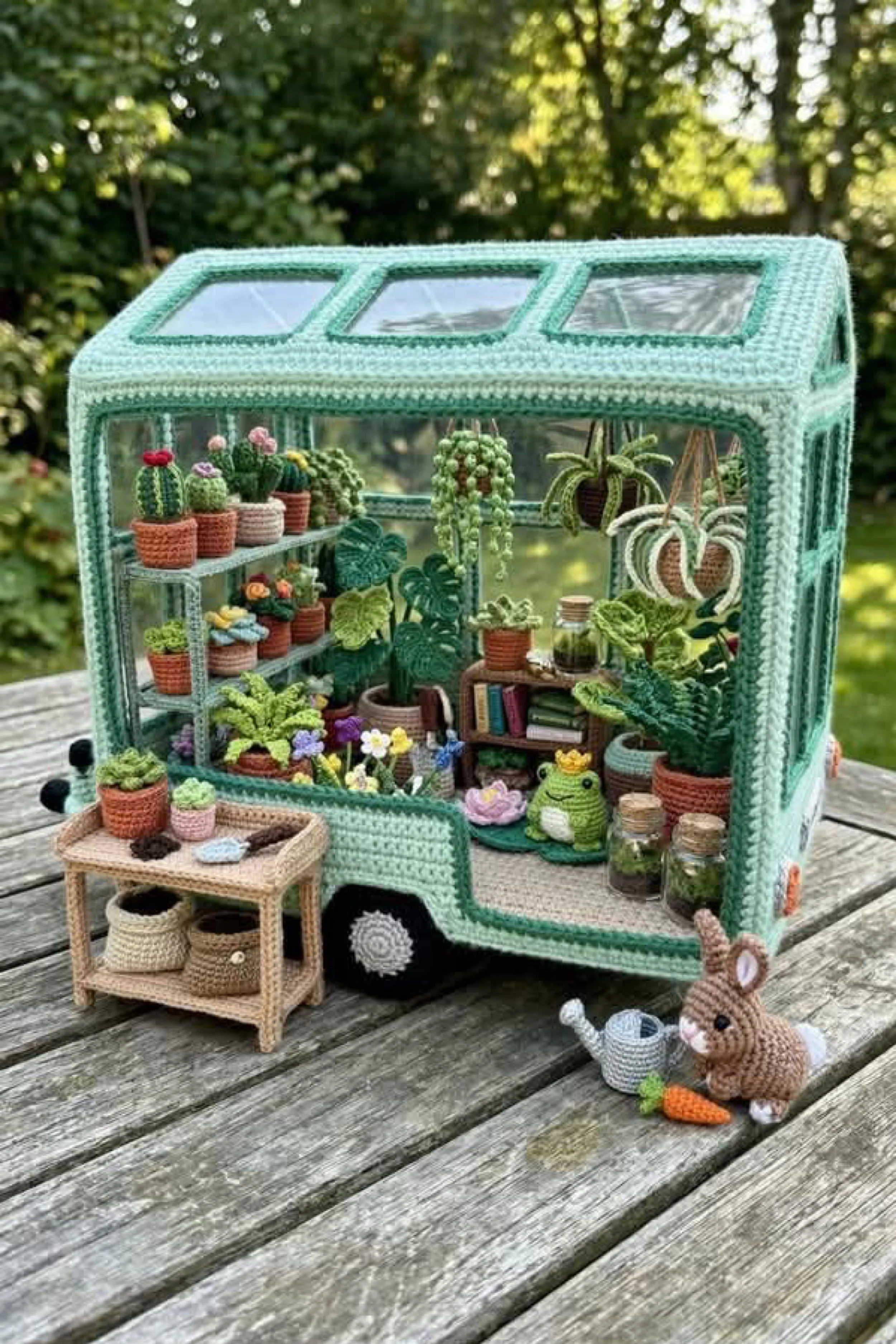 This crochet greenhouse van looks like a rolling conservatory, crisp and bright with a mint stitched frame and clear window panels that show off a jungle of tiny plants. The interior feels like a miniature plant studio, complete with shelves of potted succulents, leafy vines, and a few statement shapes that read like monstera and trailing varieties. The scene is tidy but abundant, the way a real plant lover keeps things, with little jars and books tucked in like practical tools for care and inspiration. The outdoor work table adds realism, suggesting potting sessions and repotting rituals, and the tiny bunny companion makes it feel playful rather than museum perfect. The palette is fresh and clean, with soft earth pots and green tones that instantly say spring and growth. It captures that dreamy fantasy of having a greenhouse on wheels, stopping wherever the light is best and making your own pocket paradise.