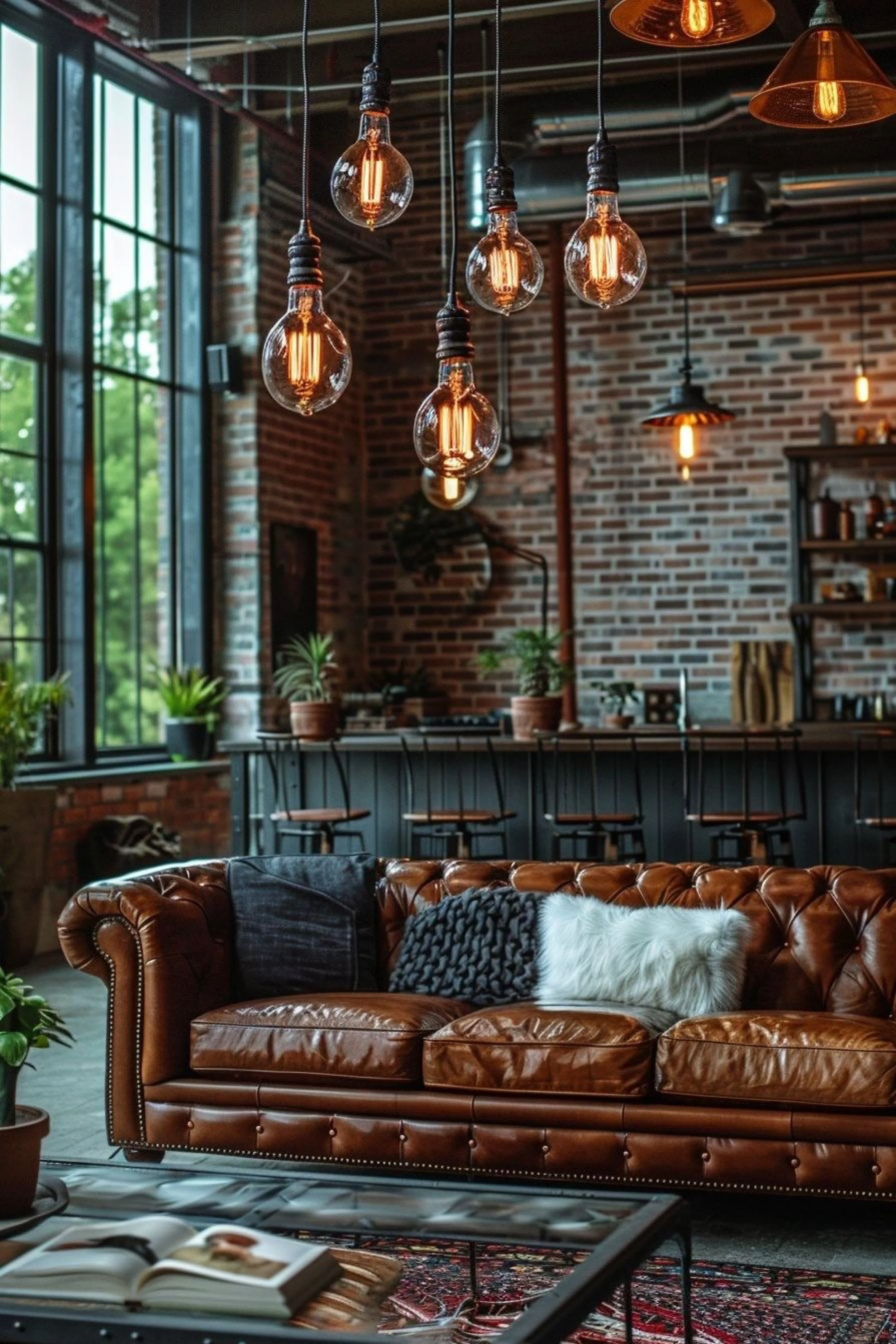 This industrial loft scene is all about warm light and classic leather. Oversized grid windows bring in soft daylight, but the real mood comes from the cluster of Edison bulbs hanging overhead, turning the room into a cozy amber glow once evening hits. Exposed brick and visible ductwork keep the space true to its warehouse roots, while the cognac Chesterfield sofa adds that timeless club feel that makes industrial look instantly elevated. A patterned rug grounds the seating area and keeps the concrete from feeling cold. In the background, a long counter and bar style shelving create an entertaining zone that feels practical and social without stealing focus. Small plants along the sill and counter soften the hard lines and add a hint of green against the brick. The styling is simple but intentional, with a few textured pillows that break up the leather and make it feel inviting. It reads like a city loft made for conversation, playlists, and long nights that start in the kitchen and end on the sofa.