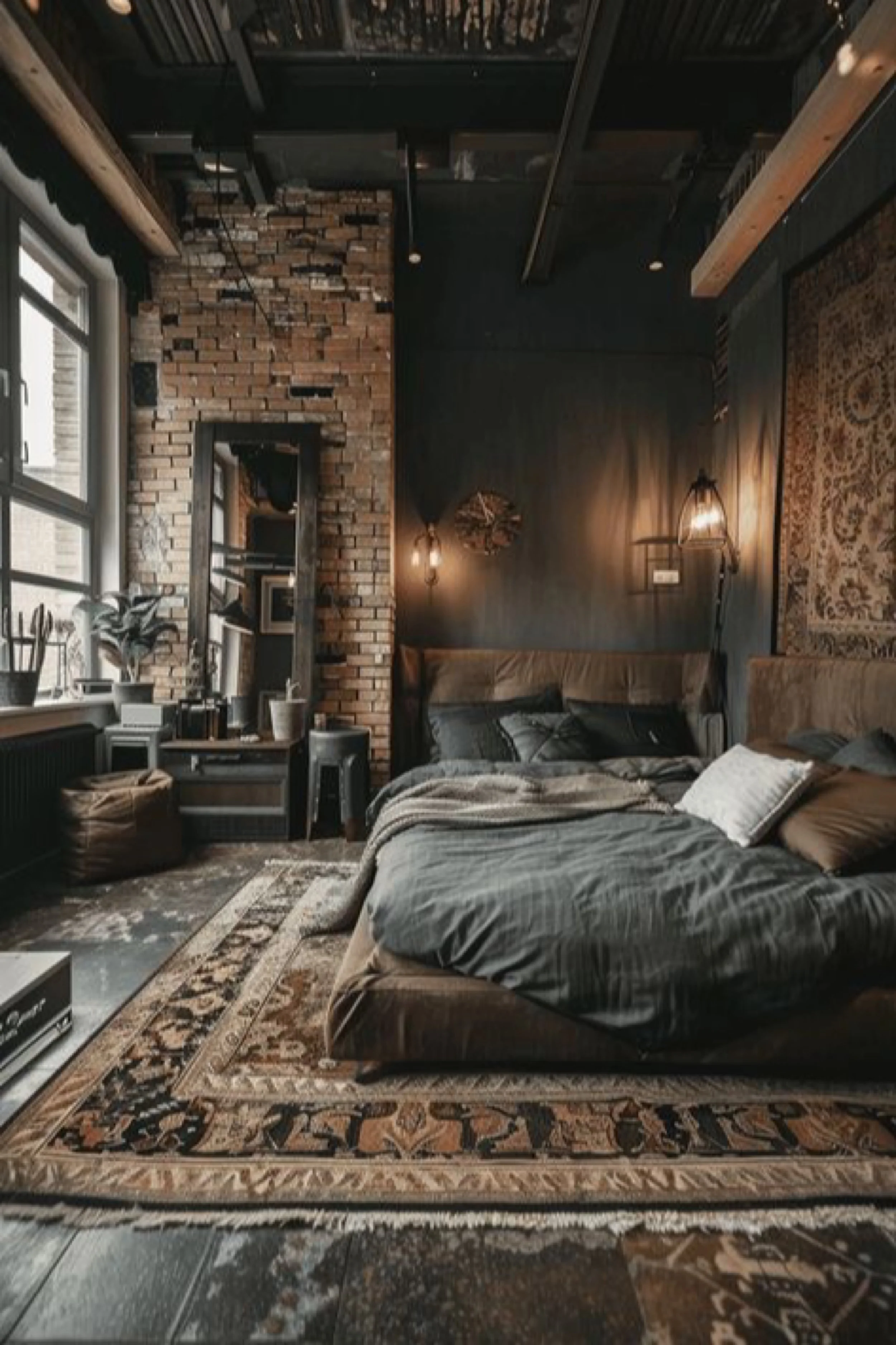 This industrial loft bedroom feels quiet, moody, and deeply personal, like a calm cocoon inside a city building. Dark walls and exposed brick create a grounded, intimate atmosphere, while the large window keeps the space from feeling closed in. The bed sits low and relaxed, dressed in charcoal bedding with soft layers that look effortless and lived in. A large textile wall hanging adds pattern and warmth, balancing the harder materials and making the room feel curated without being busy. Lantern style sconces cast warm pools of light that flatter brick and wood, and the floor is layered with vintage rugs that soften sound and add depth. A tall mirror leaning near the window reflects light and expands the room visually, while a few plants and simple objects keep the styling minimal. The overall effect is modern industrial, but gentle, with warmth coming from texture rather than bright color.