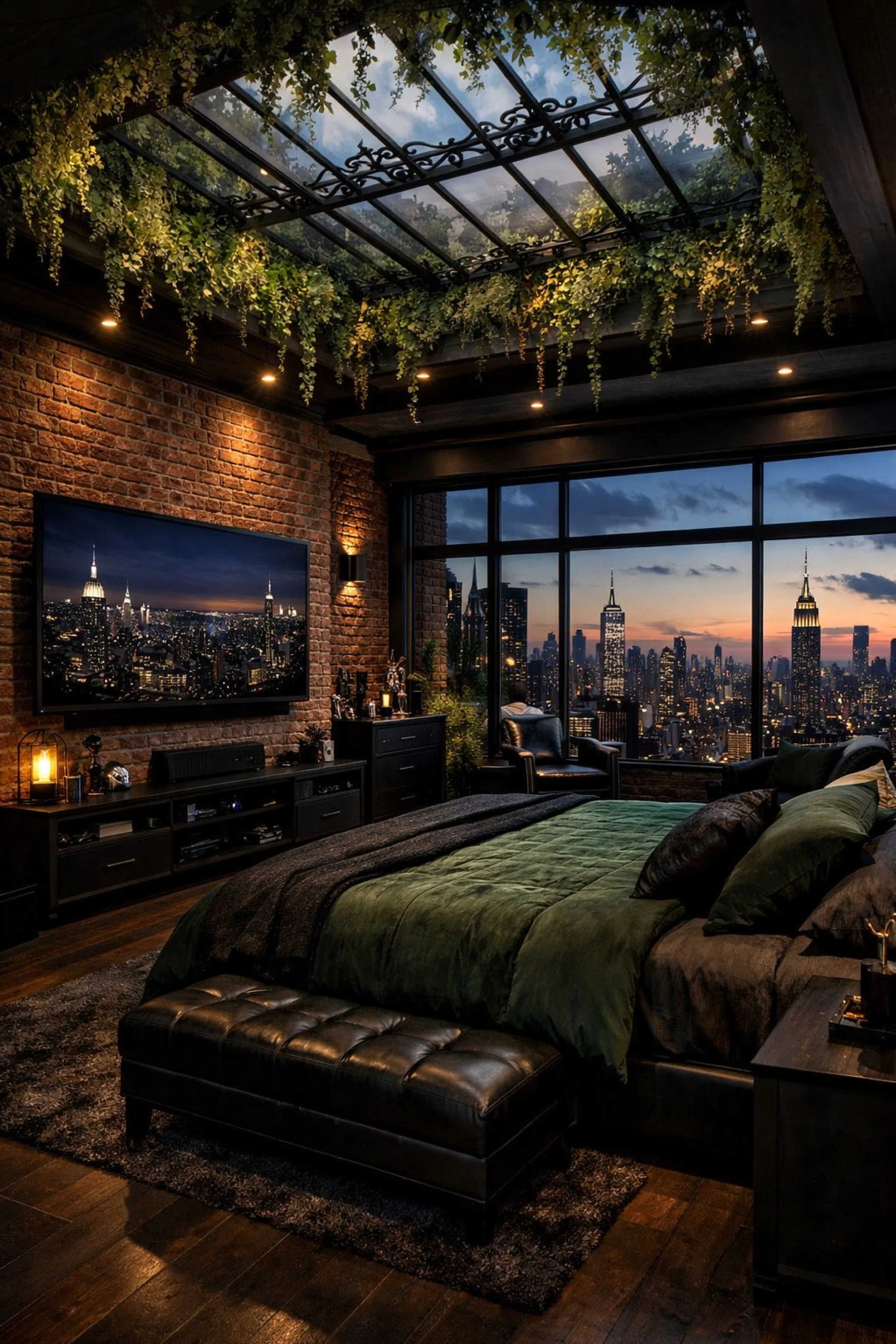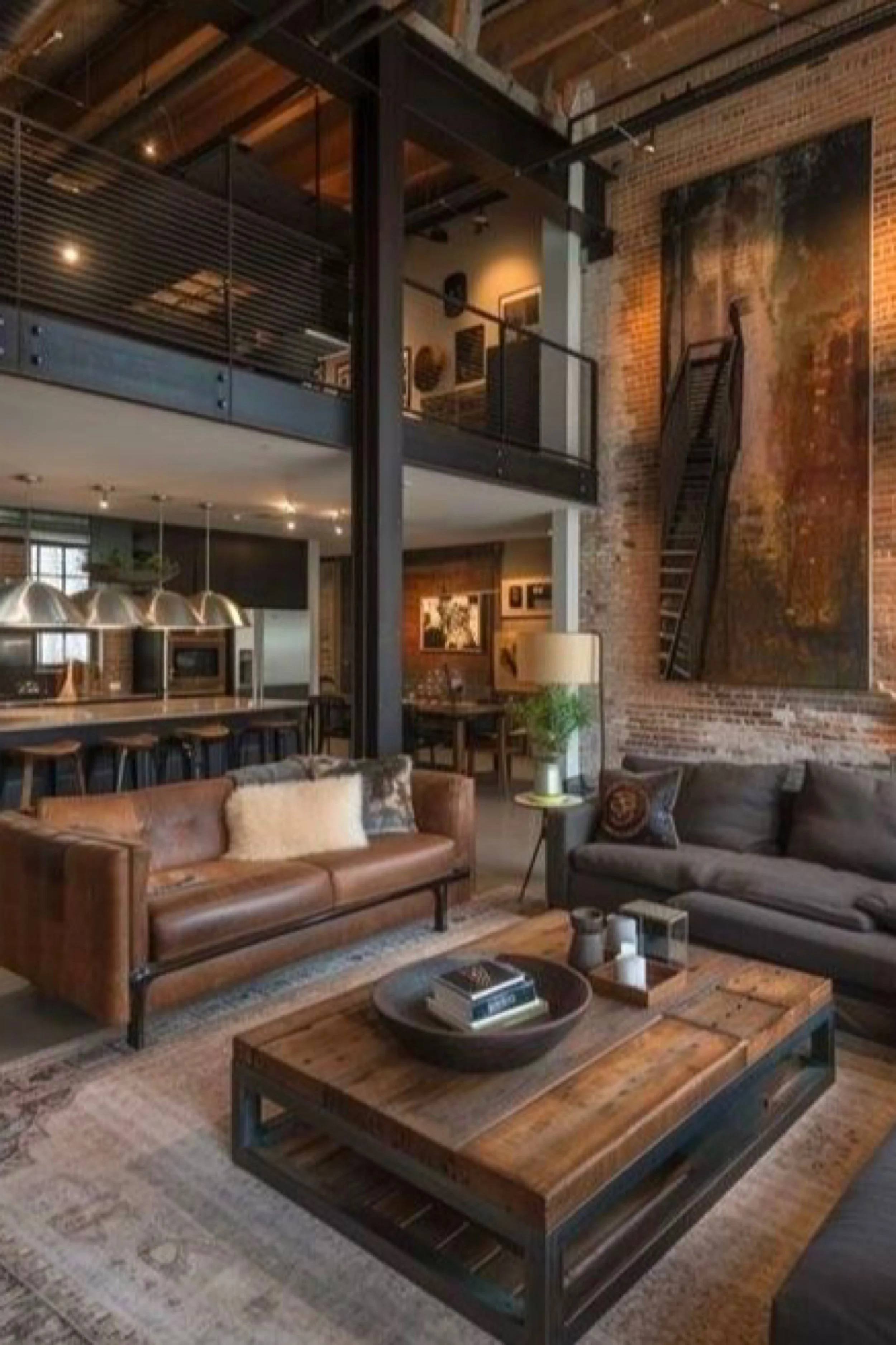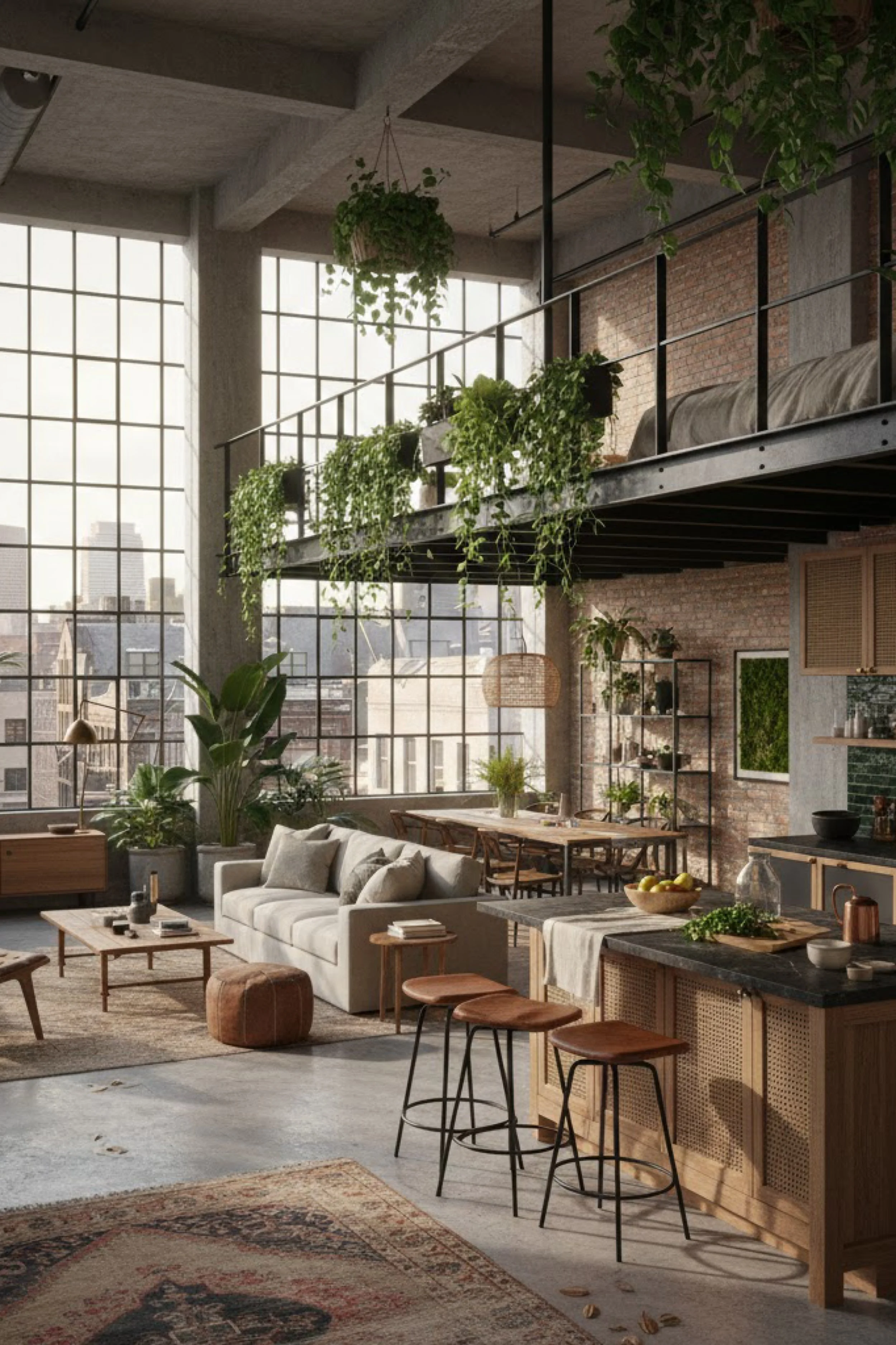 This loft blends classic industrial bones with a cozy, collected feeling. Exposed brick brings instant warmth and a sense of history, while the tall grid windows flood the room with soft city light. A long dining table sits near the windows like a communal anchor, and the lounge zone feels layered and inviting with rugs, textured upholstery, and warm leather accents. Hanging plants and trailing vines add a relaxed, lived in mood that plays beautifully against the steel railings and concrete ceiling. The overall styling is grounded in natural materials, wood, woven shades, linen, and greenery, so the space feels comfortable and personal rather than stark. It is the kind of loft that looks impressive at first glance, but the longer you stare, the more you notice the small cozy details that make it feel like home.