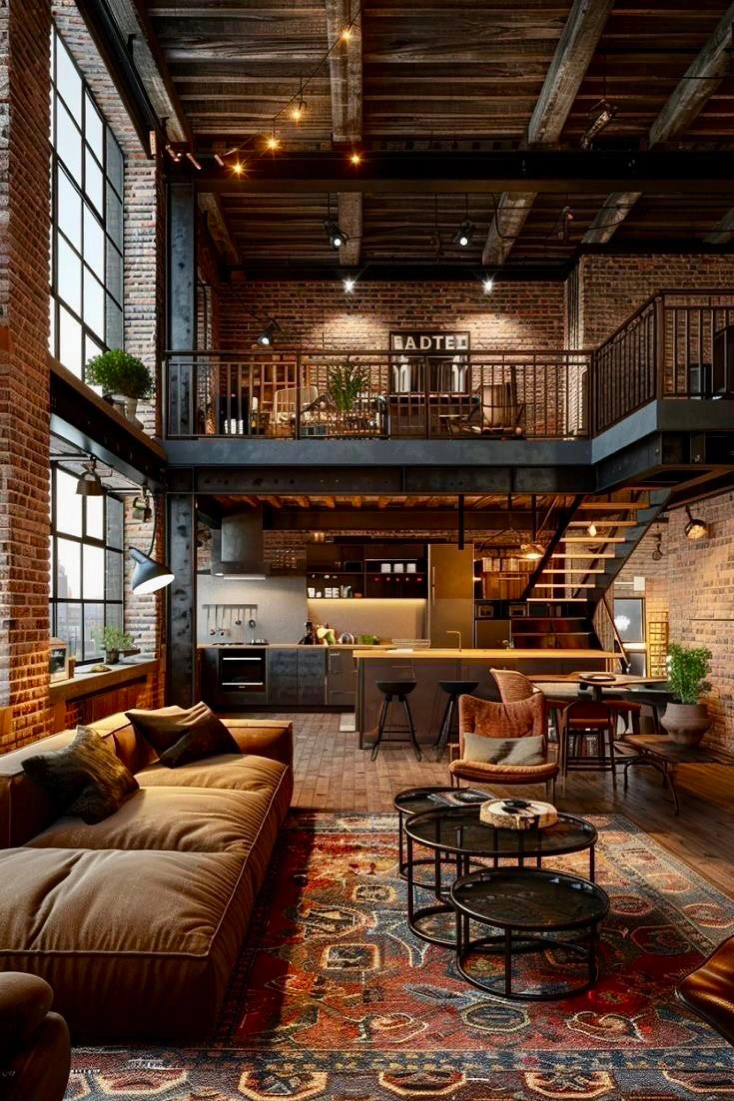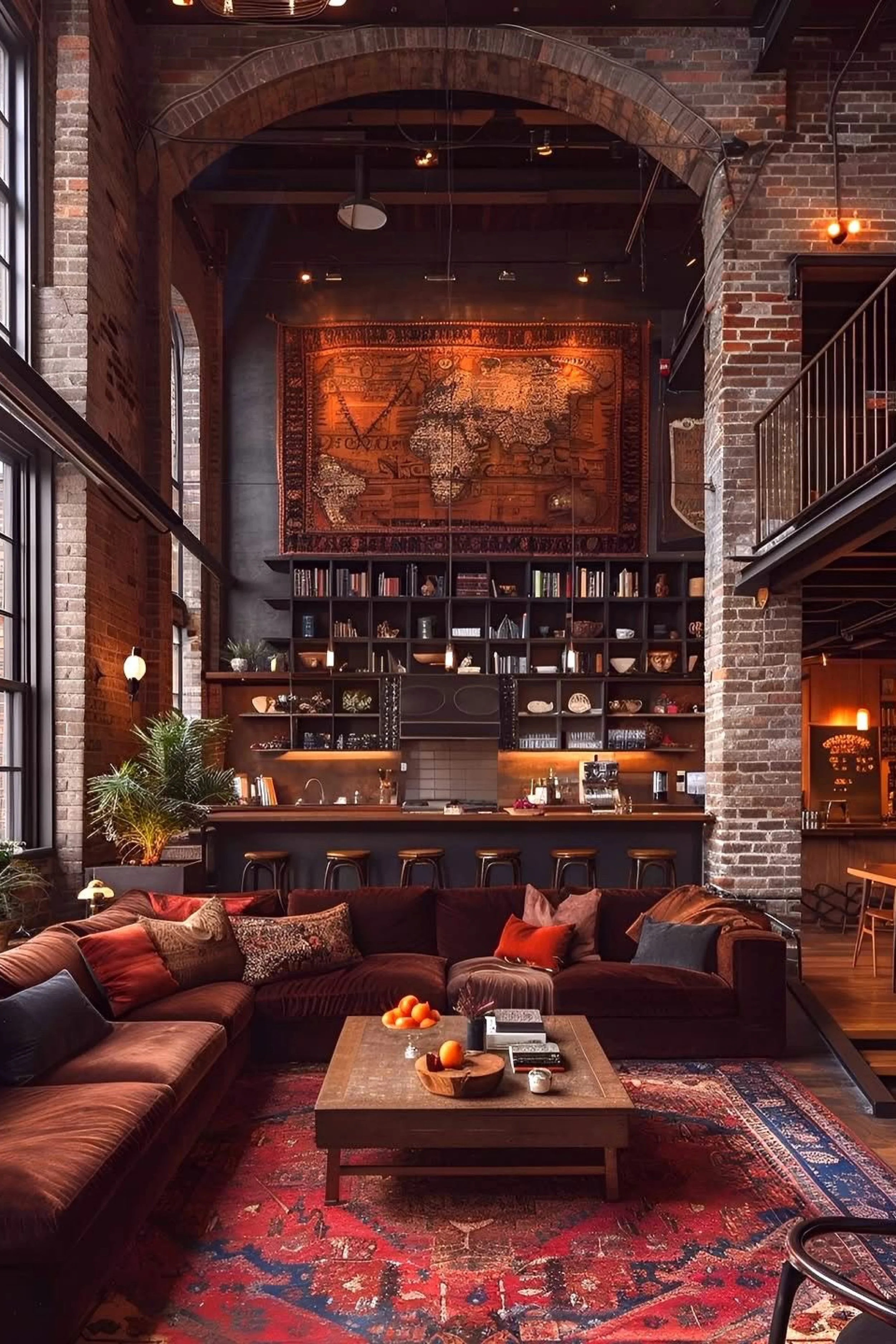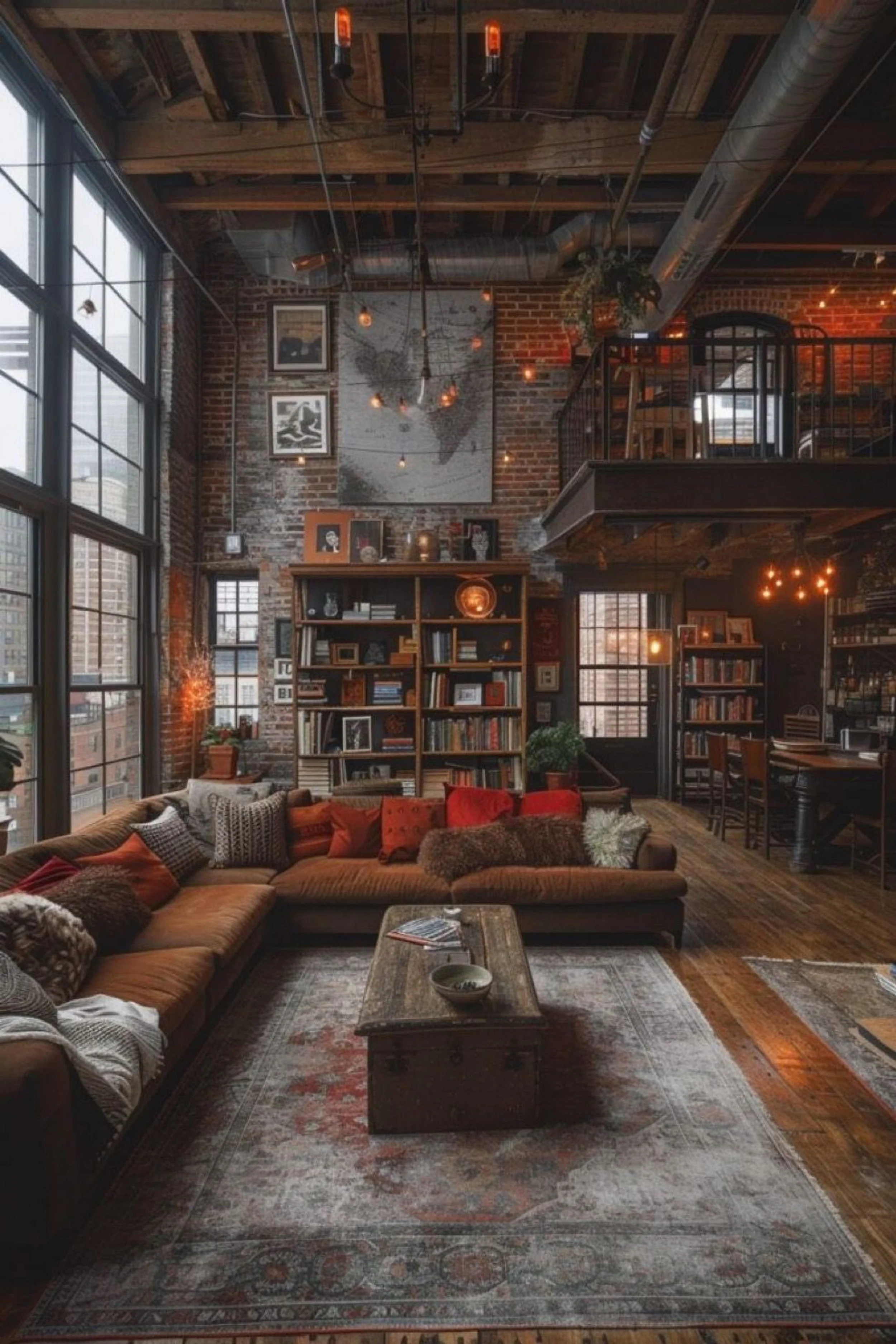 This industrial loft great room feels like a warm library lounge inside a city warehouse. Massive grid windows flood the space with natural light and frame the skyline, while exposed brick and timber ceilings bring instant texture and soul. A large map artwork anchors the wall above a tall bookshelf, giving the room a collected, travel inspired personality. The seating area is generous and cozy, layered with pillows in warm reds and soft neutrals that echo the brick and wood tones. Overhead, warm pendant lights and small glowing bulbs add that amber ambiance that makes industrial spaces feel inviting rather than cold. The mezzanine level creates depth and adds that classic loft drama, while the dining and bar zone in the back feels ready for hosting. It is a space that balances scale and comfort, with enough warmth, texture, and light to feel like home, not a converted warehouse showroom.