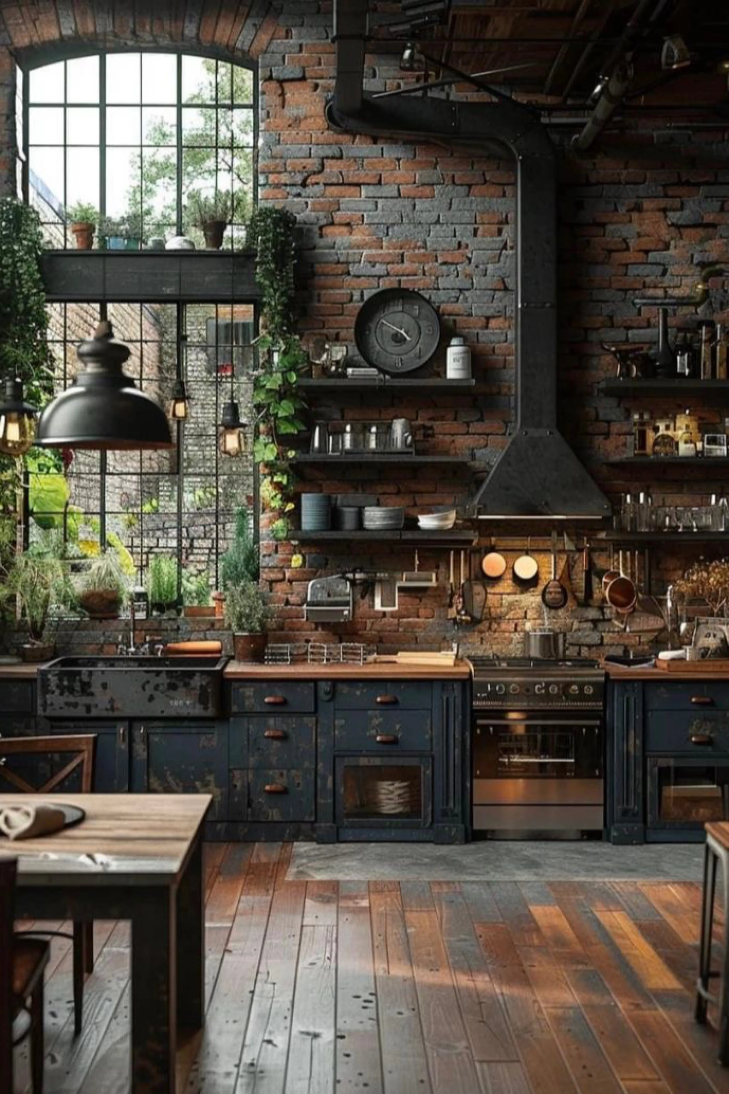 This industrial loft kitchen feels like a converted workshop, warm, rugged, and full of texture. The brick wall is uneven and beautifully imperfect, giving the space instant depth and a sense of history. A tall black hood and exposed ducting bring that utilitarian factory energy, while the patina blue cabinetry adds a timeworn charm that feels collected rather than new. Open shelves hold stacks of dishes and glassware like a working studio, and the large industrial sink at the window makes the view feel part of the daily rhythm. Wood floors add warmth and soften the hard edges, especially when paired with matte black metal accents and warm under shelf lighting. Plants climbing near the window introduce an easy freshness that balances the heavy materials. The whole room feels grounded and real, like you could cook for hours, host late, and never worry about it being too precious.