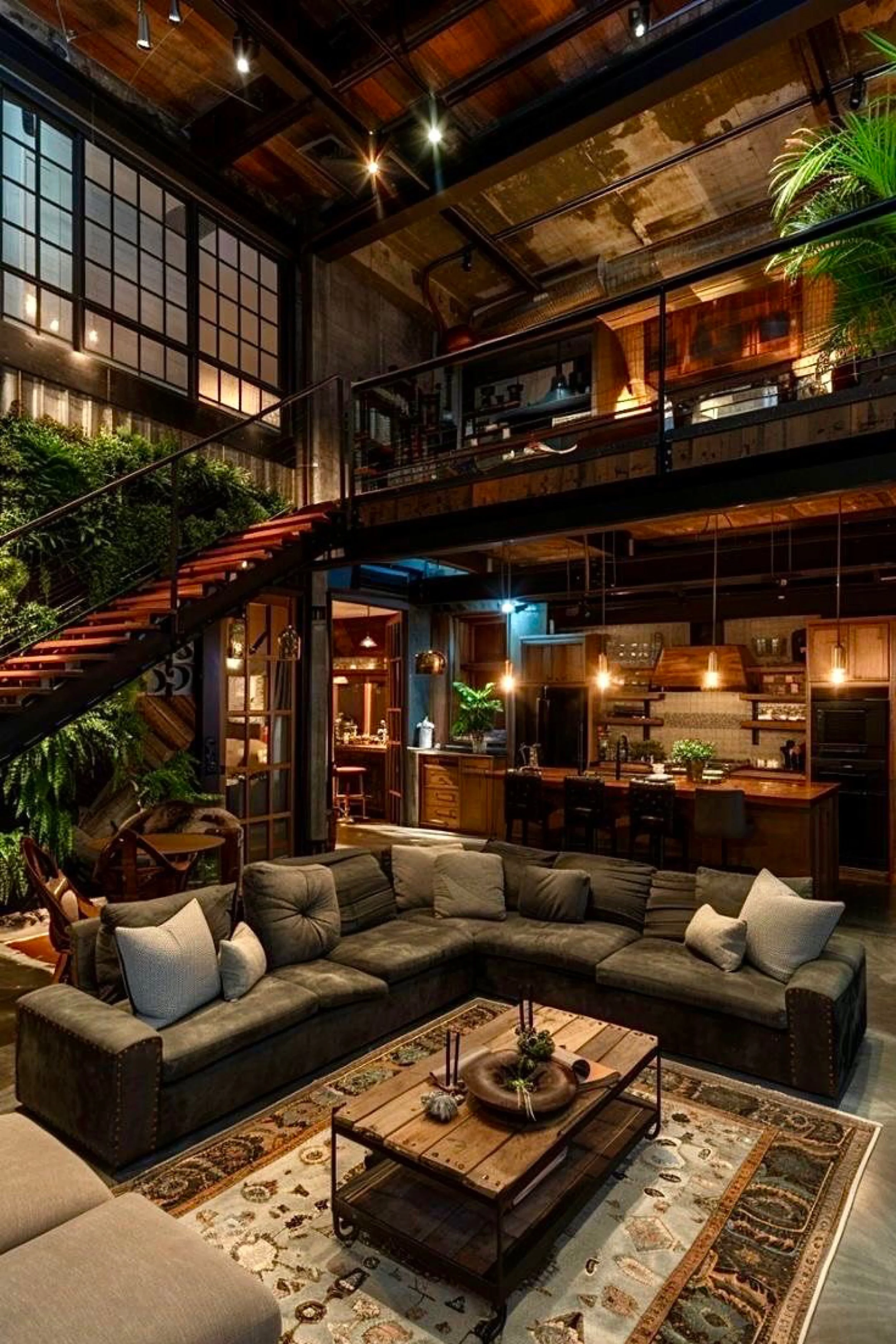 This industrial loft feels like a winter greenhouse meets warehouse chic. A dramatic living wall and lush greenery along the staircase soften the steel structure and instantly make the space feel alive. The layout is classic loft, double height windows, a mezzanine level, and an open entertaining zone that blends kitchen and lounge seamlessly. Warm wood cabinetry and shelving bring richness against the darker structural elements, and low pendant lights cast a golden glow over the island and bar seating. The oversized sectional creates a relaxed anchor for the living area, and the layered rug under the coffee table adds comfort and pattern without overwhelming the room. Up top, the mezzanine feels like a private retreat, while the plants visually connect the levels and make the whole loft feel cohesive. It is dramatic, cozy, and social all at once, a space designed for hosting, then winding down under soft light and greenery.