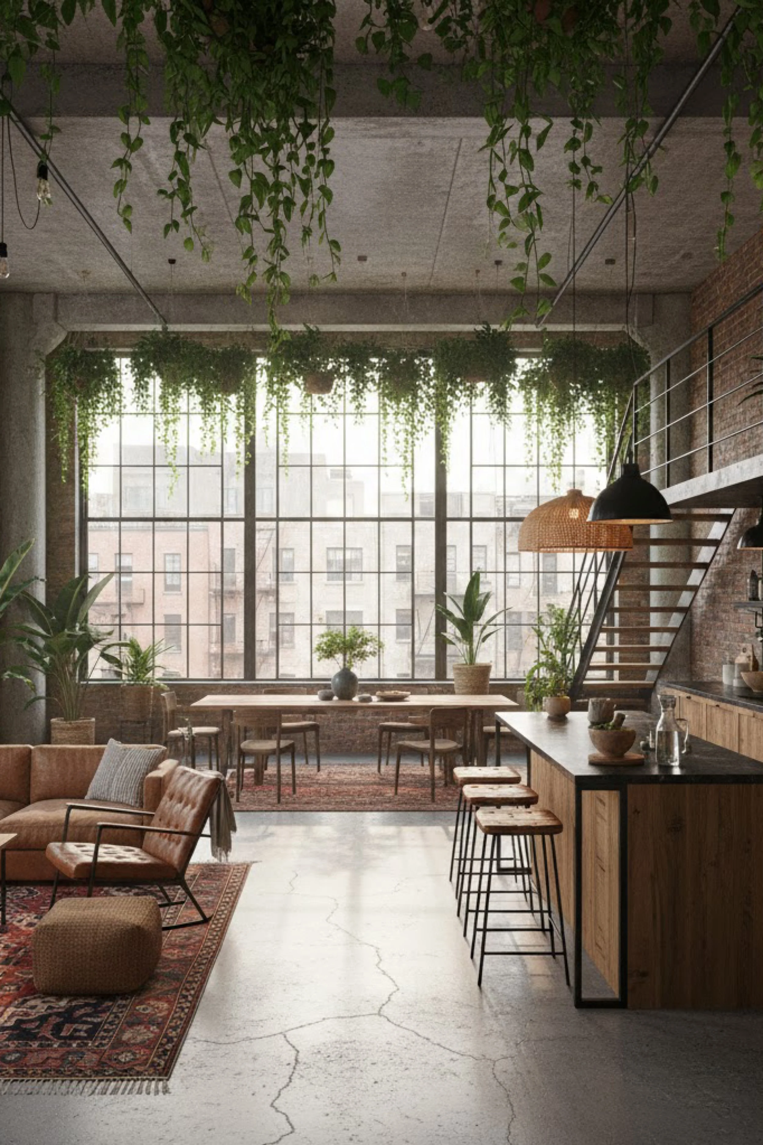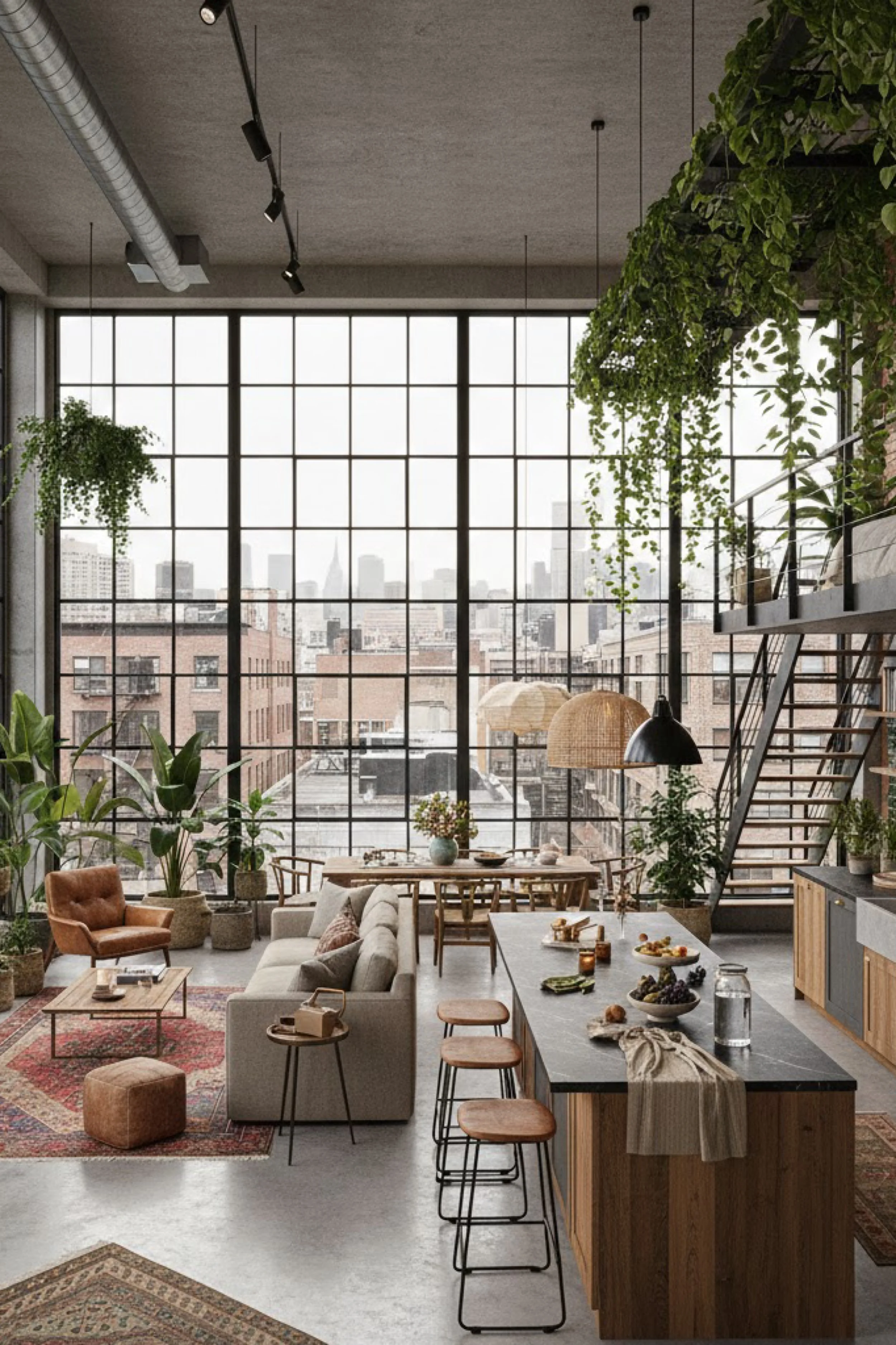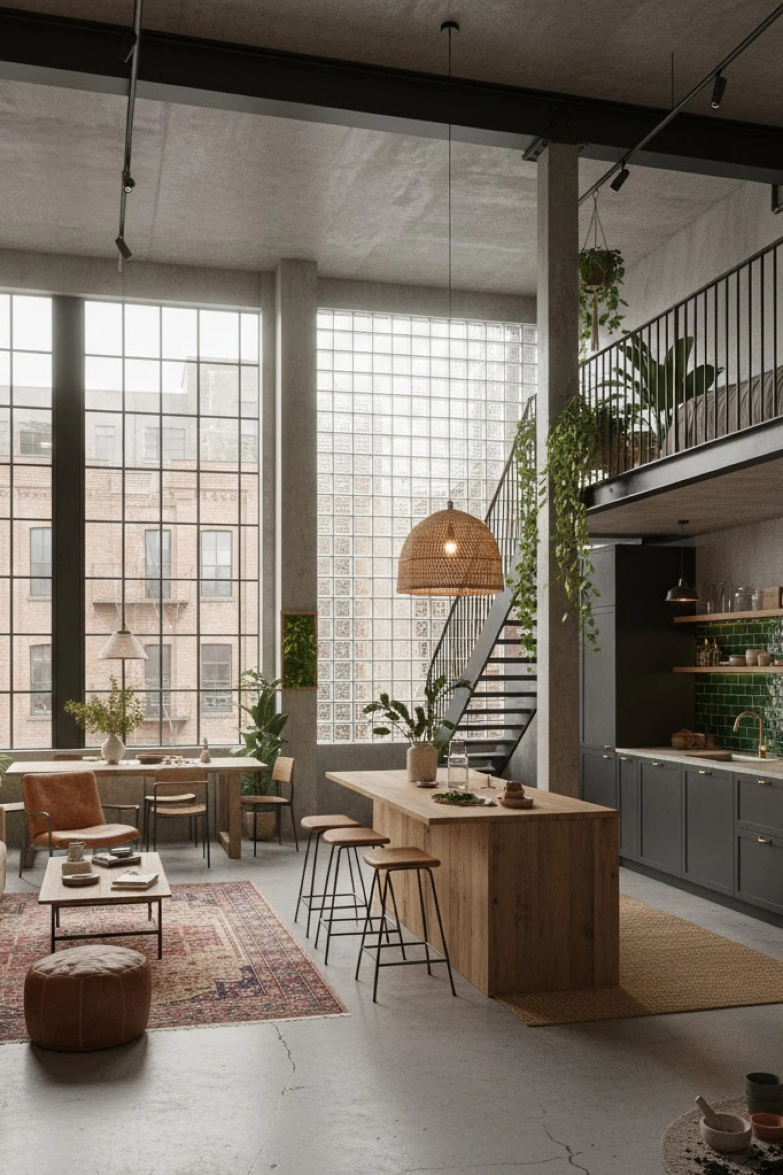 This industrial loft feels like a calm retreat built inside a city shell. Oversized grid windows and a glass block wall turn daylight into a soft, diffused glow that smooths out the concrete and steel. The space is open, but it reads intentional, with a warm wood island style work surface that anchors the room and keeps the scale human. Charcoal cabinetry and black railings add graphic structure, while woven lighting brings in an easy, tactile softness. Vintage rugs layer warmth over the polished concrete, creating distinct zones without closing anything off. Greenery is the secret ingredient here, trailing from the stair, perched in corners, and tucked into small moments that make the loft feel lived in rather than staged. The result is industrial, but never harsh, with a balance of texture, restraint, and comfort that invites long mornings and late dinners.