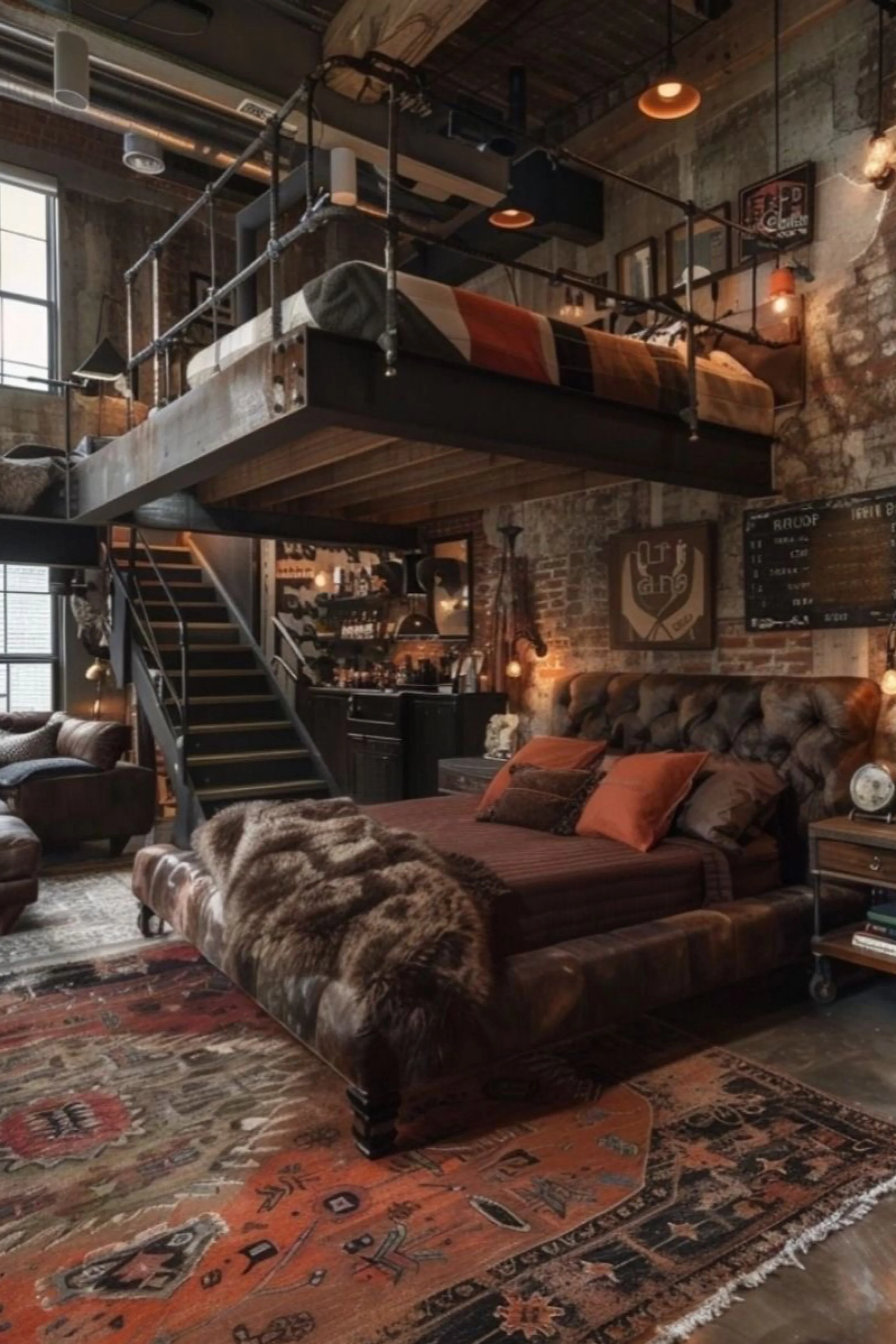 This industrial loft feels like a creative studio that happens to be a home. A tall stair and mezzanine level create strong architectural movement, while the walls are treated like a gallery, packed with layered art that brings color and personality to the industrial shell. The palette mixes brick, dark structural elements, and warm wood flooring, then lets the textiles do the storytelling through a bold vintage rug and patterned pillows. The sofa is simple and modern, which is smart, because it gives the art and rug space to shine without fighting for attention. Warm spot lighting and small fixtures highlight the artwork and create an evening museum mood, while the massive window keeps the room bright during the day. This is the kind of loft that feels curated, expressive, and uniquely personal, with the industrial bones acting like a frame for a collector’s life.