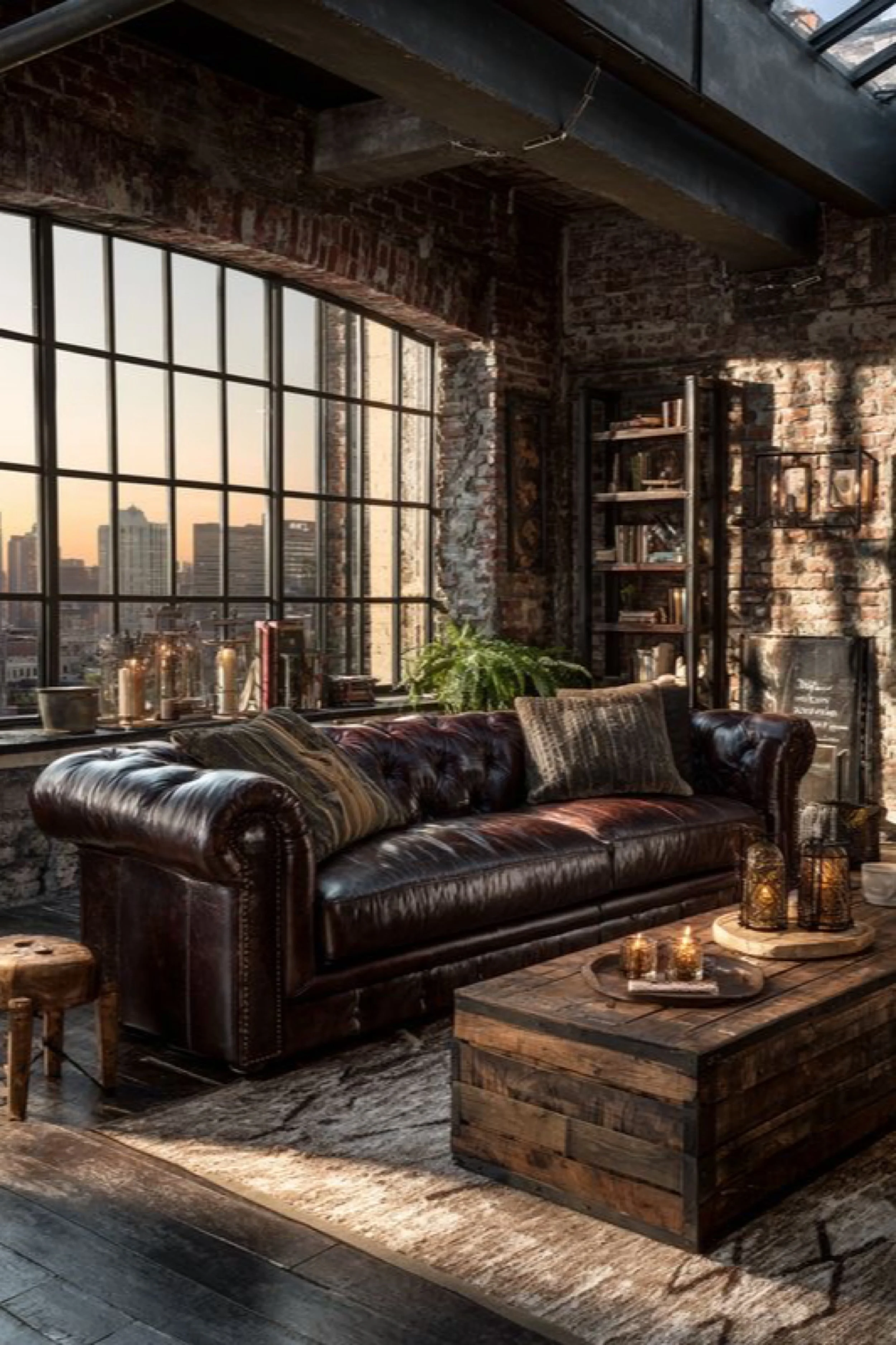 This industrial loft living area captures that perfect golden hour city mood, where light turns brick and steel into something warm and cinematic. A wide grid window frames the skyline, and the low sun washes the room in amber tones that make everything feel richer. The leather Chesterfield sofa is the hero, glossy, classic, and timeless, giving the space a club like elegance that still fits the industrial shell. A chunky wood coffee table adds rugged weight, styled simply with candles and a tray so the atmosphere feels intentional but not fussy. Open shelving and a tall bookcase create vertical texture, while lanterns and candlelight build a soft glow that mirrors the sunset outside. The palette stays restrained, brown leather, weathered wood, brick, and warm neutrals, which makes the room feel cohesive and calming. It is the kind of loft that invites you to slow down, pour something warm, and watch the skyline change.