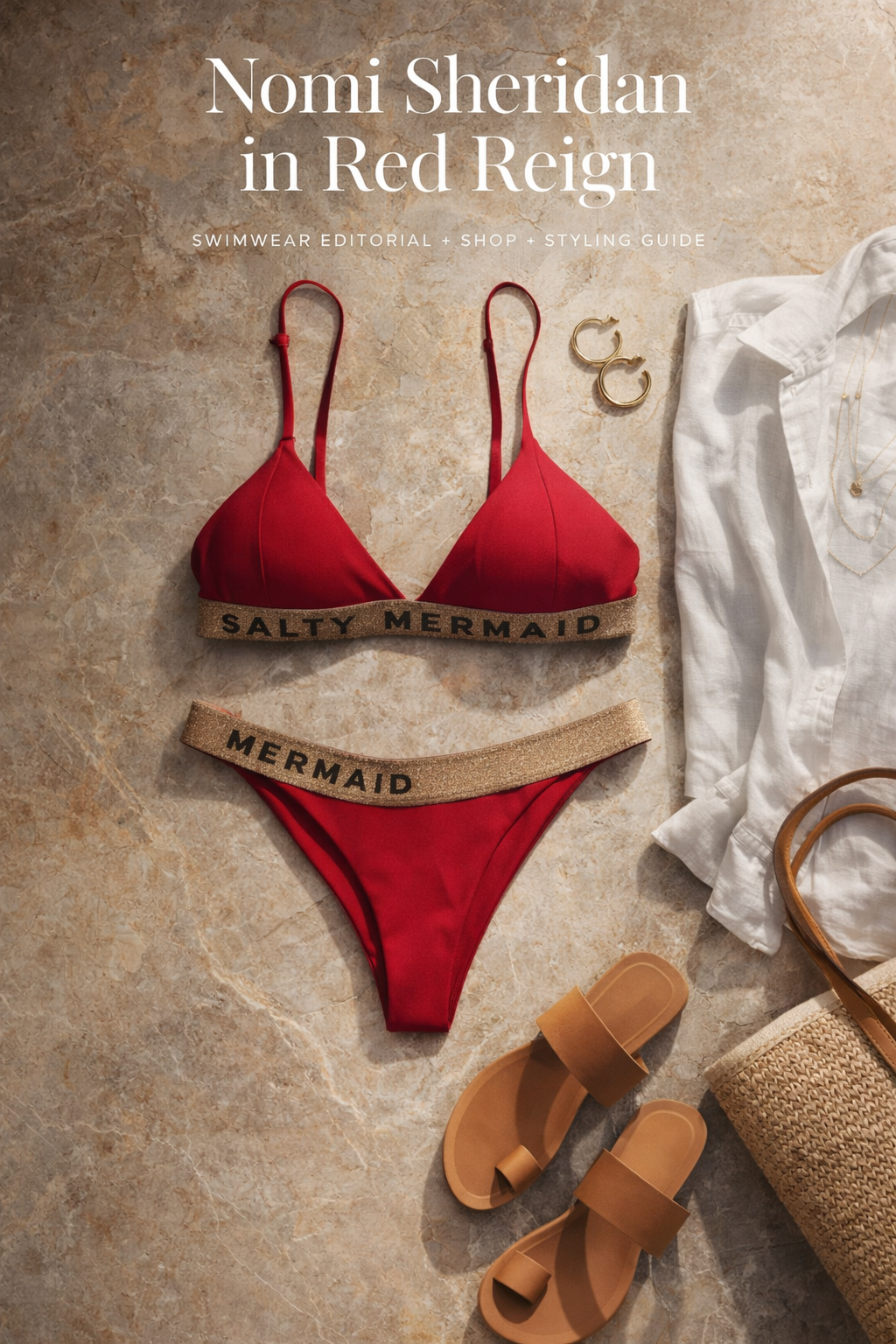 Style Red Reign like a modern villa uniform, crisp pieces, sun ready textures, and just enough polish to feel editorial. Start with an oversized white linen button down, worn open, sleeves pushed up, the easiest contrast to that bold red. Add a sand toned wrap skirt or a sheer mesh sarong for movement, keeping the silhouette long and clean. Footwear should stay simple, leather slides in tan or black, or a minimal strappy sandal if you are going from pool to dinner. Jewelry is where the gold trim gets its echo, think small gold hoops, a slim cuff, or a delicate chain, then stop. For accessories, a structured straw tote keeps it vacation luxe, and a pair of sharp sunglasses makes the whole look feel intentional.