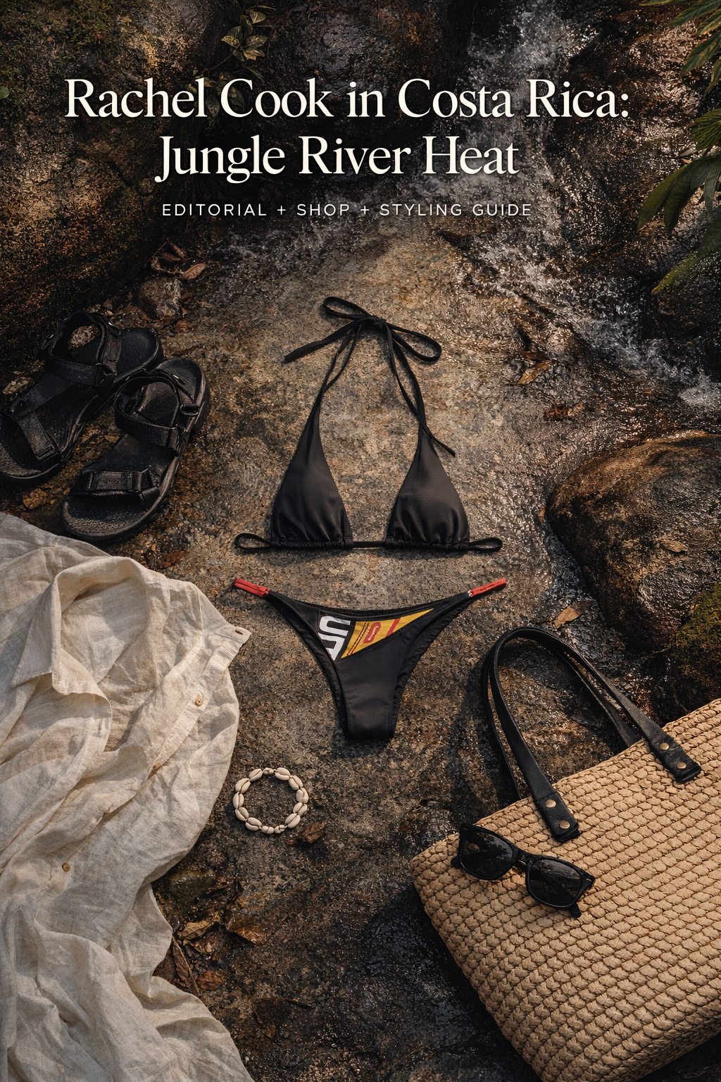 Rachel, this is the kind of swim story that feels like a secret location pin you only share with your favorite people. The setting is pure Costa Rica magic: dark volcanic rocks, a ribbon of water, mossy greens, and that low, humid light that makes every highlight look cinematic. This is a fashion editorial plus a shopping and styling guide, built to capture the exact mood and make it easy to recreate.