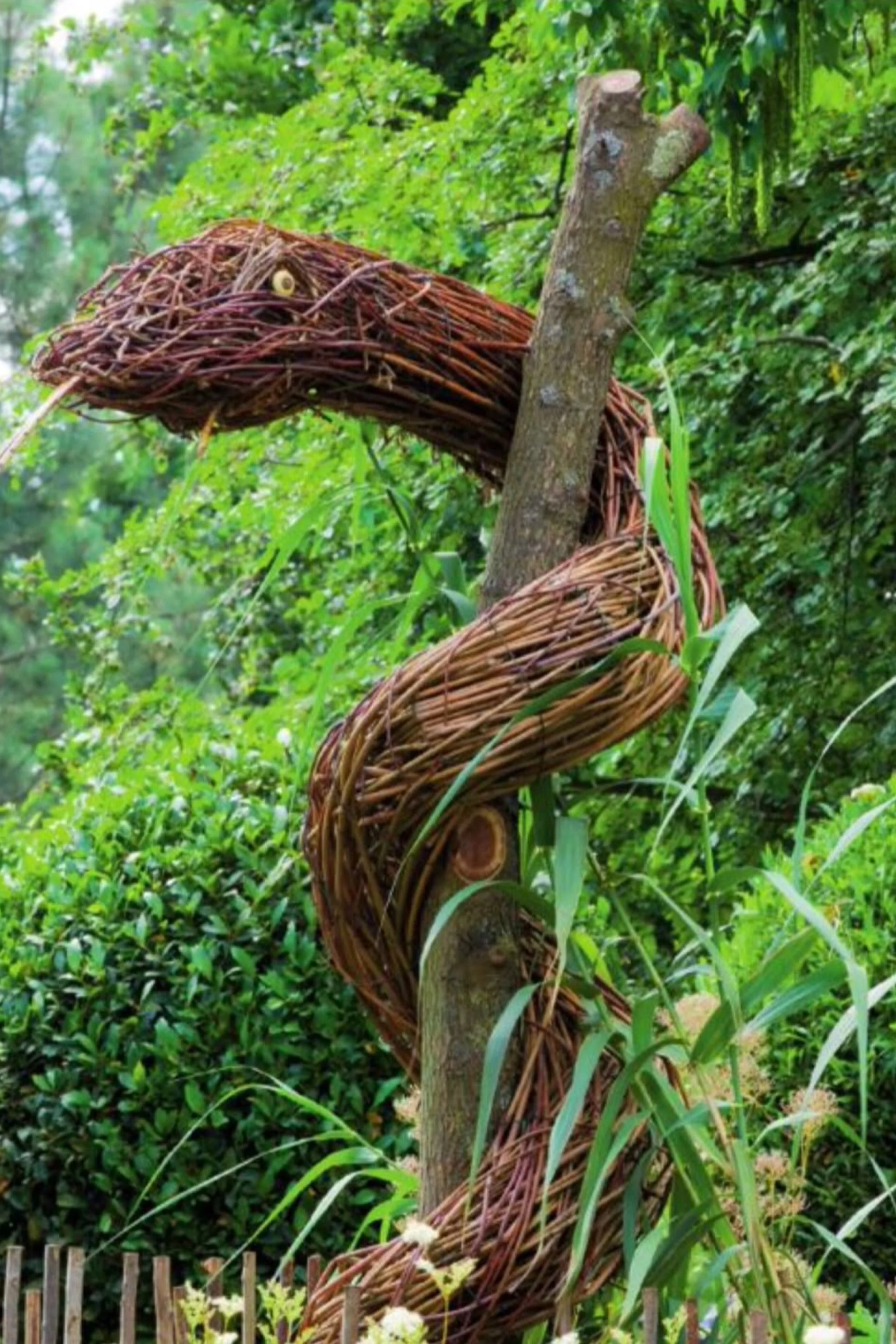 Twisting upward around a tree trunk, this willow serpent sculpture coils with hypnotic movement. The artist weaves the body in a spiral rhythm, tightening and releasing with natural flow. The serpent’s head is carefully shaped, its features subtle yet unmistakable, with a watchful gaze and an implied tongue flick. The choice of willow, flexible yet strong, makes the sculpture appear alive — a living extension of the trunk it climbs. It embodies both danger and guardianship, echoing mythologies of forest protectors and ancient symbols of wisdom. Standing amidst dense foliage, it feels as though the serpent is part of the land’s deep story, a spirit entwined with bark, branch, and leaf. Both mysterious and commanding, it brings drama to its garden setting.