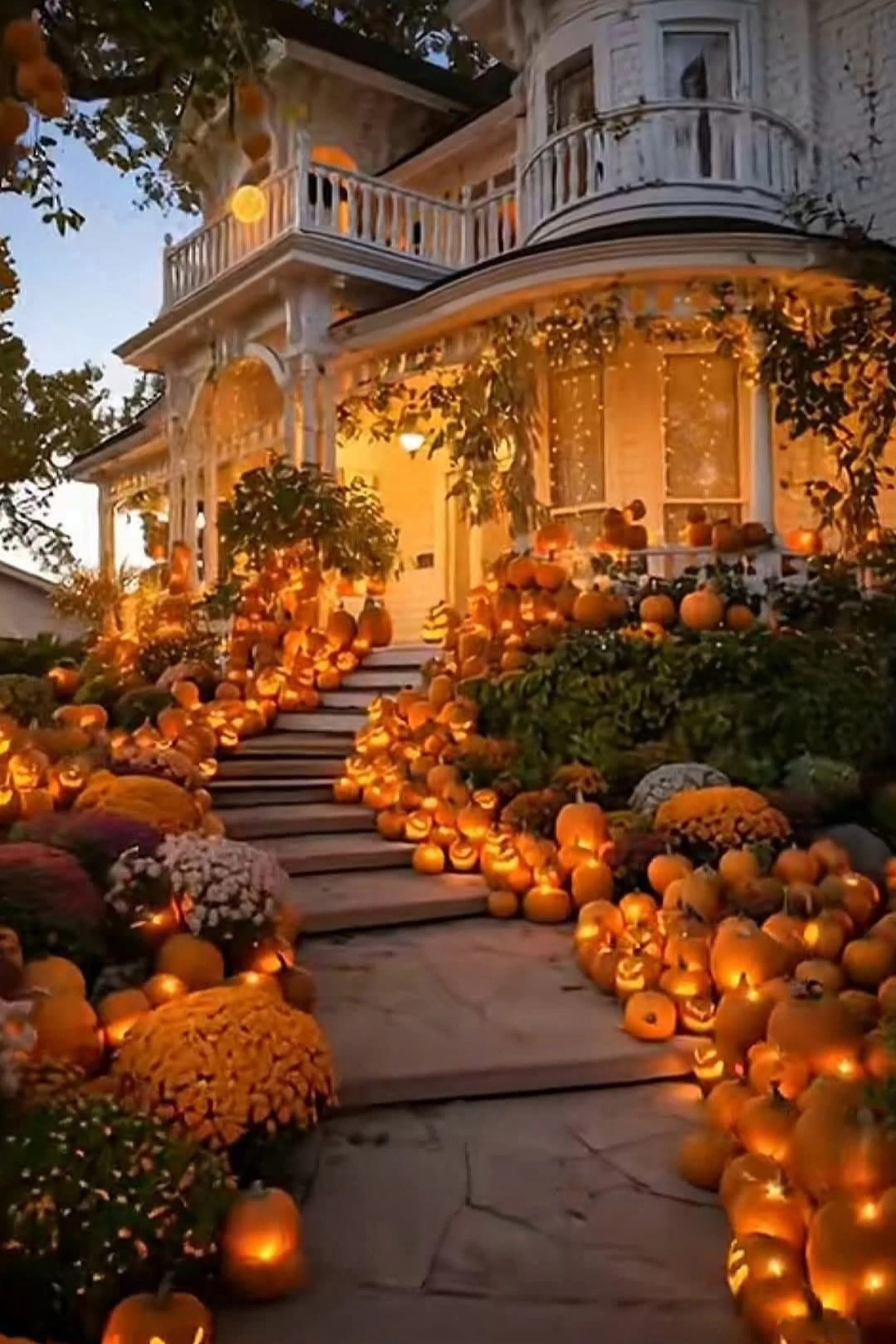 To achieve this cascading pumpkin magic, the secret lies in layering. Begin by lining both sides of your walkway with pumpkins in every size, from oversized harvest gourds to tiny minis. Carve faces into some, but leave others whole for visual depth. Add battery-operated candles to keep the glow steady and safe. Enhance the stairway with cascading mums in shades of gold, burgundy, and deep purple — their blooms echo the flames of the pumpkins. Trail leafy garlands around railings, mixing in fairy lights to create an uninterrupted river of warm illumination. For a Victorian or farmhouse feel, tuck pumpkins at different heights using crates or hay bales. Finally, don’t be afraid to go big with numbers: the sheer abundance is what creates the breathtaking effect. Remember, this design thrives on excess — the more pumpkins, the more haunted grandeur you will create.