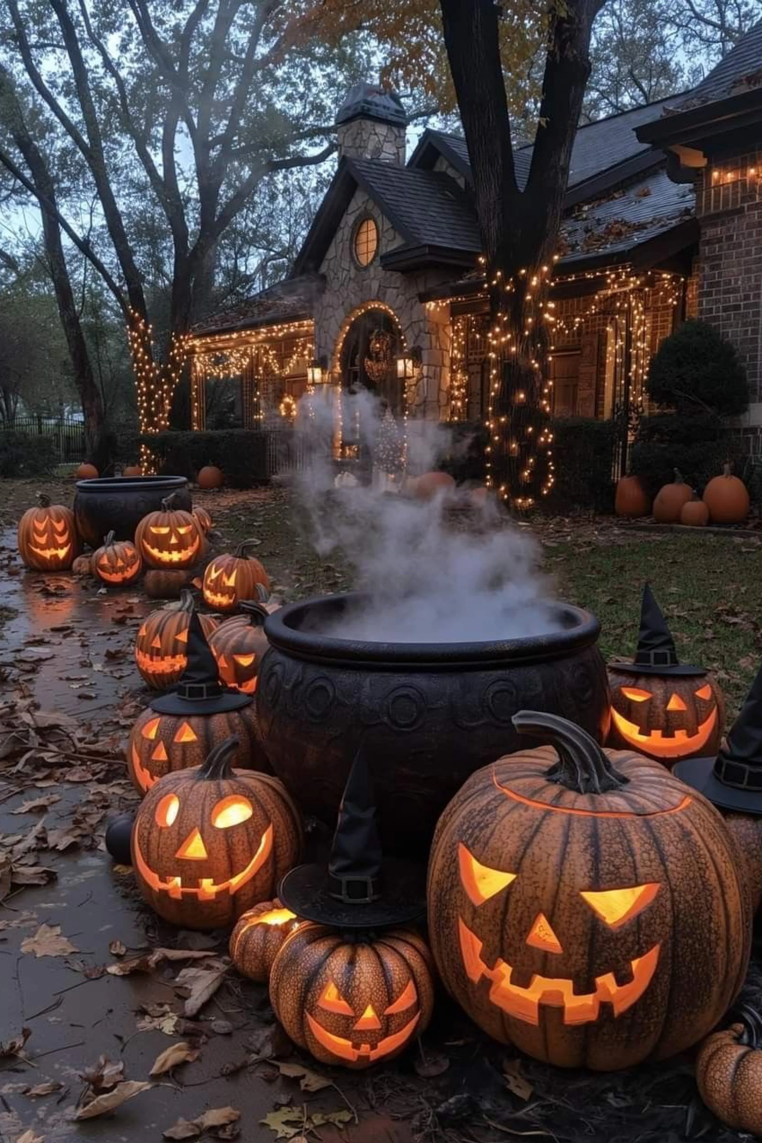 The second path is less inviting and more bewitching, with oversized cauldrons bubbling in a haze of eerie fog. Carved jack-o’-lanterns line the walkway, their jagged smiles glowing in rhythm with the swirling mist. Some wear pointed witch hats, their tilted brims suggesting that a coven has been here, stirring mischief long after midnight. The house itself, wrapped in golden string lights, feels like the keeper of a thousand secrets. The mix of carved faces and theatrical fog transforms the scene from a simple pumpkin path into a witch’s ritual corridor, preparing trick-or-treaters for the kind of magic where tricks outweigh the treats. It is enchanting but unsettling — a vision of Halloween’s darker charm.
