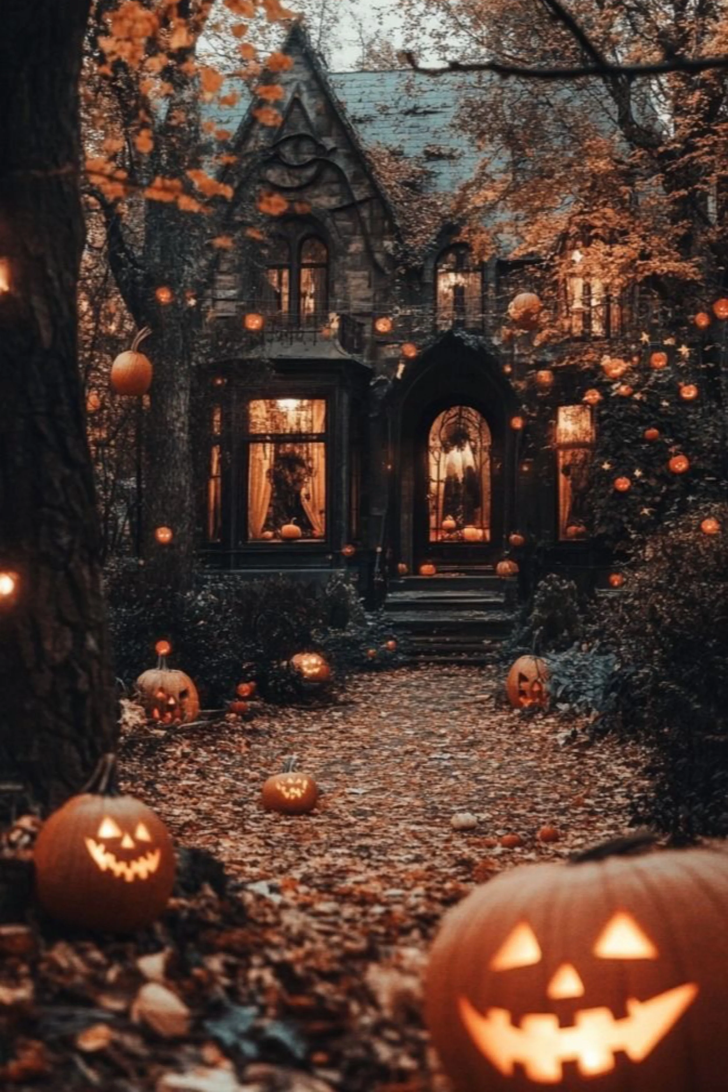This path is wrapped in autumn’s golden blanket, with fiery leaves crunching underfoot and jack-o’-lanterns glowing from the edges like guardians of the season. The walkway is a glowing river of amber, reds, and golds, each pumpkin flickering against the fallen leaves. Twinkling fairy lights line the edges, as though guiding souls home for Halloween night. The rustic wooden porch at the end completes the invitation, glowing warmly with garlands and wreaths. This scene leans less on fright and more on the magic of fall itself — the kind of haunting that stirs nostalgia, comfort, and a playful sense of mischief in equal measure.