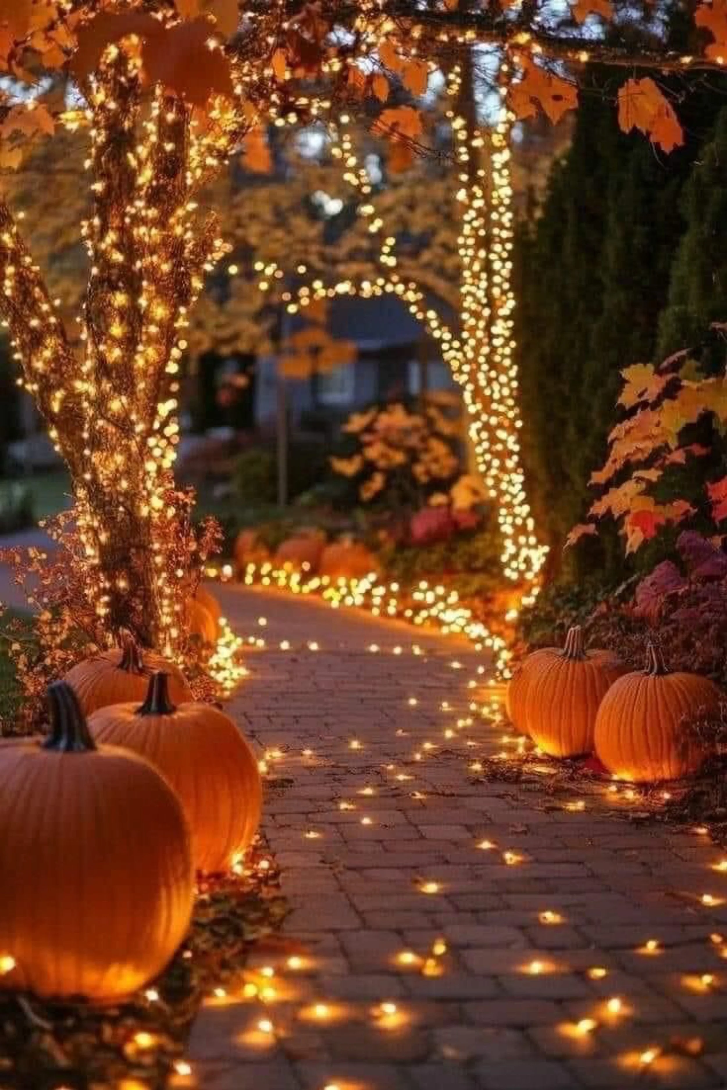 This porch is drenched in cascading twinkle lights, creating the illusion of stepping into a magical cave of stars. Pumpkins line the steps and corners, their warm glow echoing the firefly brilliance above. Soft floral arrangements rest in rustic pots, giving the space a balance of spooky and sweet. The pathway feels like entering a fairytale haunted by light — less fear, more wonder. It invites trick-or-treaters into a glowing tunnel that feels both festive and enchanted.