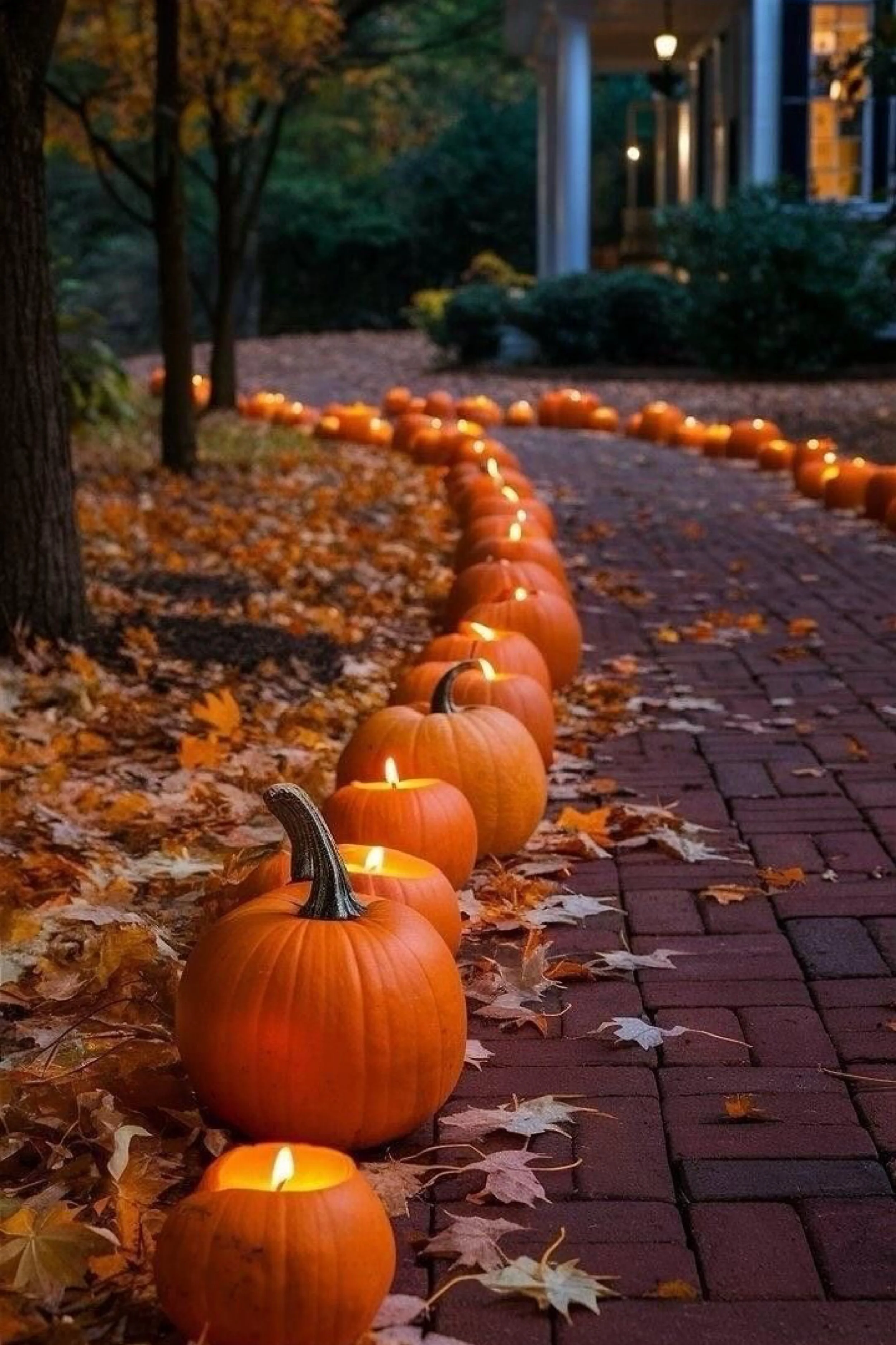 A winding brick path is lined with glowing jack-o’-lanterns, stretching like a trail of fire through fallen leaves. The pumpkins, set close together, create a glowing border that feels like a runway to another realm. The leaves crunch underfoot, the air is cool, and the shadows dance with every flicker of flame. The design is simple but mesmerizing — a minimalist take on Halloween path styling that relies on repetition and rhythm. The hypnotic line of orange glow creates suspense with every step.