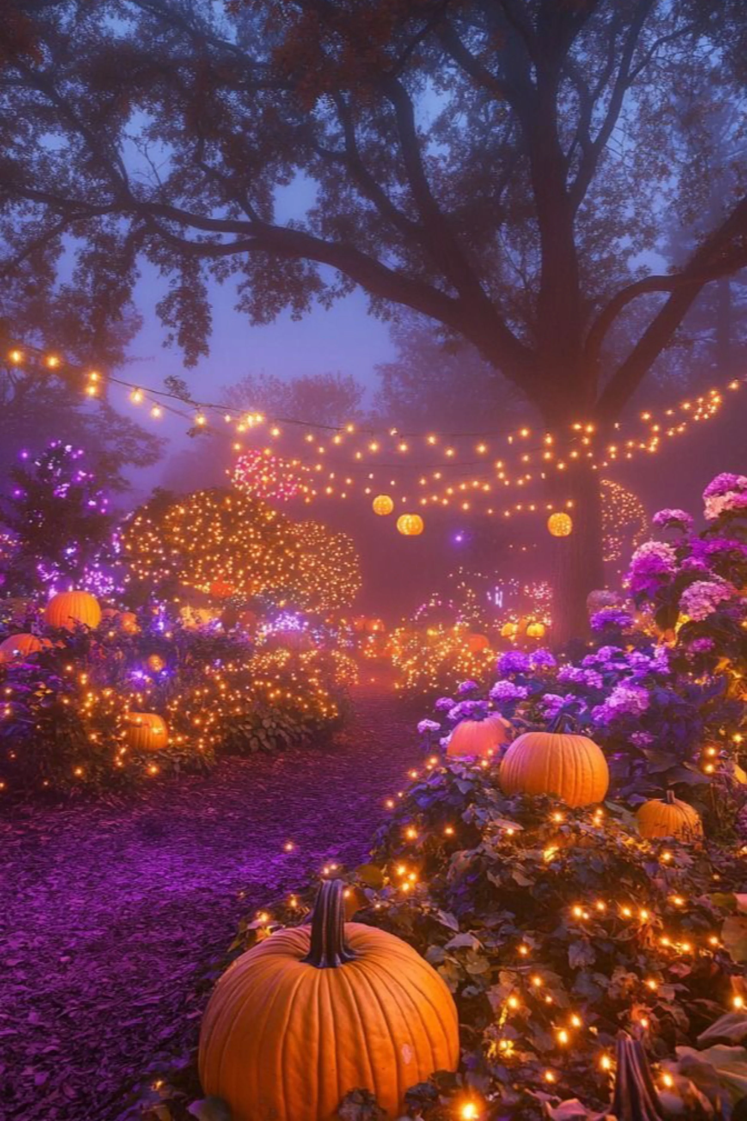 This path feels like stepping into a glowing forest where spirits hide among the trees. Trunks and branches are tightly wrapped with golden lights, creating a canopy of shimmer above. Pumpkins rest along the walkway and at the roots of the trees, their flickering faces echoing the stars overhead. The ground itself seems alive, scattered with strands of fairy lights that sparkle like embers beneath fallen leaves. The scene is equal parts magical and eerie — as though the forest itself is alive and whispering to those who pass through. Trick-or-treaters walking here will feel both charmed and cautious, caught between beauty and haunting presence.