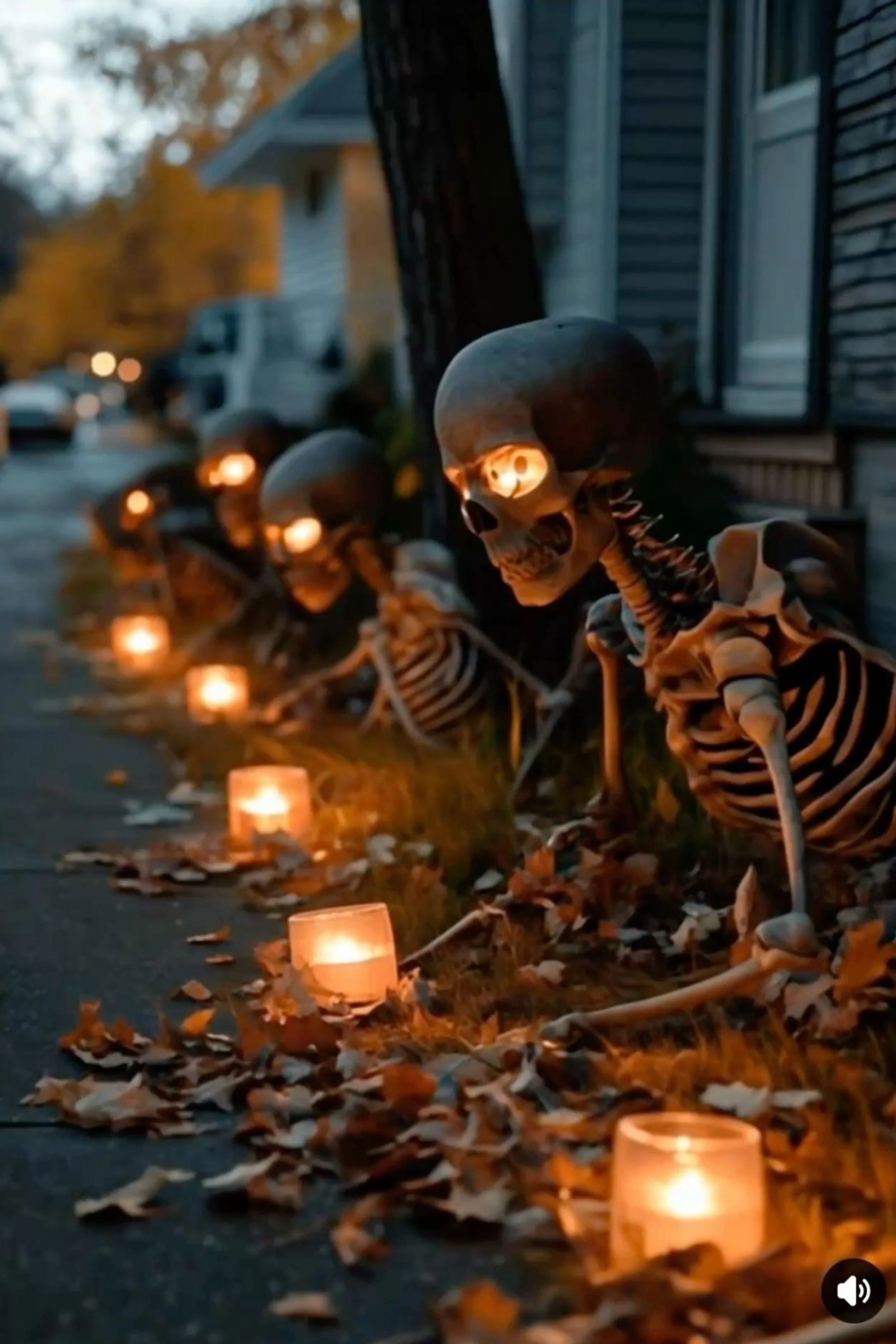 Here, the path is haunted by a row of skeletal guardians crawling from the earth. Their hollow eyes glow with flickering candlelight, each skull angled toward the passersby as though tracking their every move. Candles in glass jars line the path, their flames dancing in the autumn air, reflected in bone-white grins. Fallen leaves complete the eerie frame, crunching underfoot as visitors pass. This display captures Halloween at its spookiest: playful yet unsettling, whimsical yet deeply haunting. The skeletons seem ready to crawl forward at any moment, creating just enough fear to make guests quicken their steps toward the door.