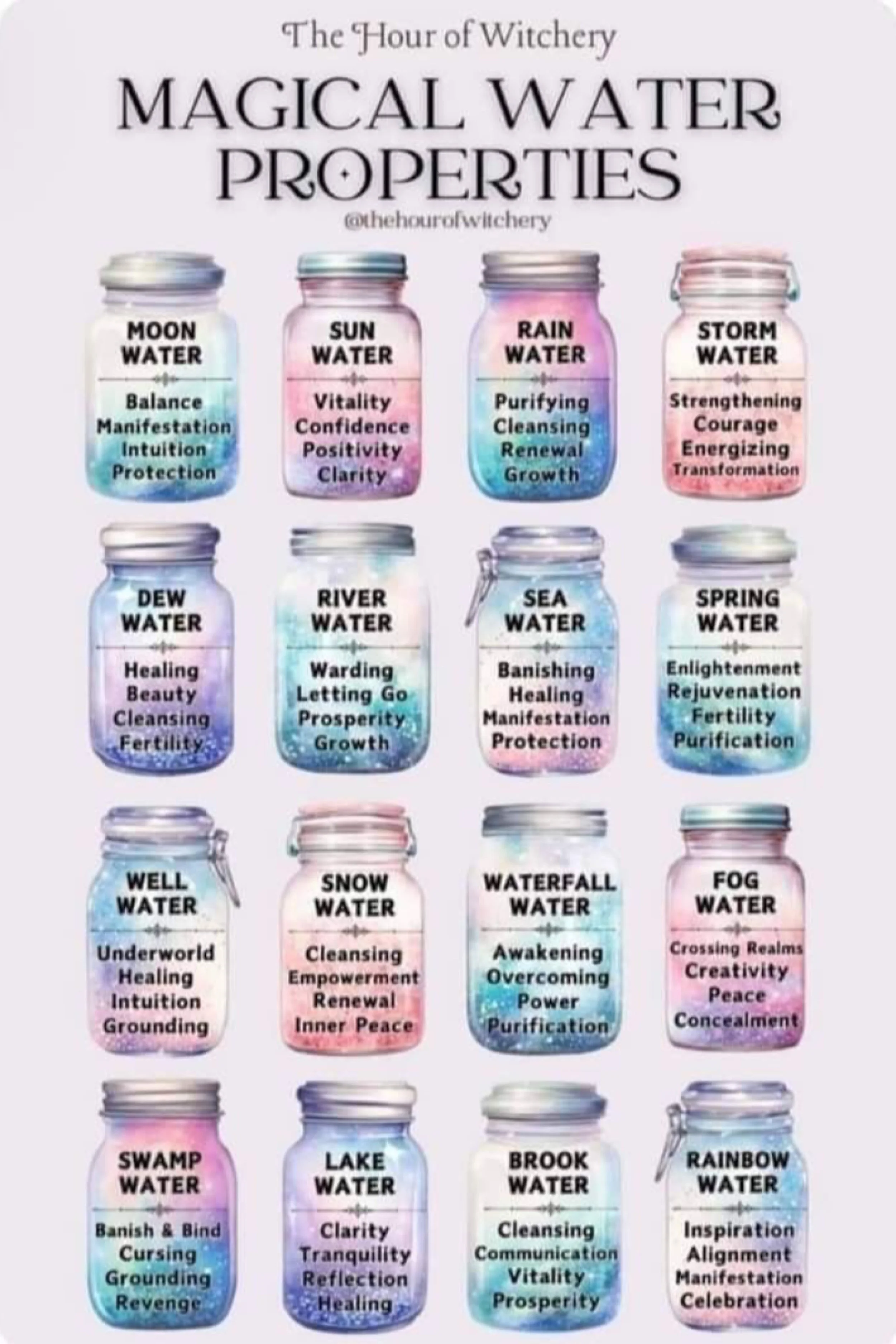 The chart of Magical Water Properties offers a beautiful snapshot of the spiritual gifts carried by different waters. Today, we’ll dive deep into these categories, exploring their uses, their unique energies, and how you can bring them into your own magical practice. Along the way, we’ll pair each type with practical tools, altar décor, and ritual accessories you can easily add to your space.