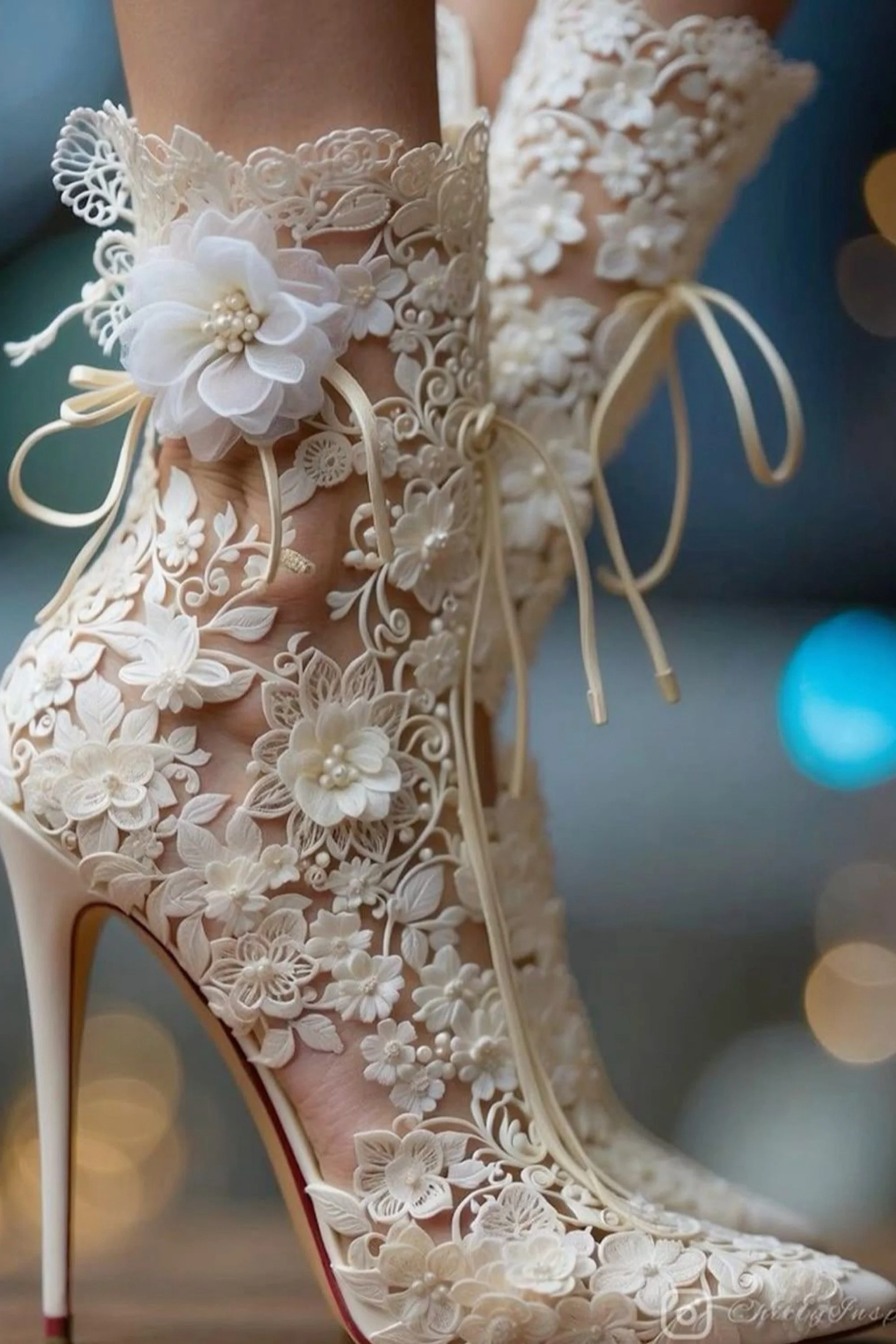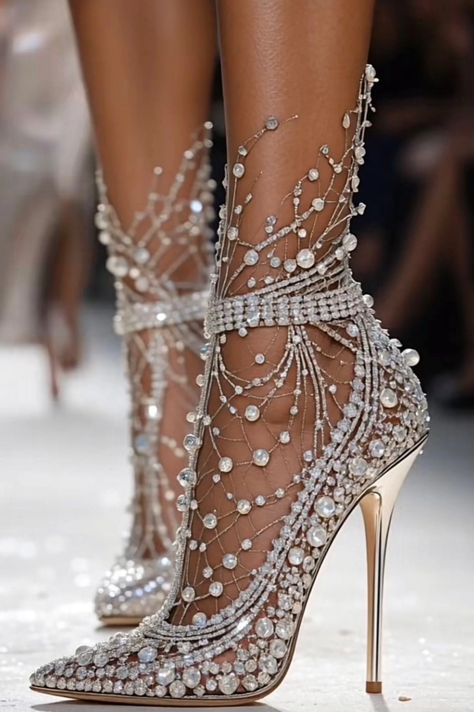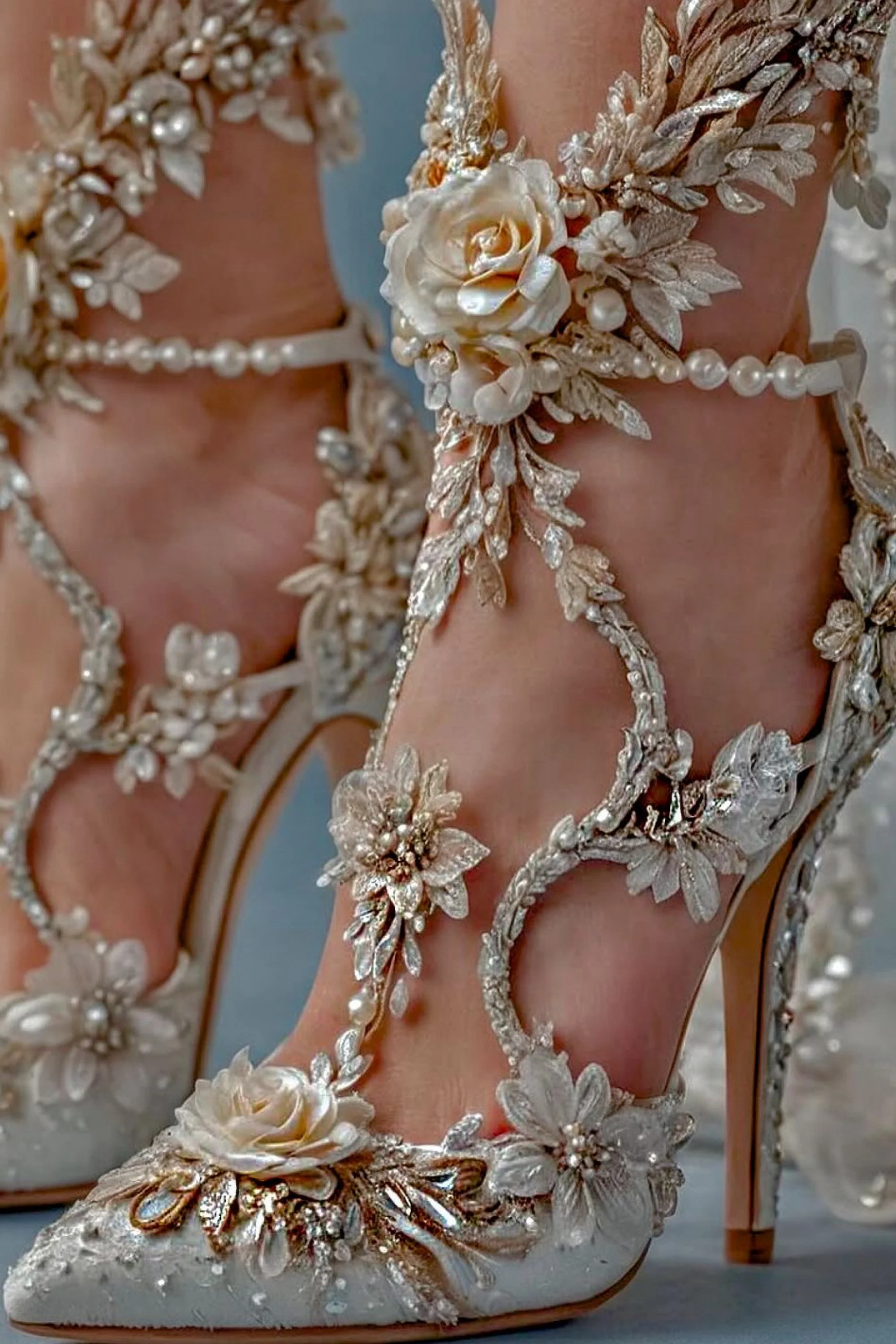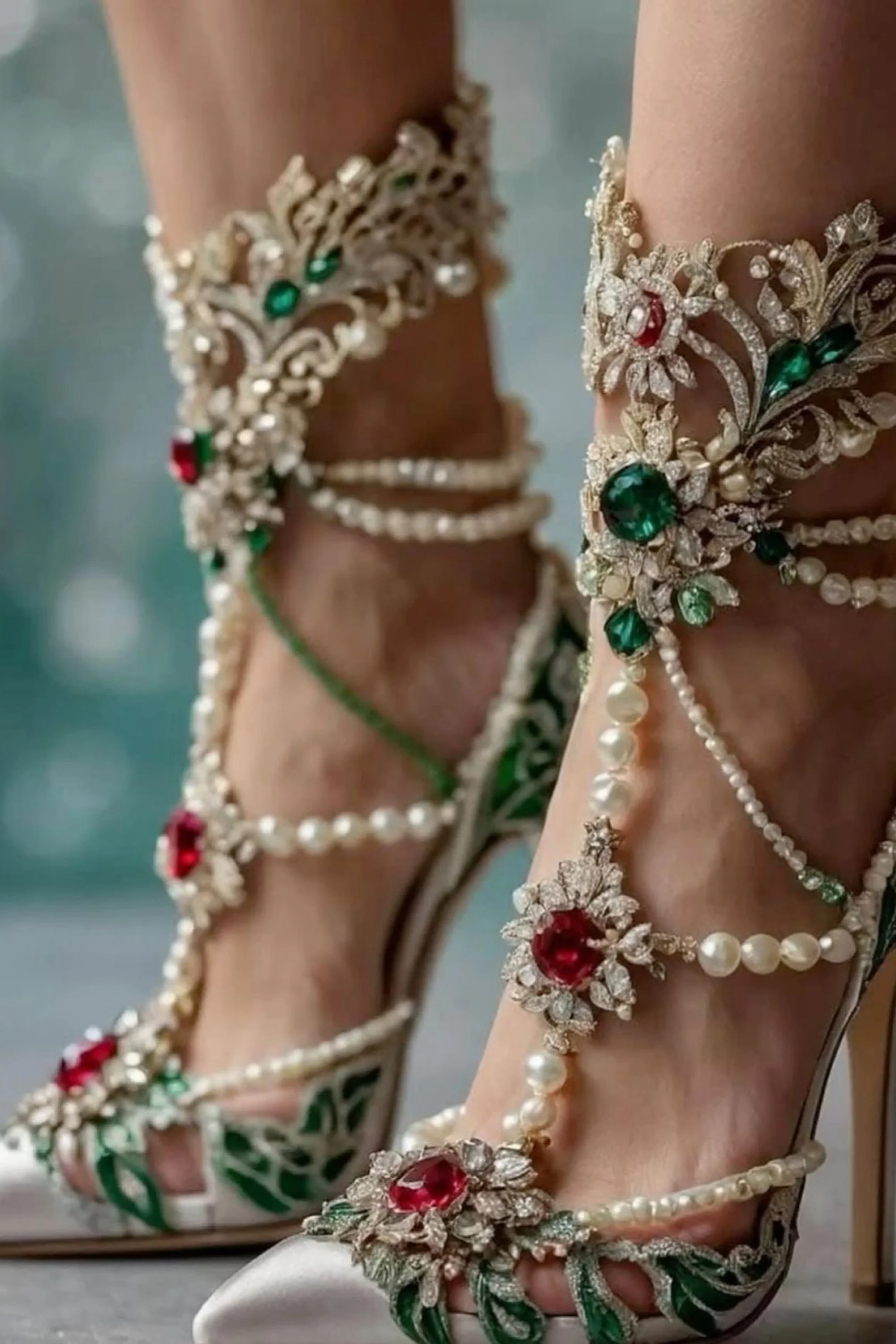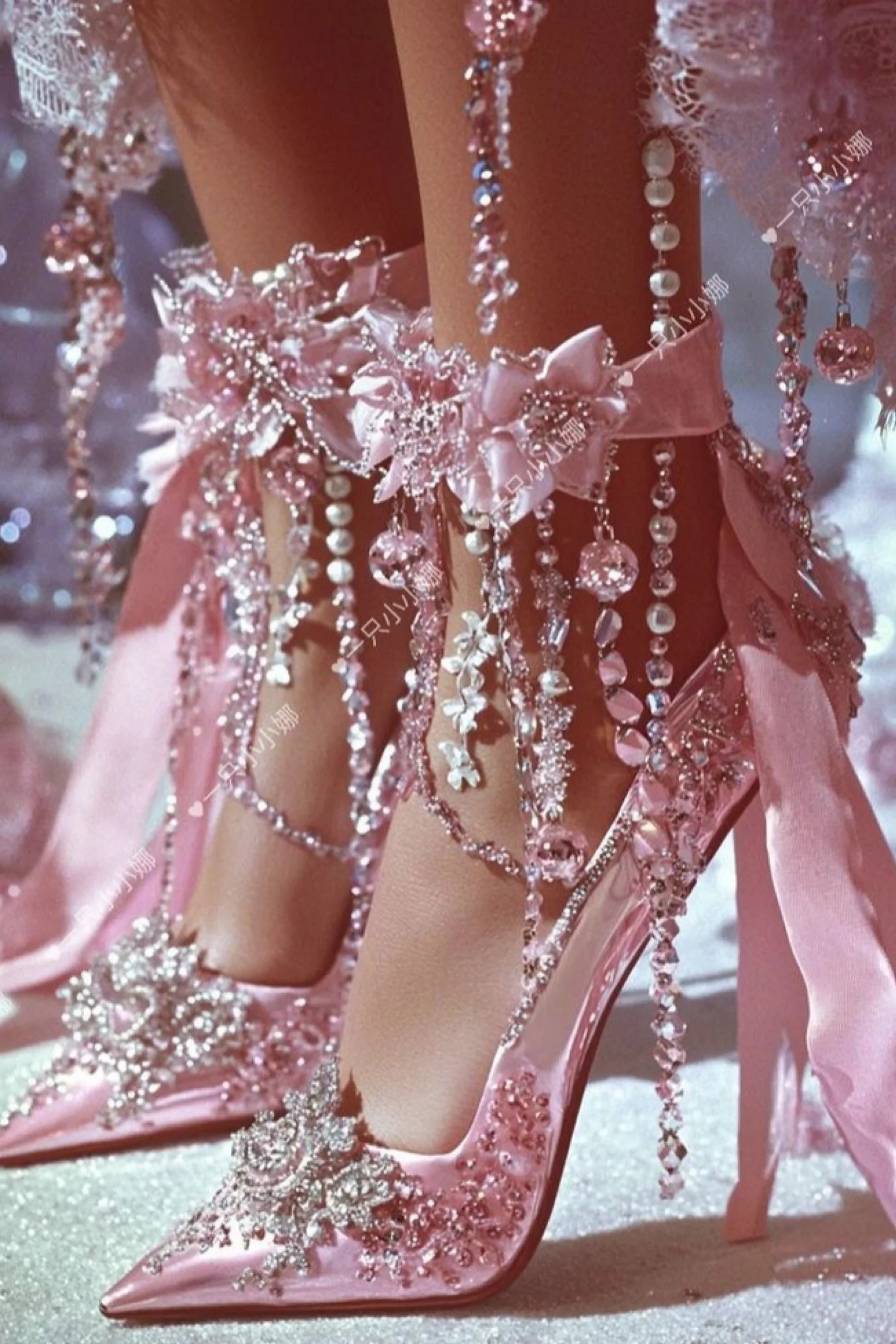 Around her ankles coiled garlands of gem-encrusted blossoms, from which pearl droplets swayed like tiny moons caught in mid-fall. Each step made them tremble, sending pale light gliding over her skin. The heels themselves—slender yet strong—twisted like stems wrapped in vines, culminating in tiny crystal buds at the base, leaving behind glints of white fire with every footfall.