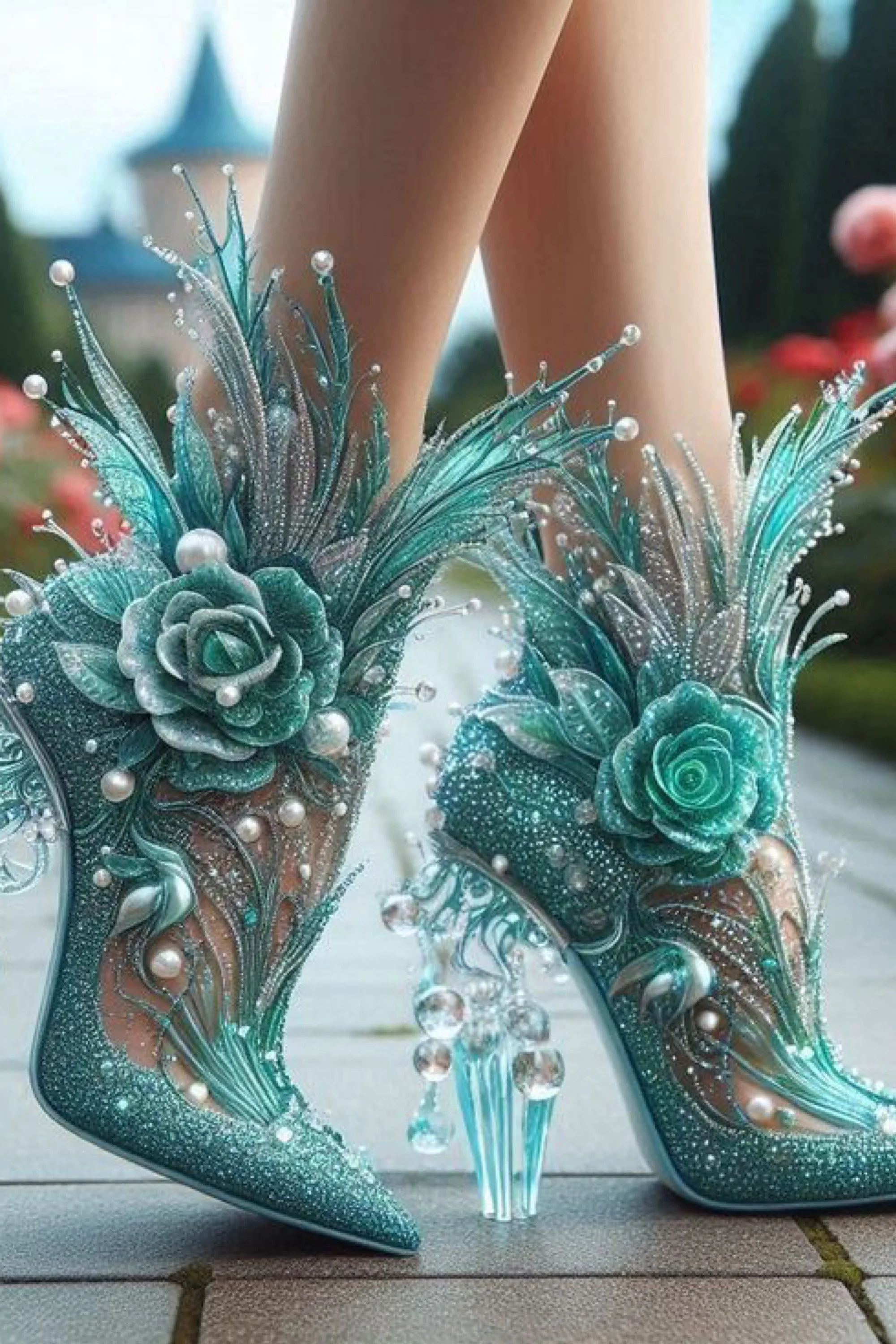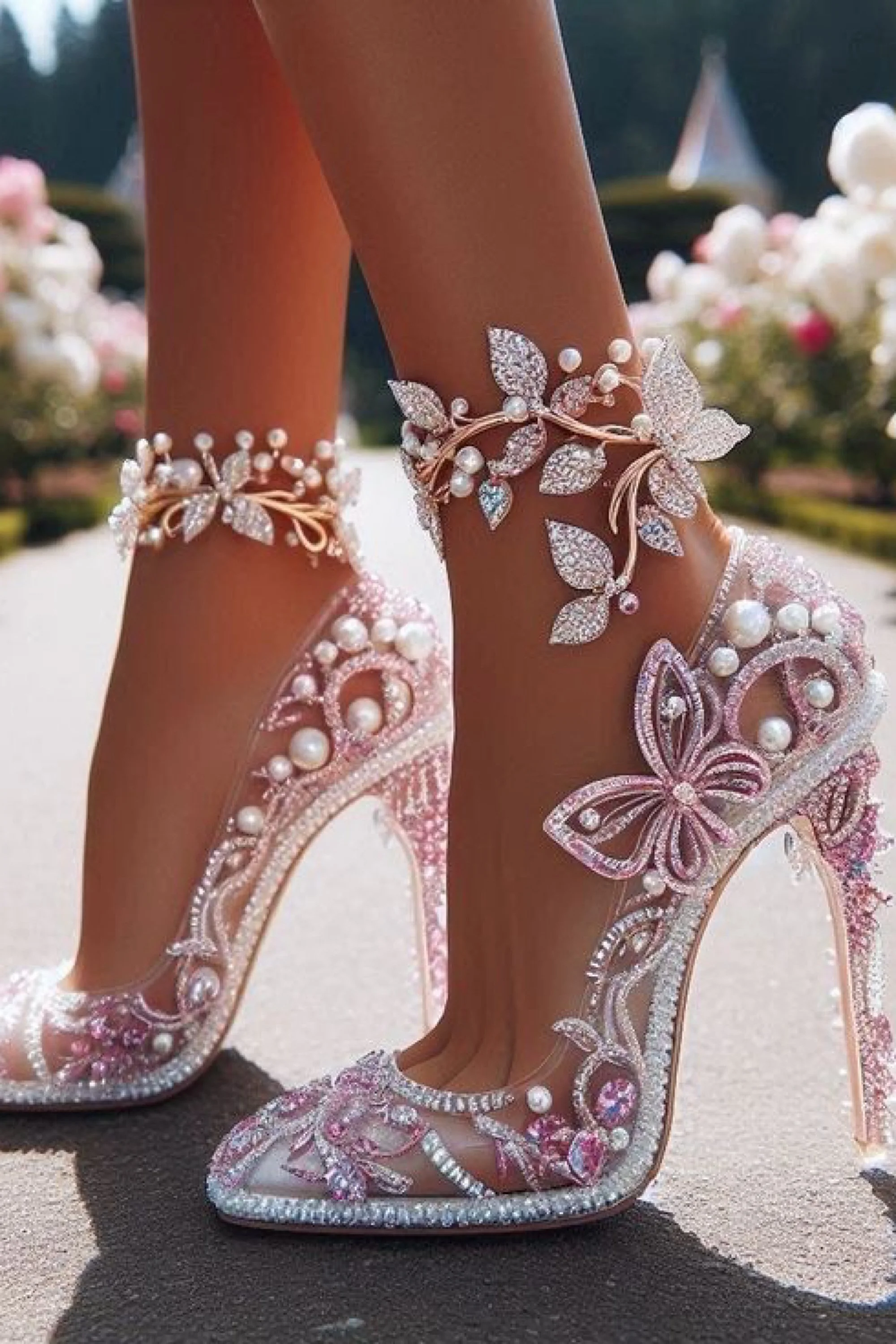 The heels she wore were unlike anything the court had ever seen—a masterpiece known only in hushed tales as The Garden of Glass and Pearl. Their translucent structure was traced with threads of rose-gold, curling like vines around her foot, each adorned with dew-like pearls that caught the sun and sent soft halos of light across the cobblestones. Pink sapphires bloomed in floral patterns across the toes, while delicate butterflies—carved from crystal and kissed with blush enamel—rested at the heels, as if pausing mid-flight.