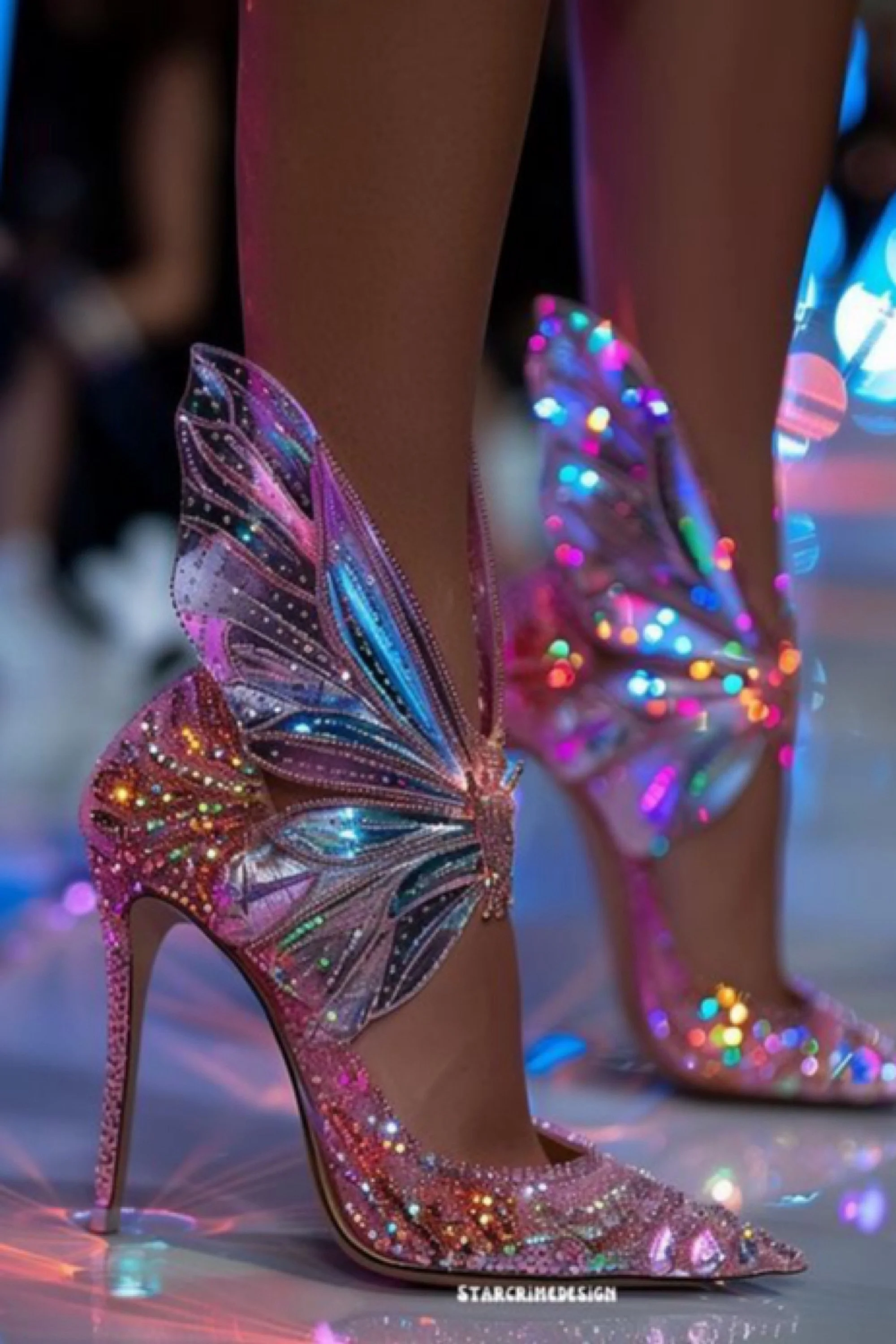 The Prismwing Heels were the work of a designer whispered about but rarely seen. Each shoe curved into a pointed toe, drenched in micro-crystals that pulsed in shifting pinks, violets, and blues. From the sides, great butterfly wings unfurled in metallic iridescence, their filigree veins traced in glittering beadwork. Under the ballroom’s kaleidoscope lighting, the wings didn’t just glow—they seemed to move, flexing with her every step as though some enchantment kept them alive.